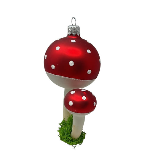 Pair of Red Toadstool Mushrooms with Moss Polish Glass Christmas Tree Ornament