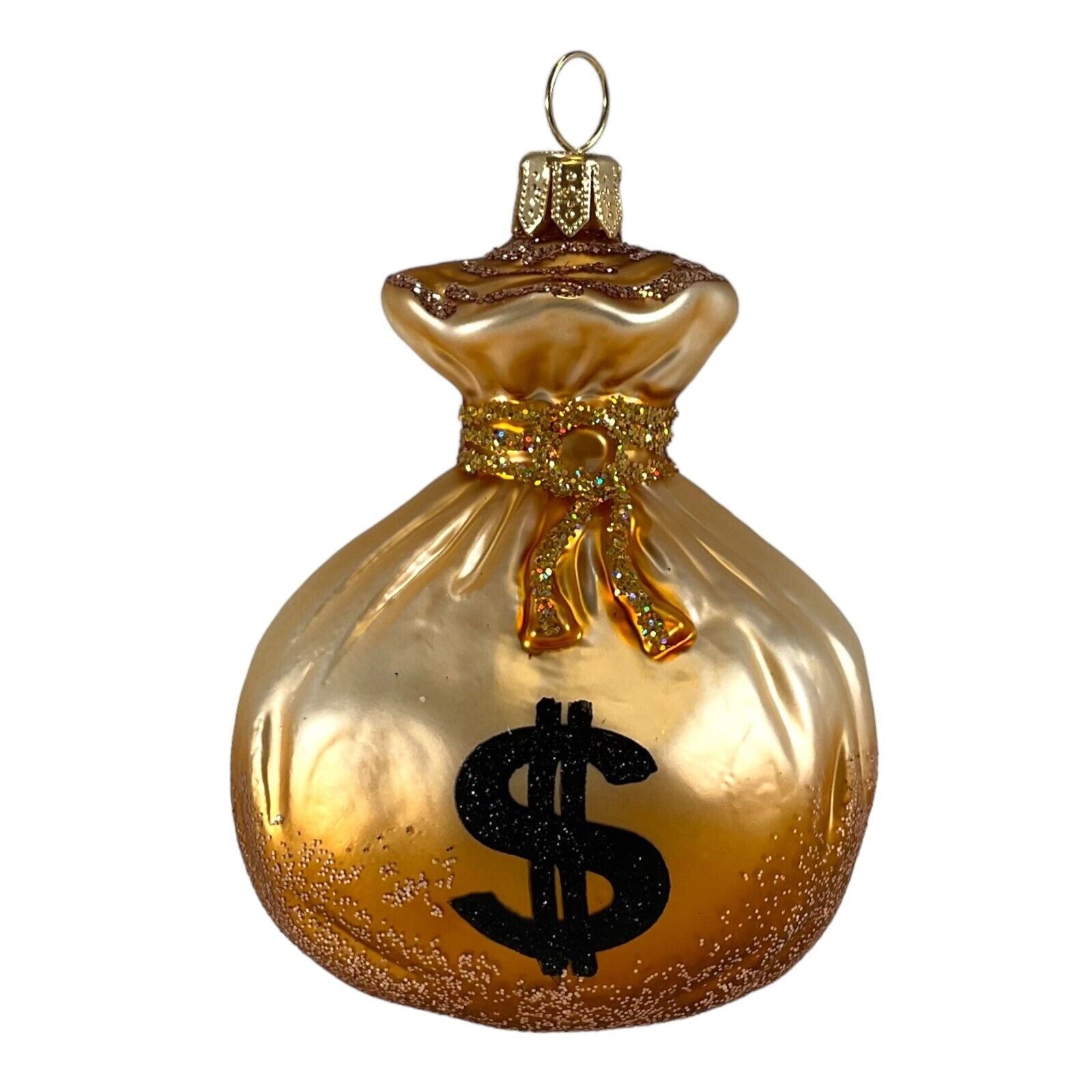 Bag of Money Ornament. Handcrafted in Poland. Hand painted by Polish artisans. Made from mouth blown glass. Approximately 3 inches tall (8 cm). Includes original Pinnacle Peak Trading box and packaging. Imported by Pinnacle Peak Trading Company.