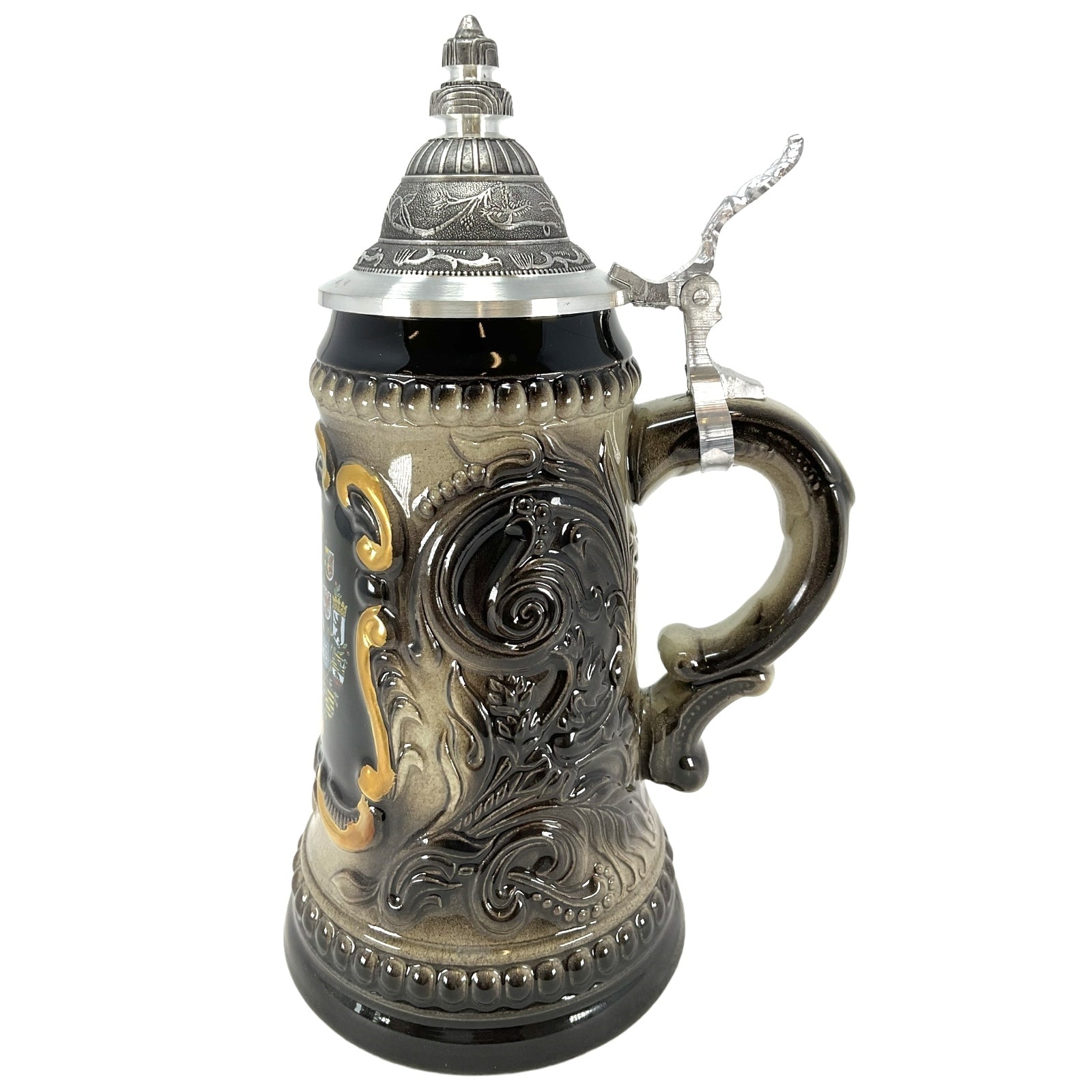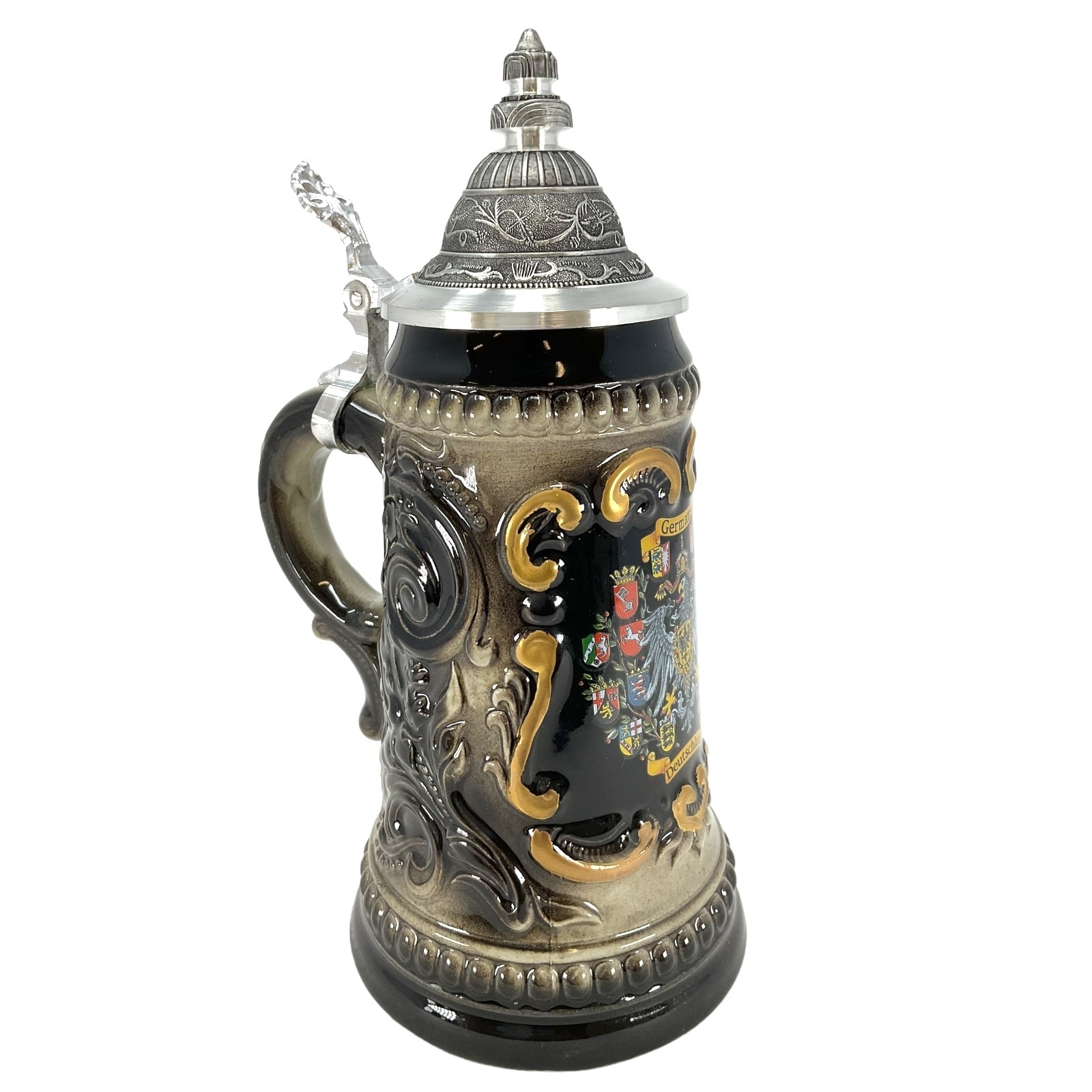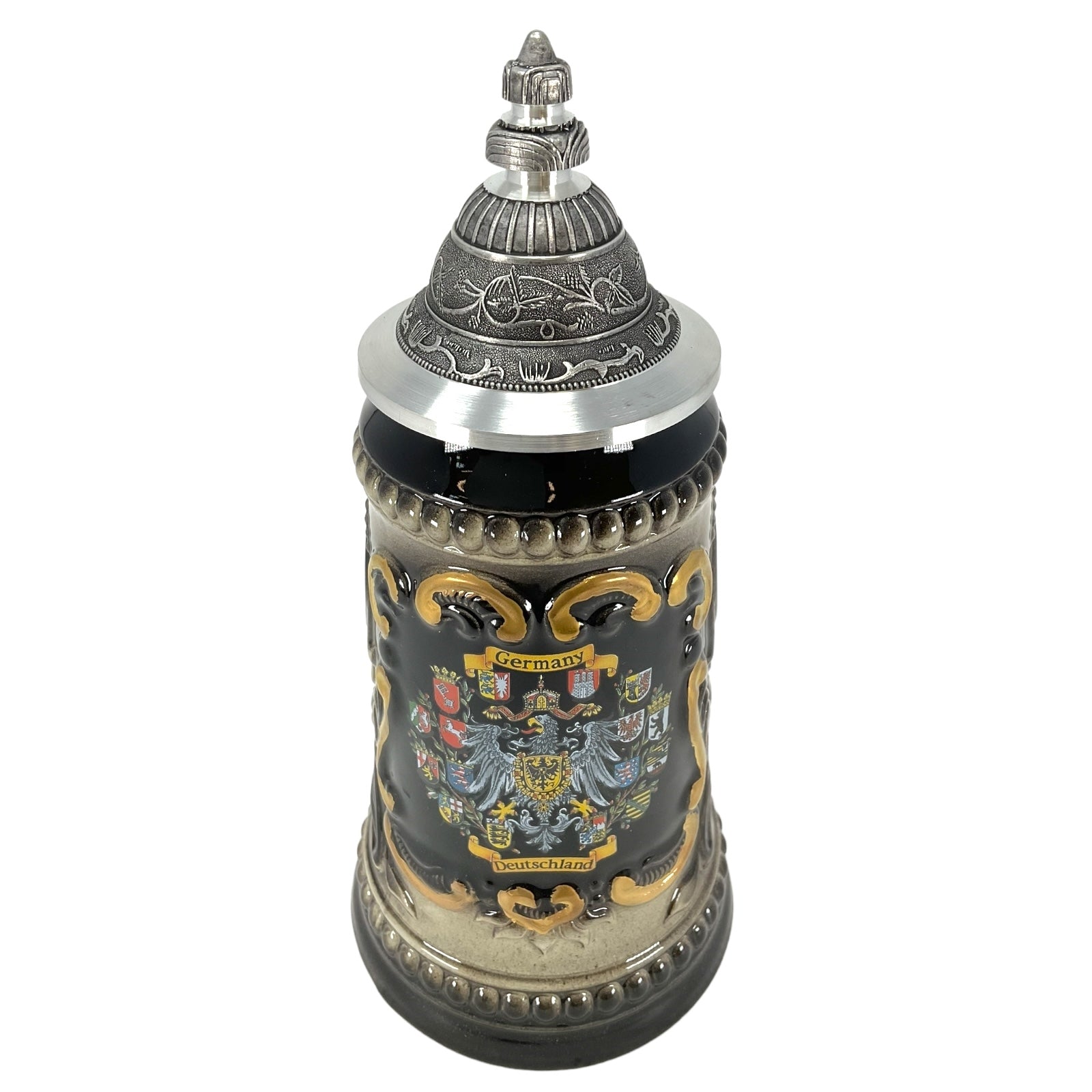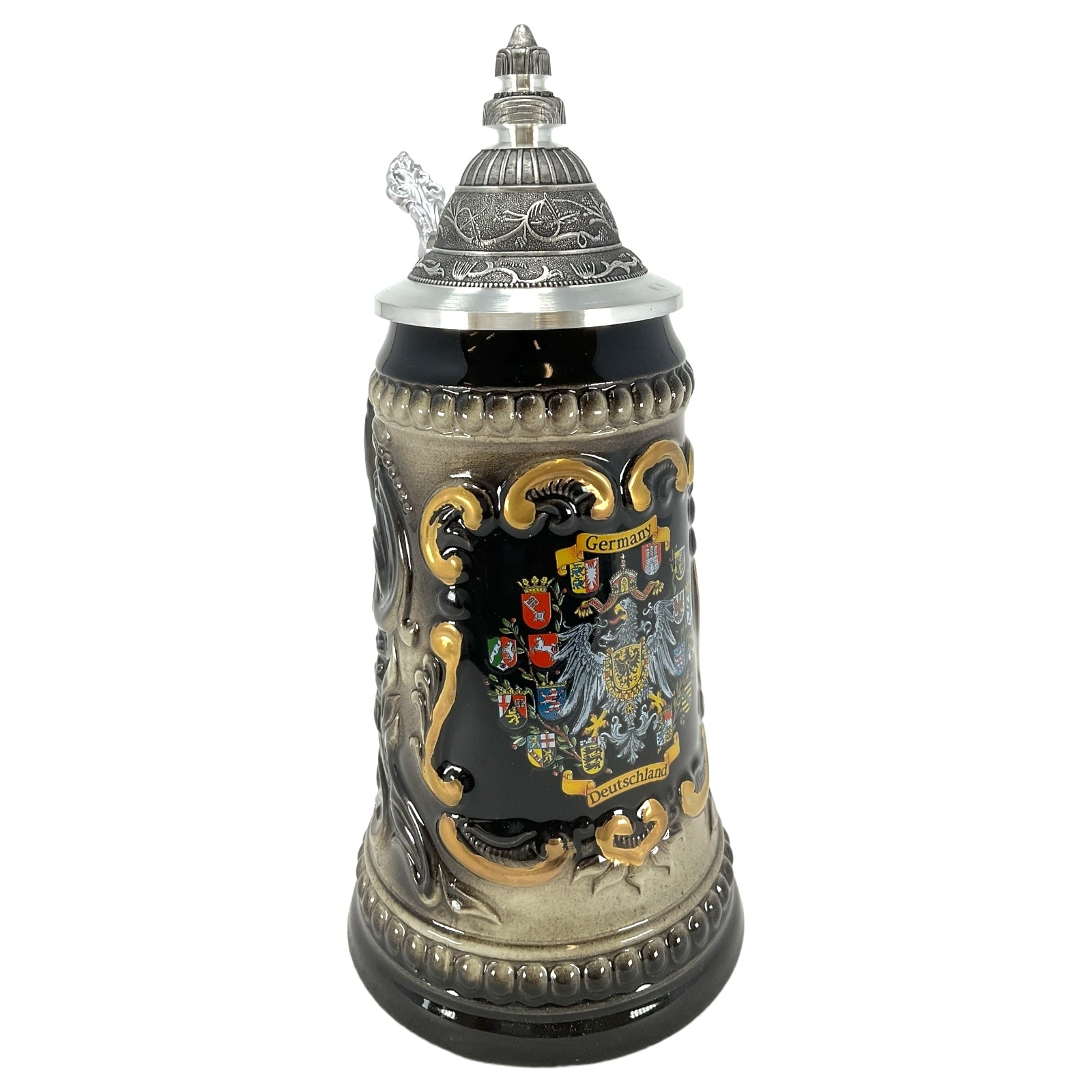 - This black beer stein features a Deutschland Germany eagle surrounded by German city shields.
