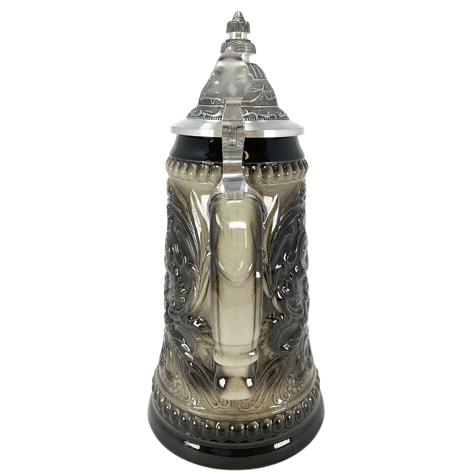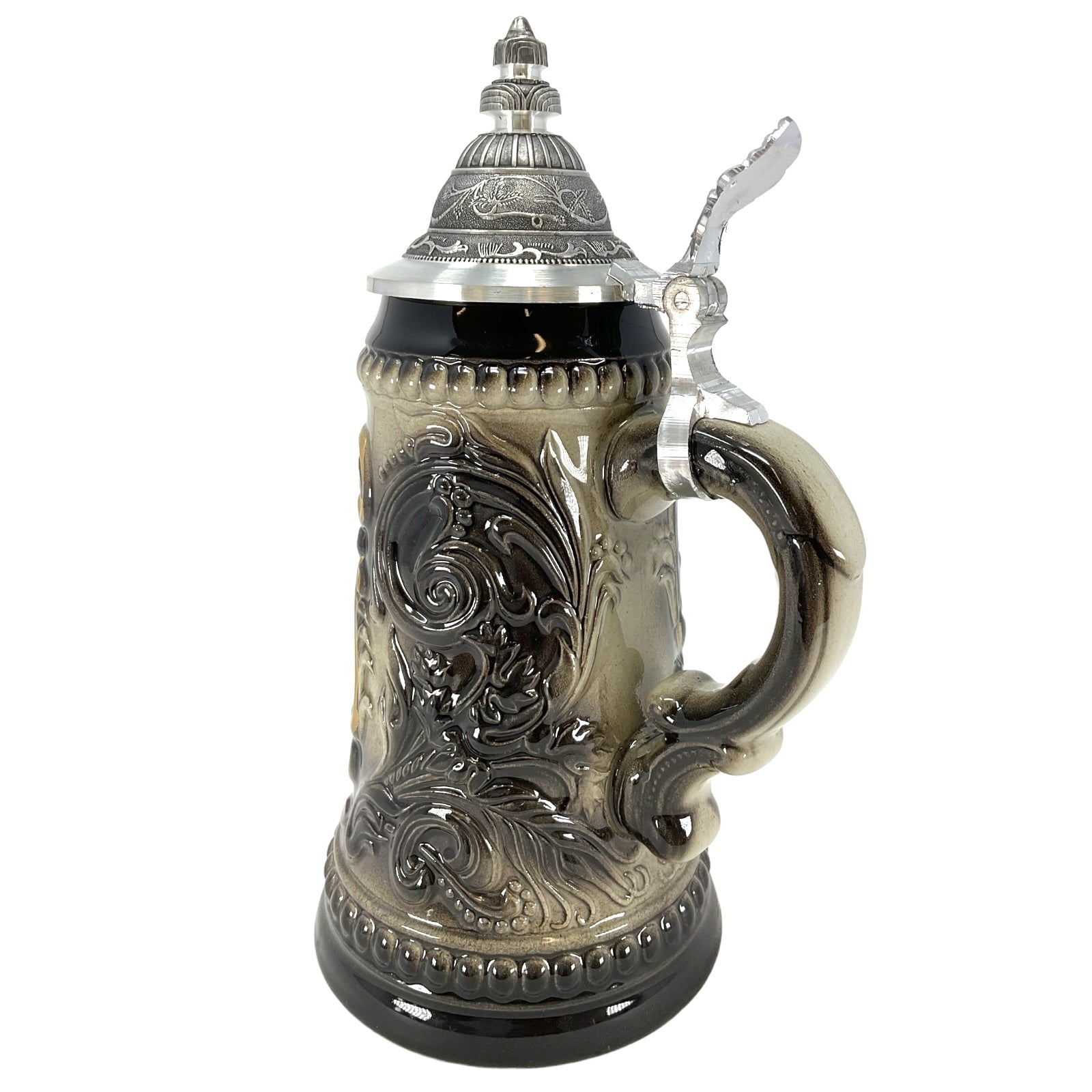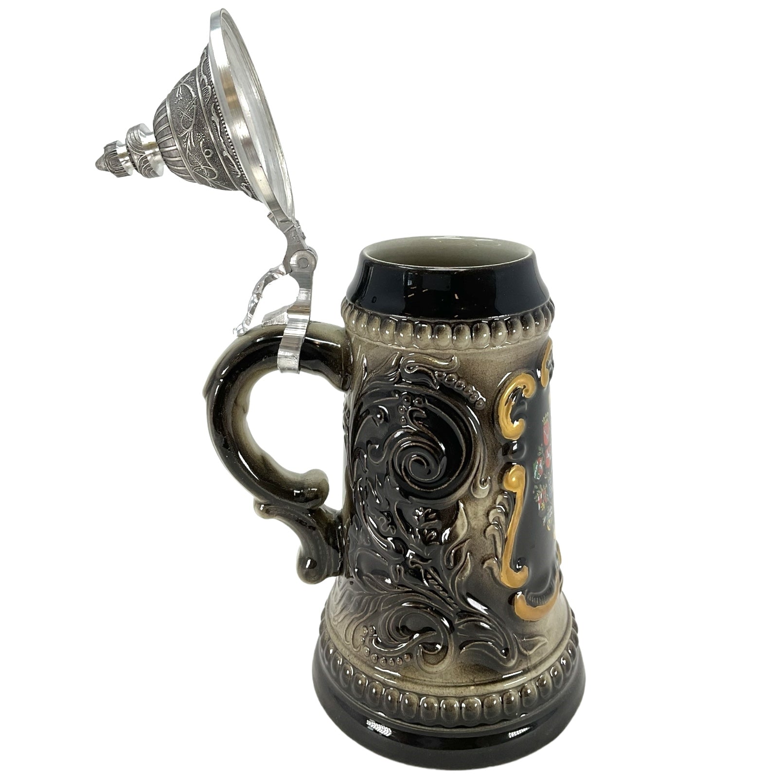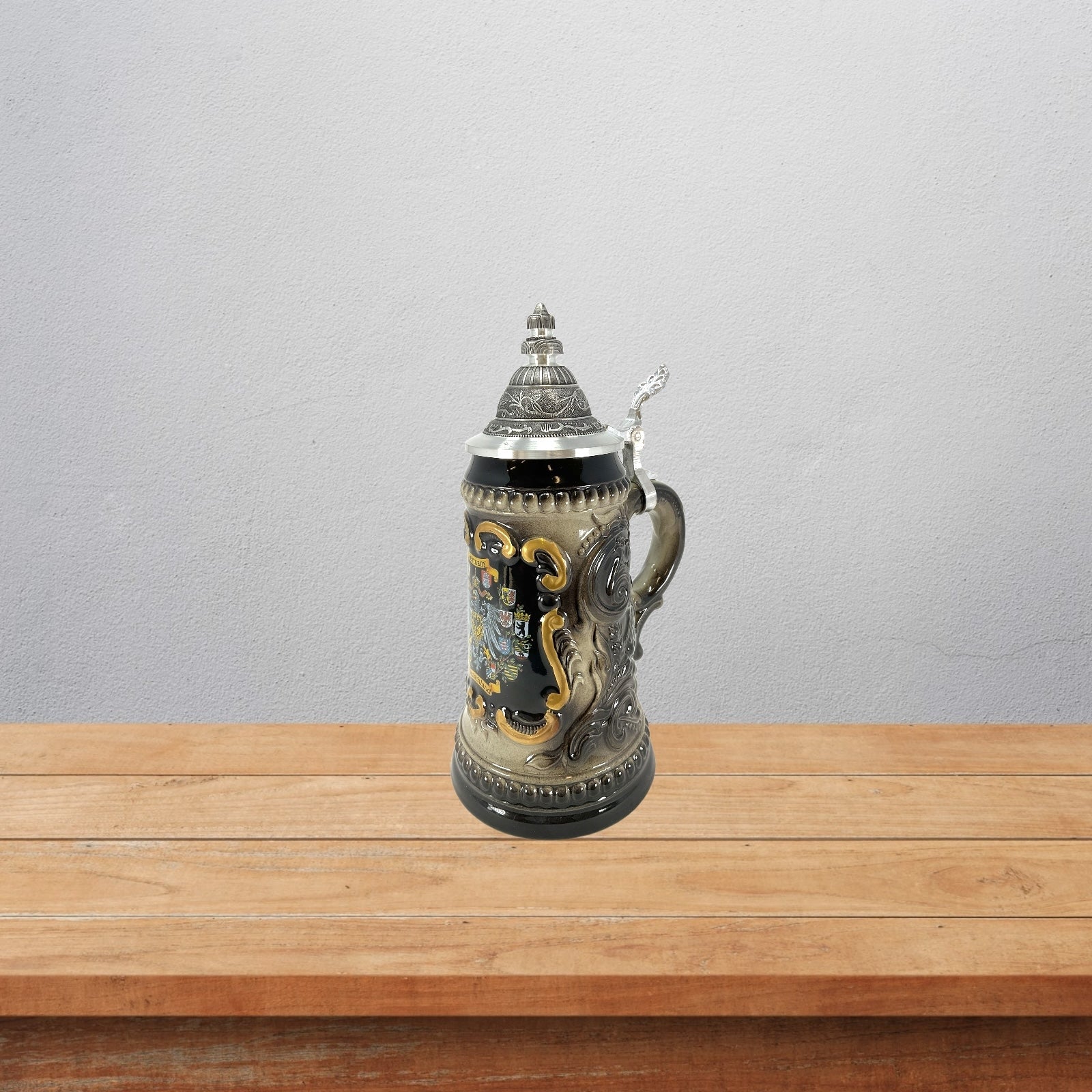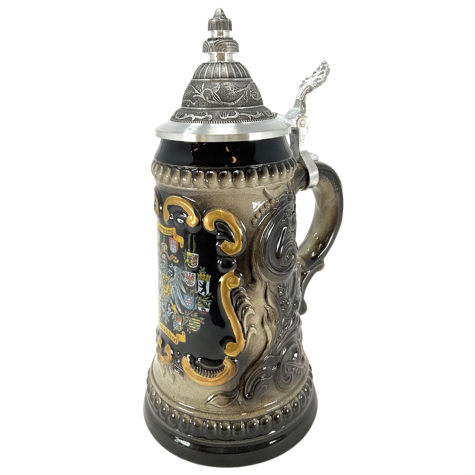 - This black beer stein features a Deutschland Germany eagle surrounded by German city shields.