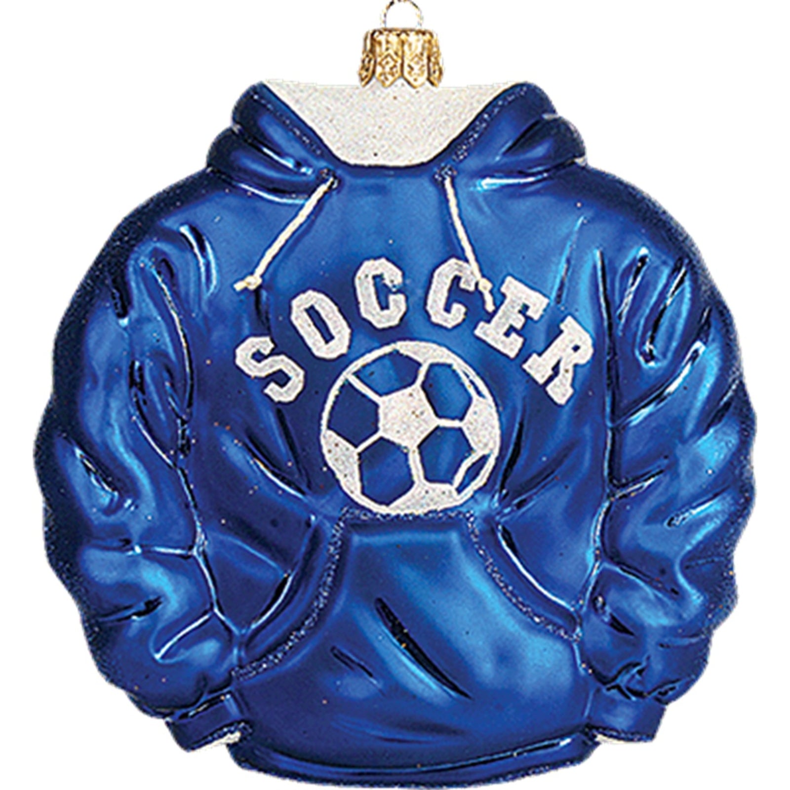 Soccer Hoodie Ornament. Handcrafted in Poland. Hand-painted by Polish artisans. Made from mouth blown glass. Approximately 4 inches tall (10cm). Includes original manufacturers box and packaging. Imported by Pinnacle Peak Trading Company.