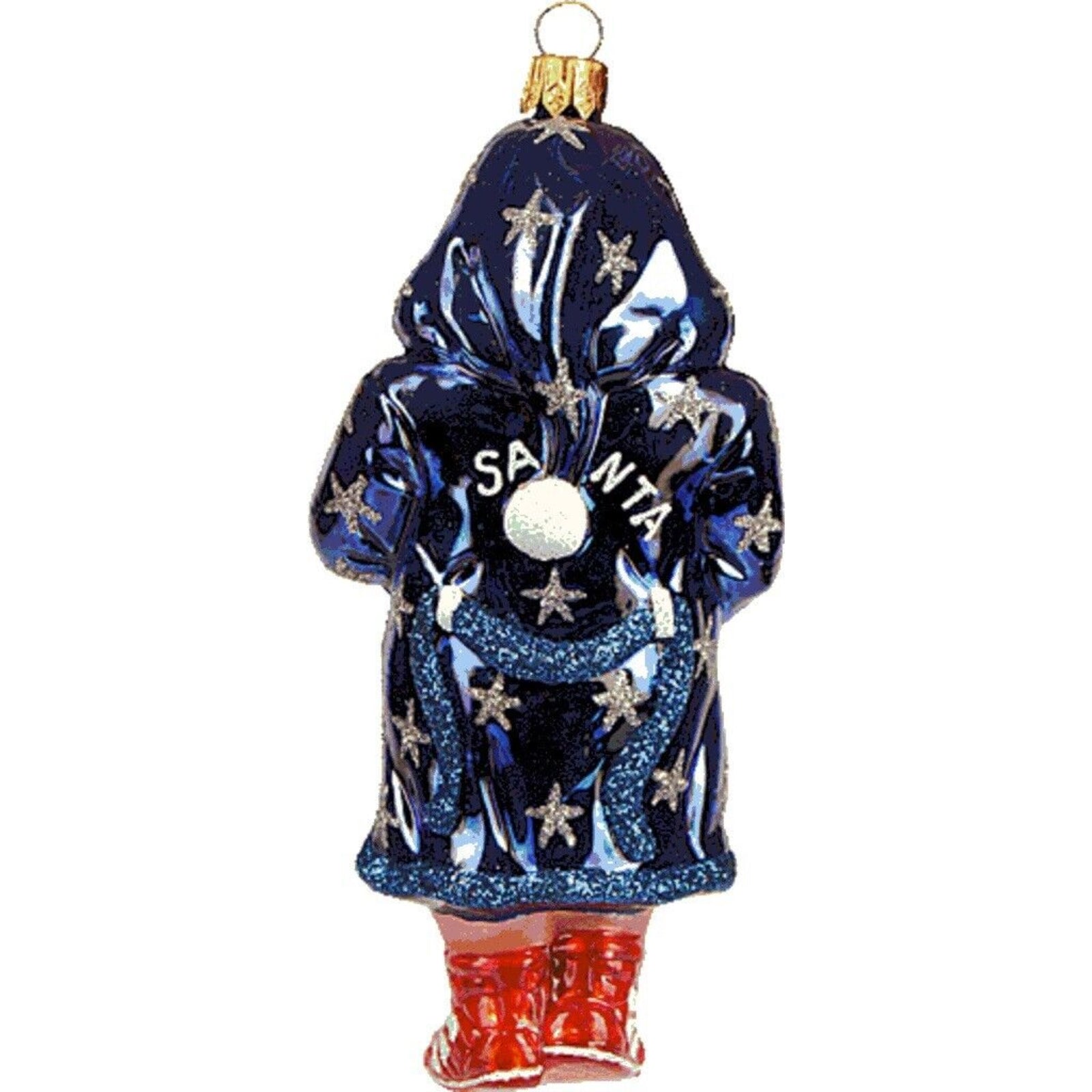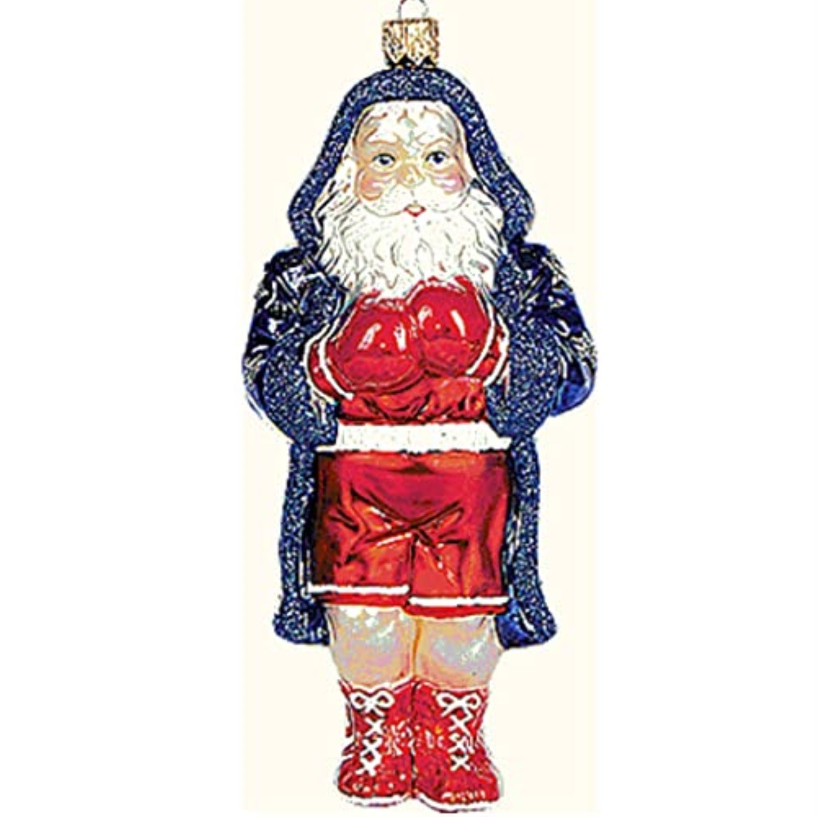 Boxing Santa Claus Ornament. Handcrafted in Poland. Hand-painted by Polish artisans. Made from mouth blown glass. Approximately 5 inches tall (13 cm). Includes original manufacturers box and packaging. Imported by Pinnacle Peak Trading Company.