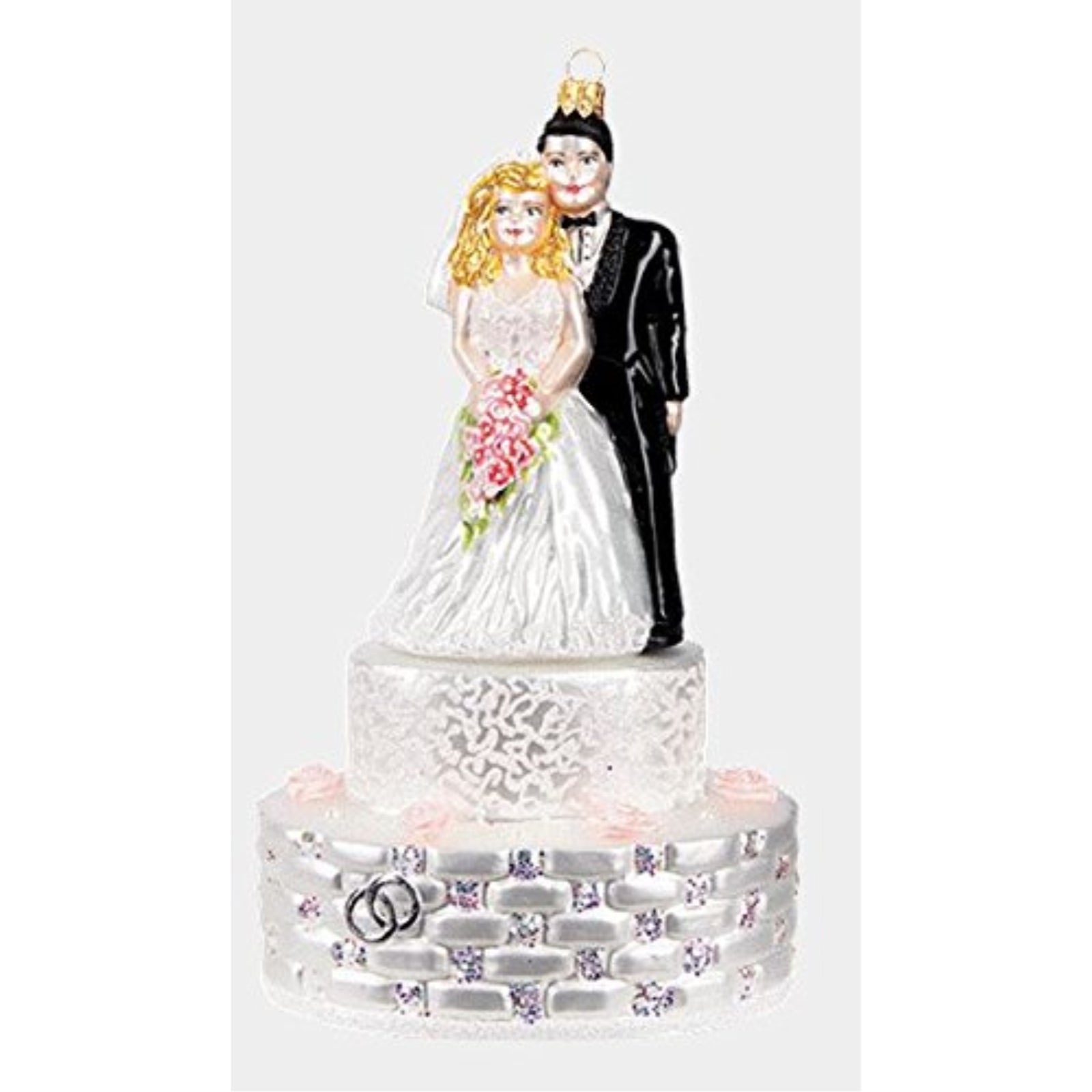 Wedding Cake Ornament. Handcrafted in Poland. Hand-painted by Polish artisans. Made from mouth blown glass. Approximately 8 inches tall (20cm). Includes original Pinnacle Peak Trading box and packaging. Imported by Pinnacle Peak Trading Company.