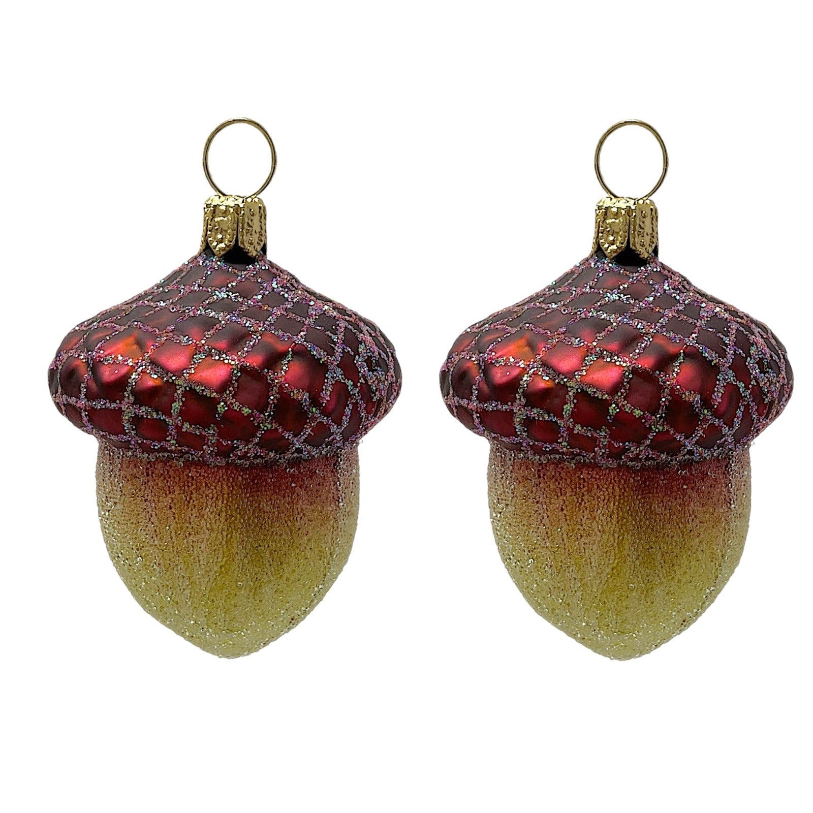 Glittery Acorn Ornaments. Set of 2. Handcrafted in Poland. Hand-painted by Polish artisans. Made from mouth blown glass. Approximately 1.5 x 1.5 x 2 inches (LxWxH). Includes original Pinnacle Peak Trading box and packaging. Imported by Pinnacle Peak Trading Company.