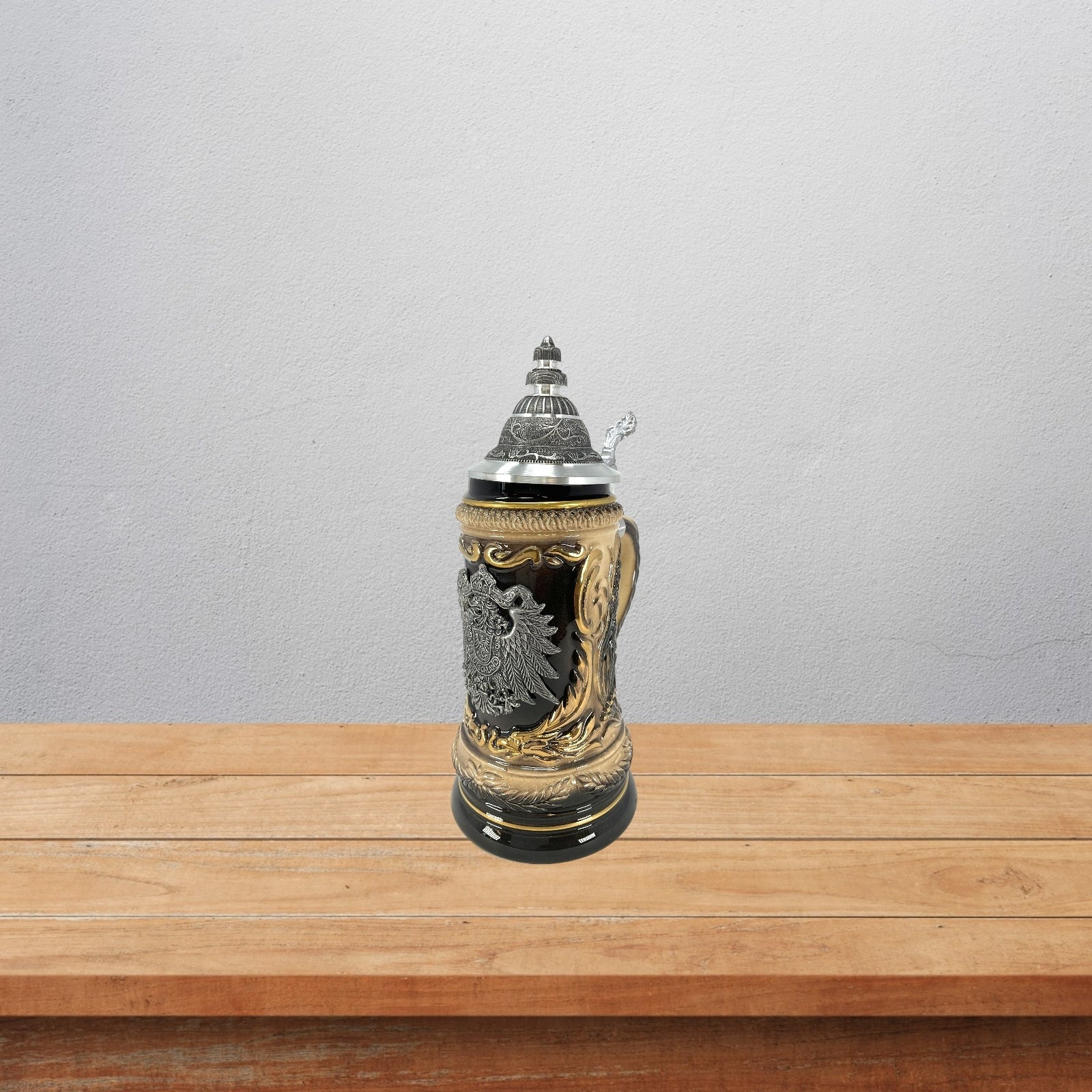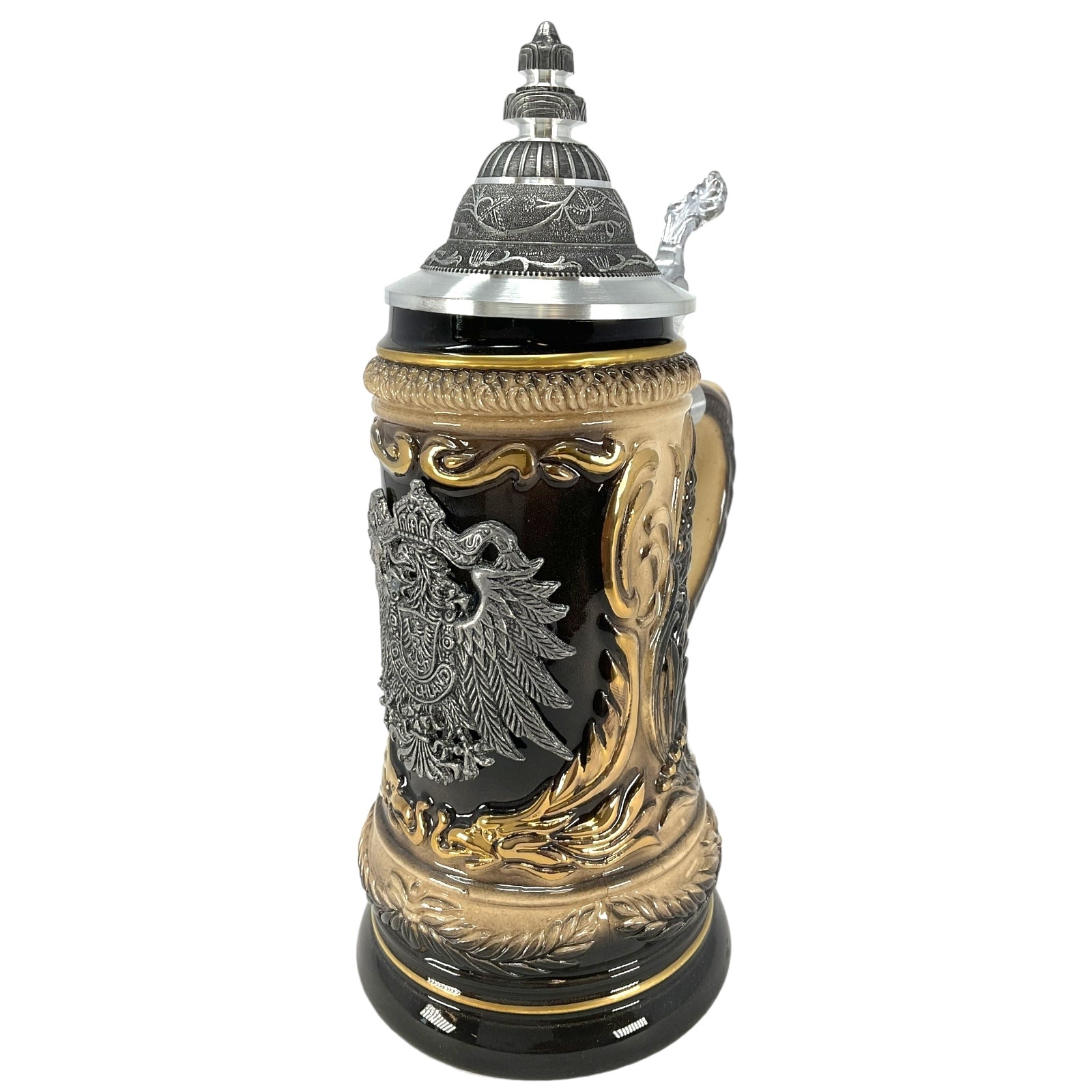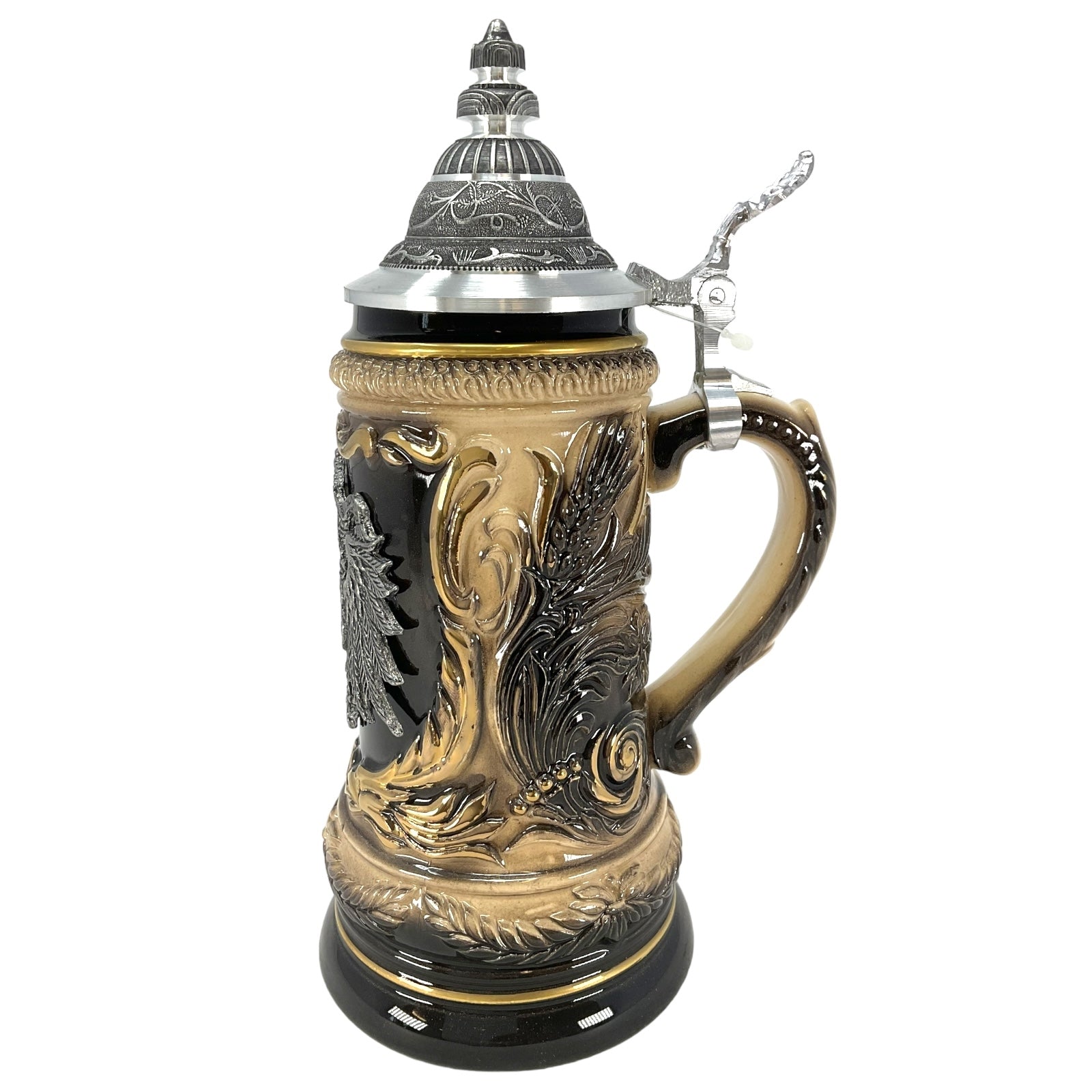 - This attractive stein has a pewter lid and a pewter eagle on the front. The eagle on the front is perched on the word Deutschland (the German name for Germany.)