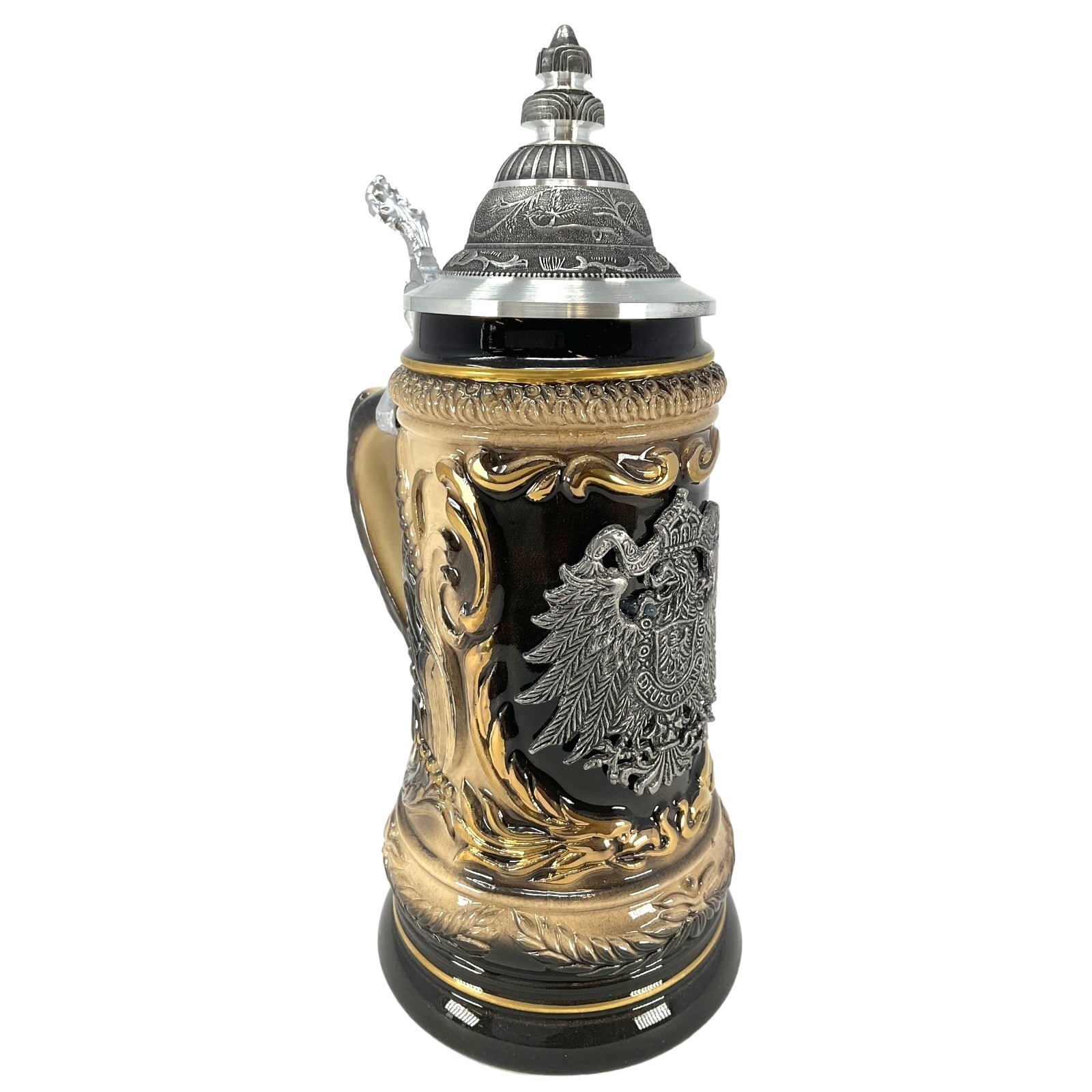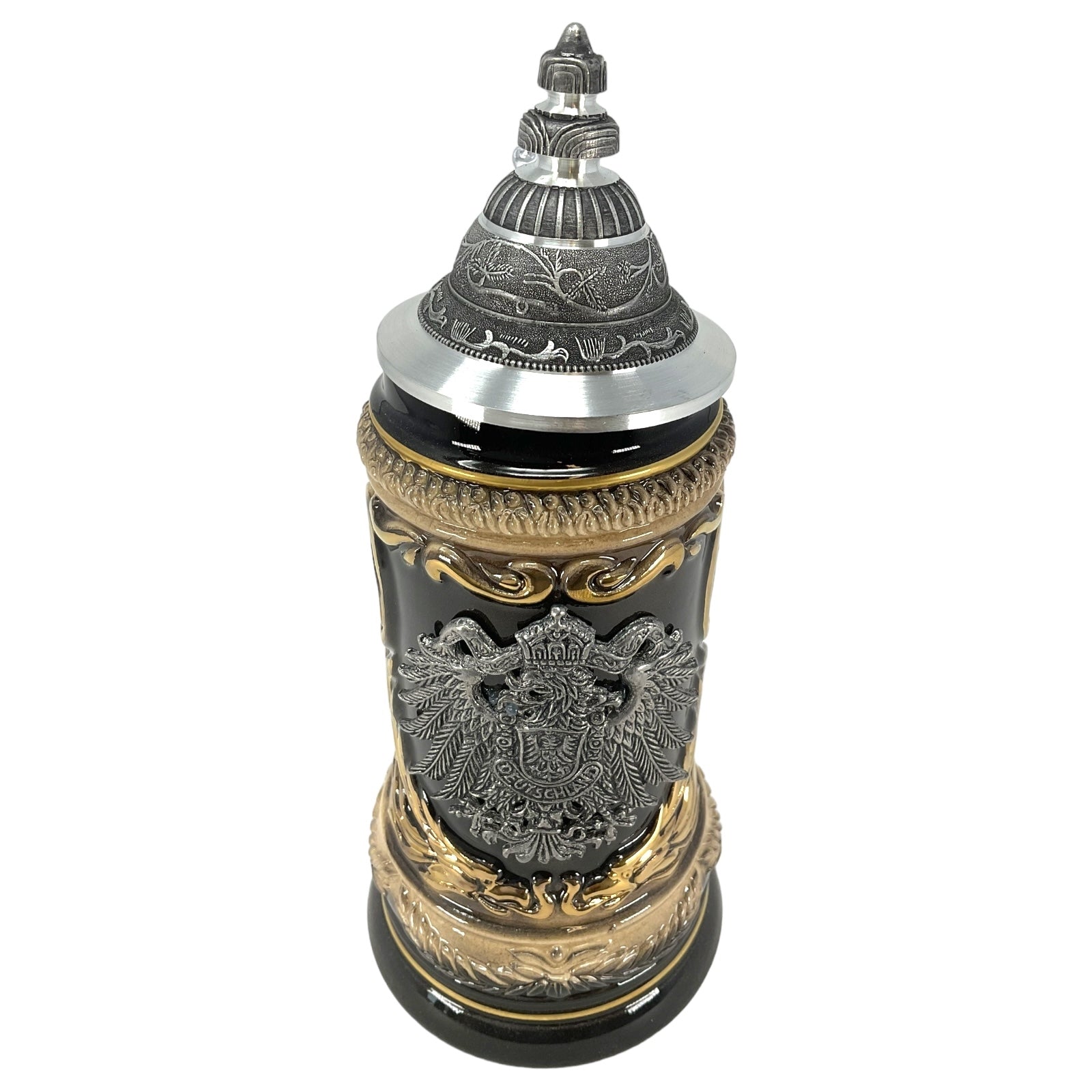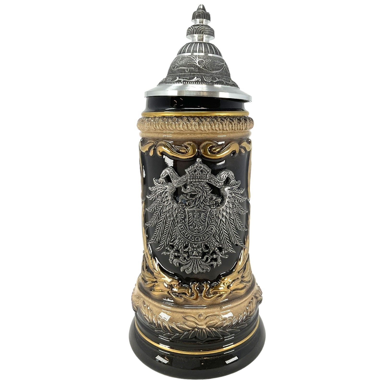 - This attractive stein has a pewter lid and a pewter eagle on the front. The eagle on the front is perched on the word Deutschland (the German name for Germany.)