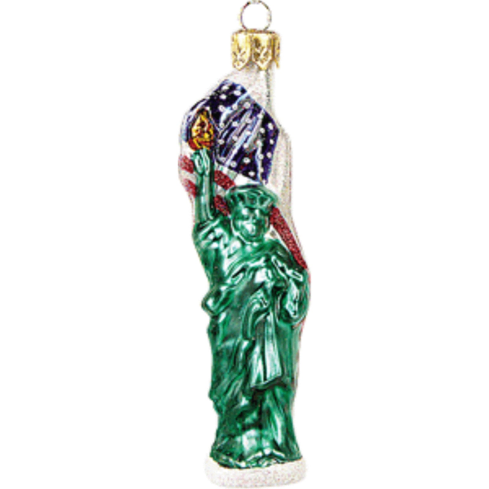 Miniature Statue of Liberty USA Ornament. Made in Poland. Imported by Pinnacle Peak Trading Company. Mouth blown and hand painted. Made from glass. Approximately 3 inches tall, .7 inches wide, and .7 inches deep. Comes packaged in a gift box.