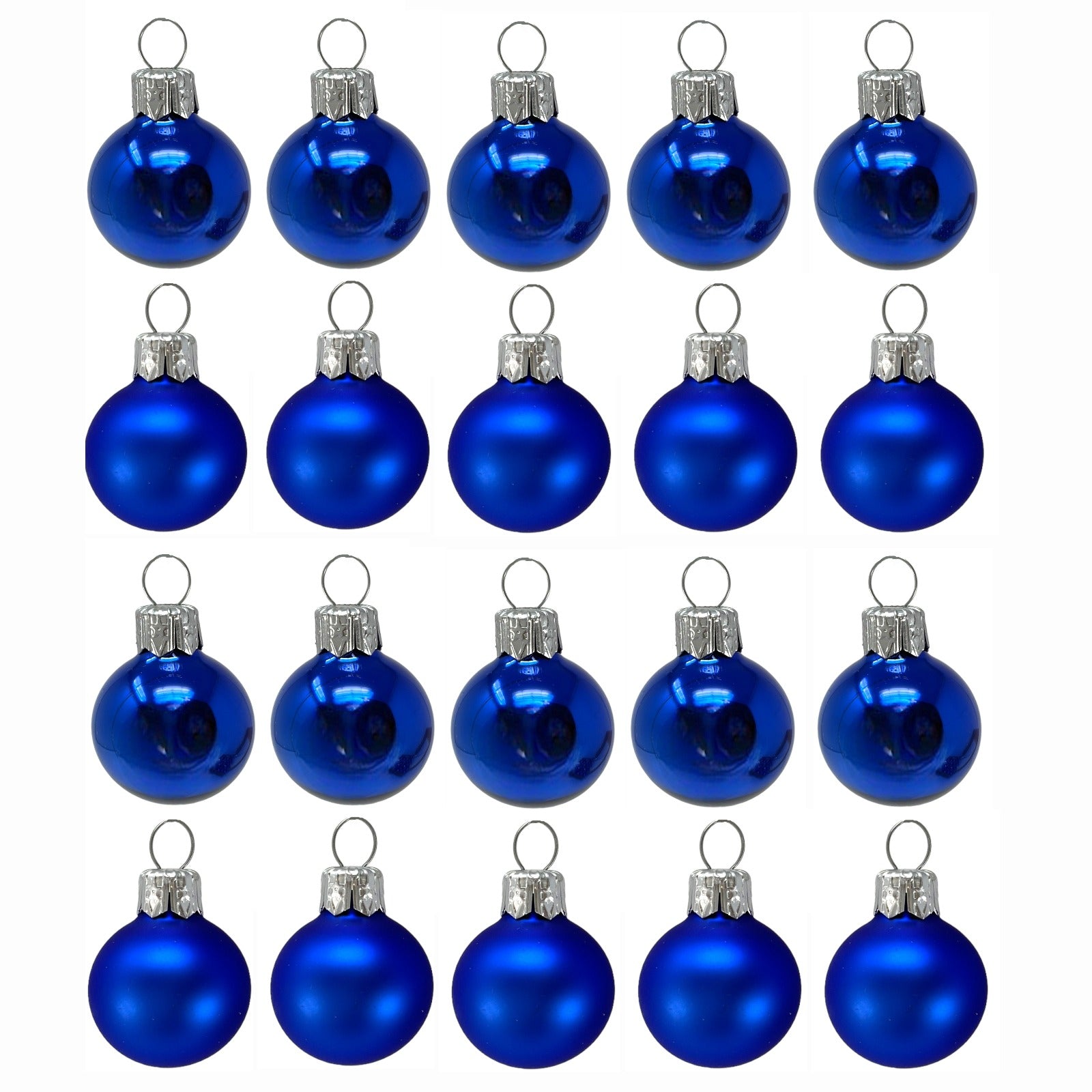 Blue Christmas Ball Set. Set includes 20 ornaments - 10 matte and 10 shiny. Made in Poland. Made from glass. Balls are 30 mm in size (1.2 inch). High quality European ornament from Pinnacle Peak Trading.