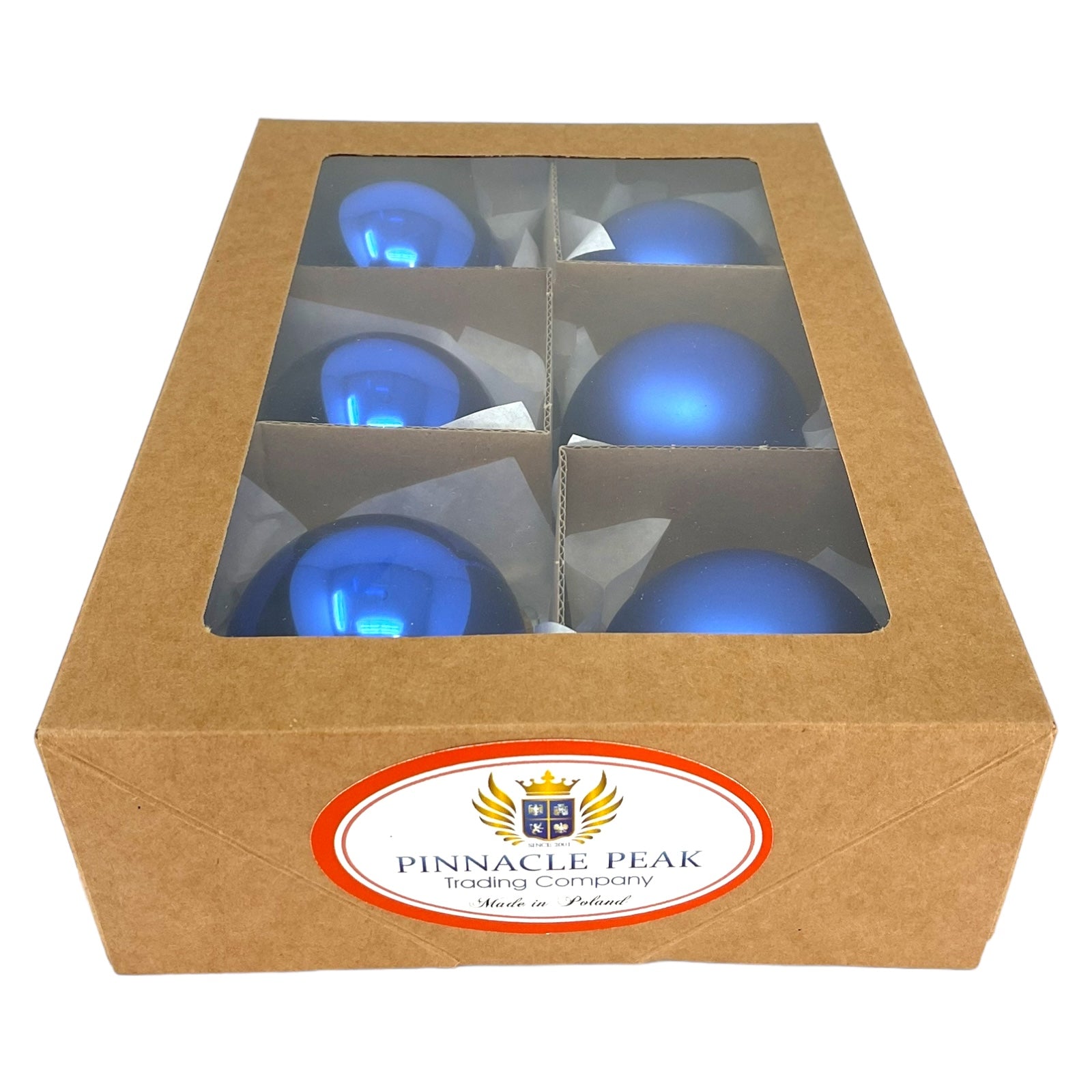 Blue Christmas Ball Set. Set includes 6 ornaments - 3 matte and 3 shiny. Made in Poland. Made from glass. Balls are 60 mm in size (2.4 inch). High quality European ornament from Pinnacle Peak Trading.