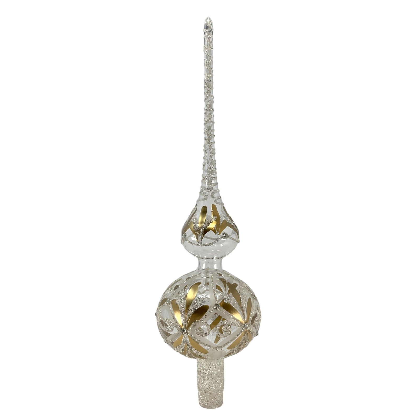Clear Gold and Silver Glitter Finial Tree Topper. Made in Poland. Made from glass. Approximately 3.5 x 3.5 x 14.5 inches (9 x 9 x 37cm). High quality European tree topper from Pinnacle Peak Trading.