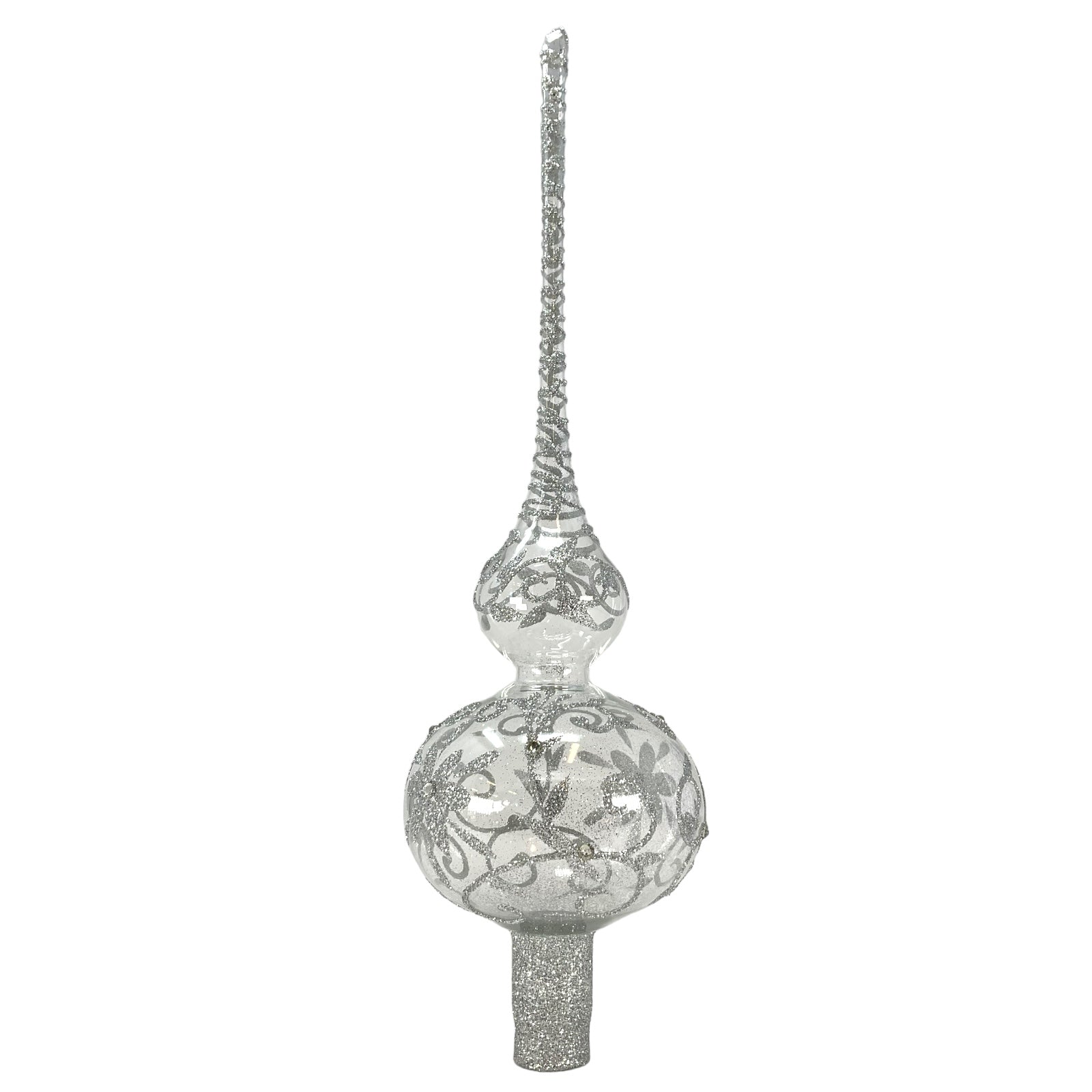 Pinnacle Peak Trading Clear with Silver Glitter Floral Design Polish Glass Finial Christmas Tree Topper 14.5 inch
