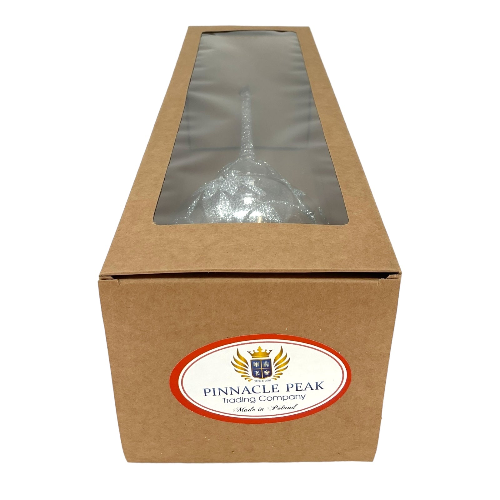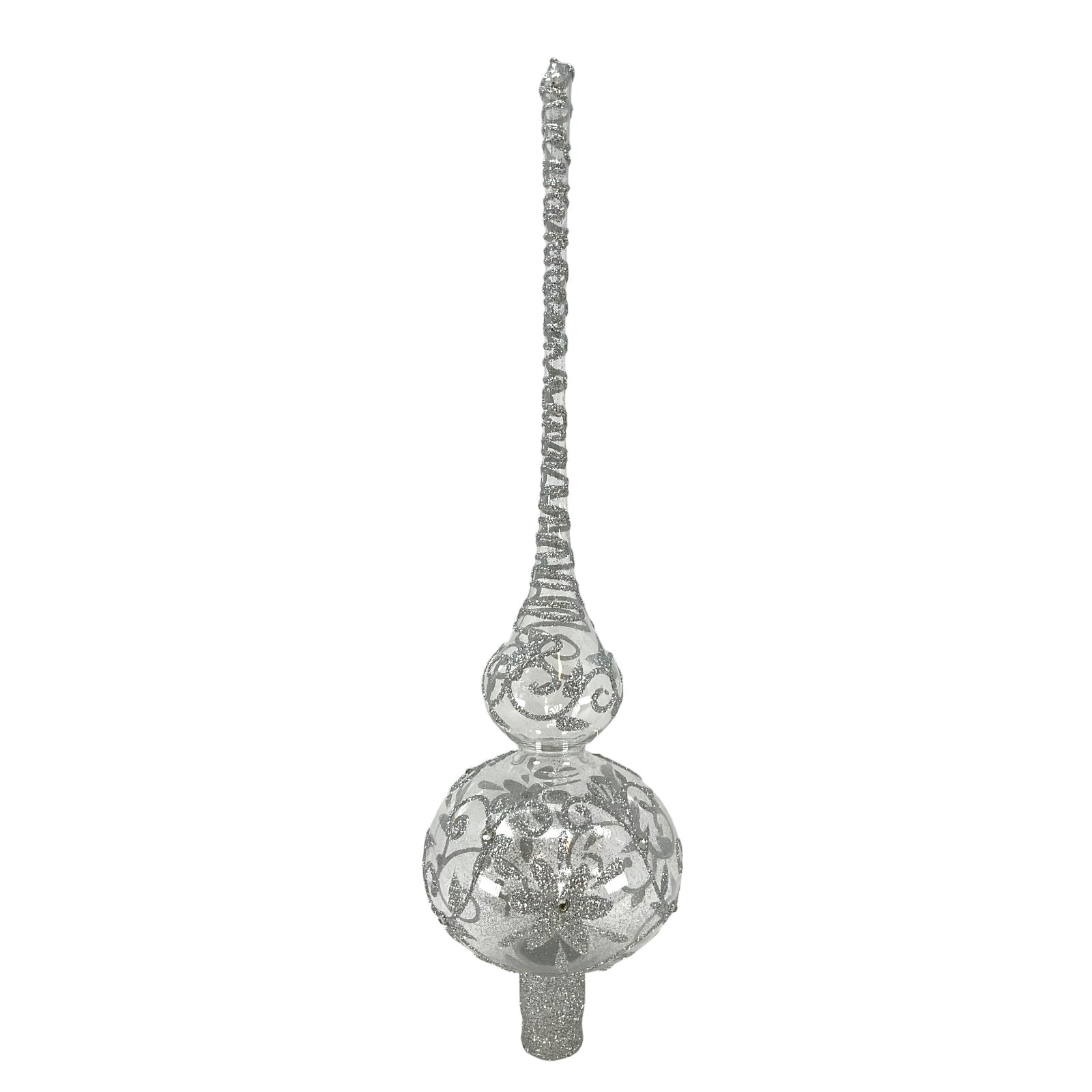 Clear with Silver Floral Design Finial Tree Topper. Made in Poland. Made from glass. Approximately 3.5 x 3.5 x 14.5 inches (9 x 9 x 37cm). High quality European tree topper from Pinnacle Peak Trading.