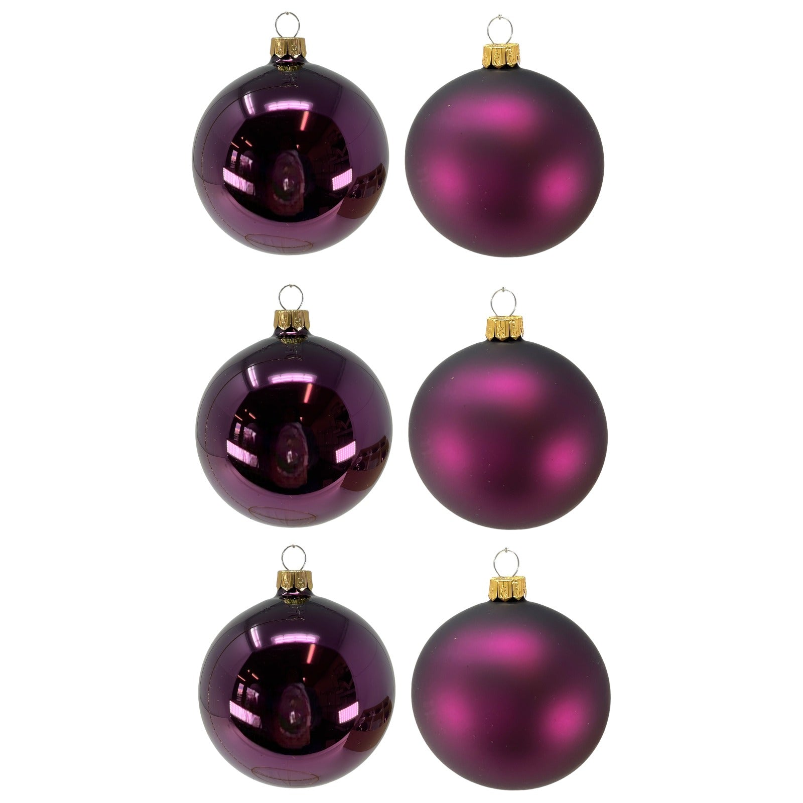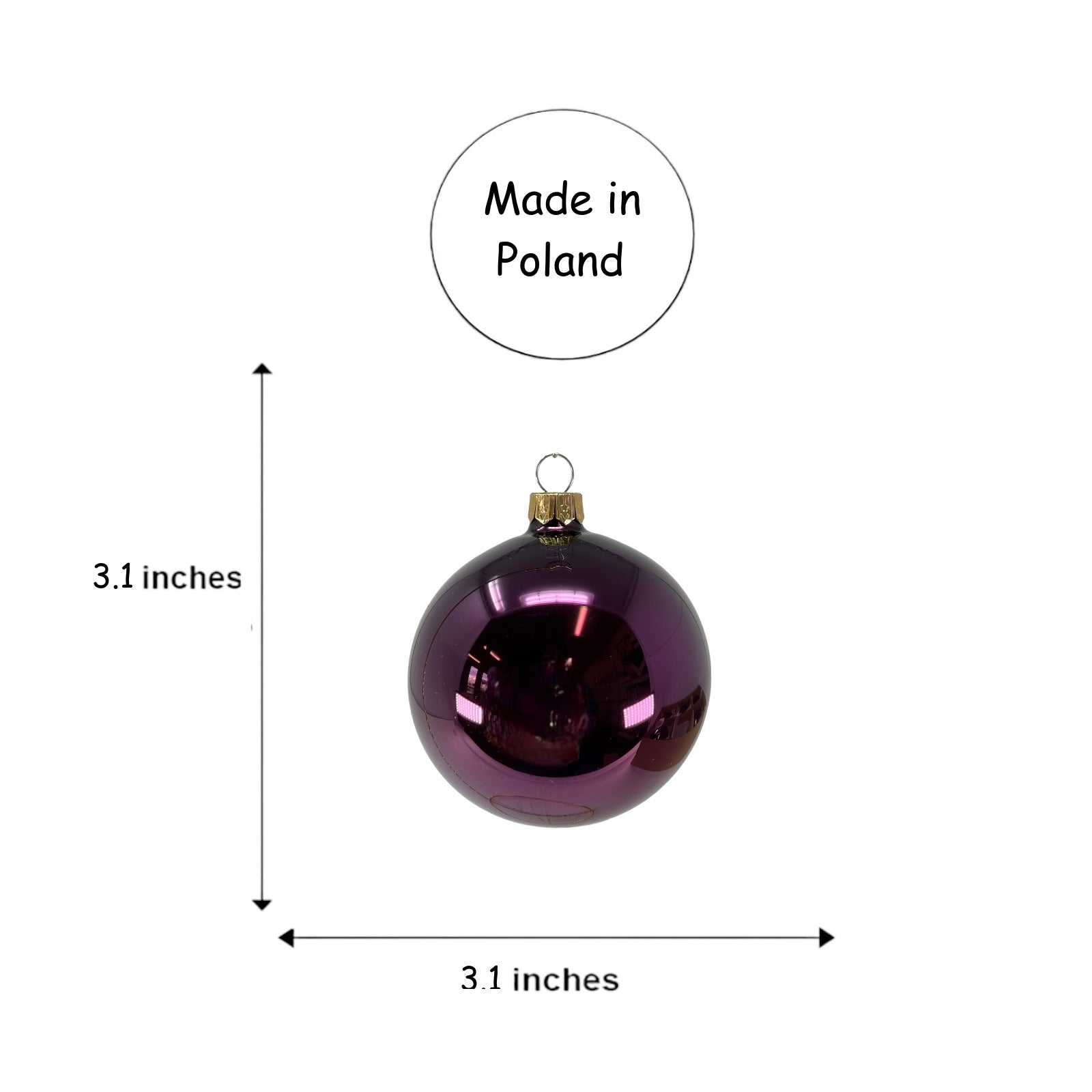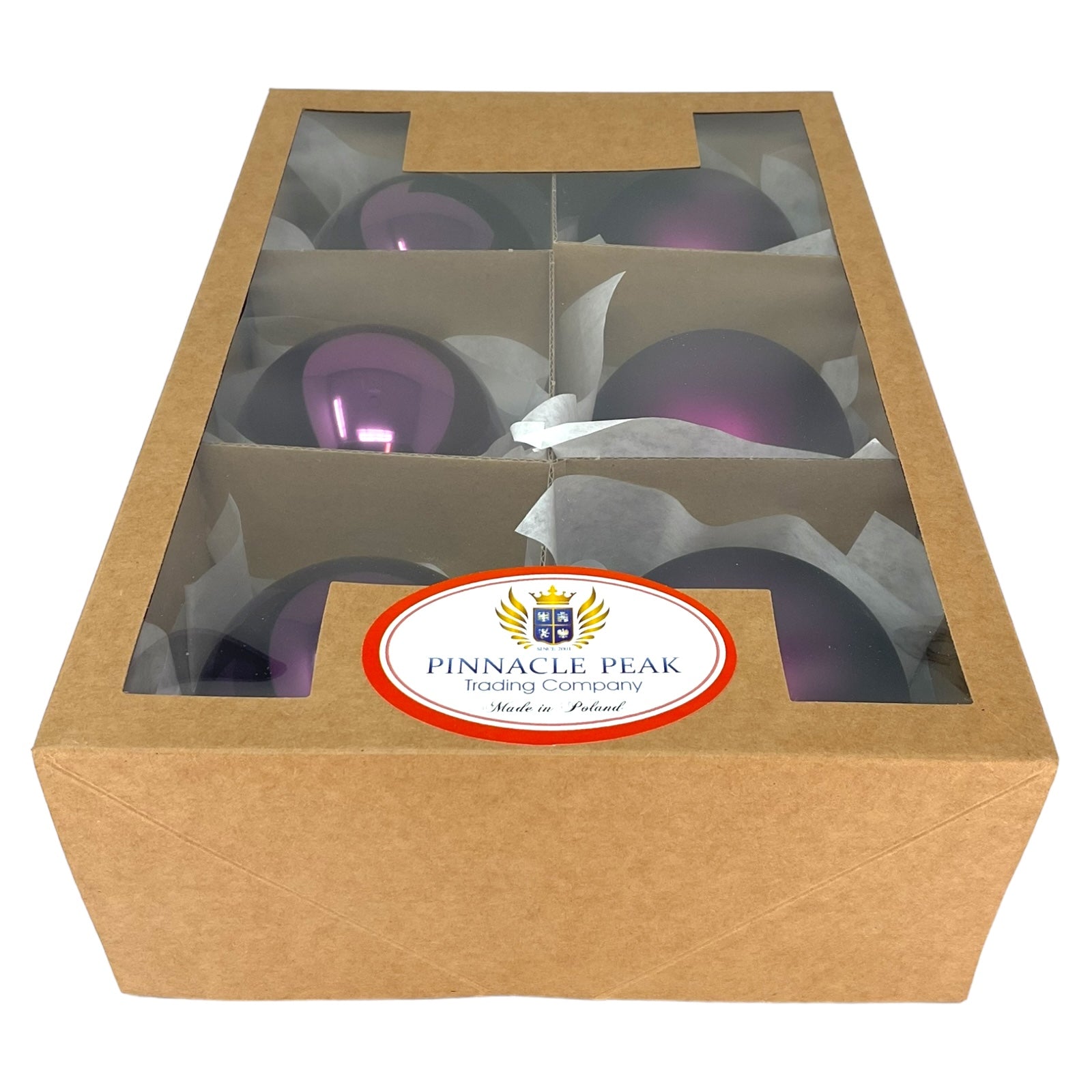 Dark Purple Christmas Ball Set. Set includes 6 ornaments - 3 matte and 3 shiny. Made in Poland. Made from glass. Balls are 80 mm in size (3.1 inch). High quality European ornament from Pinnacle Peak Trading.