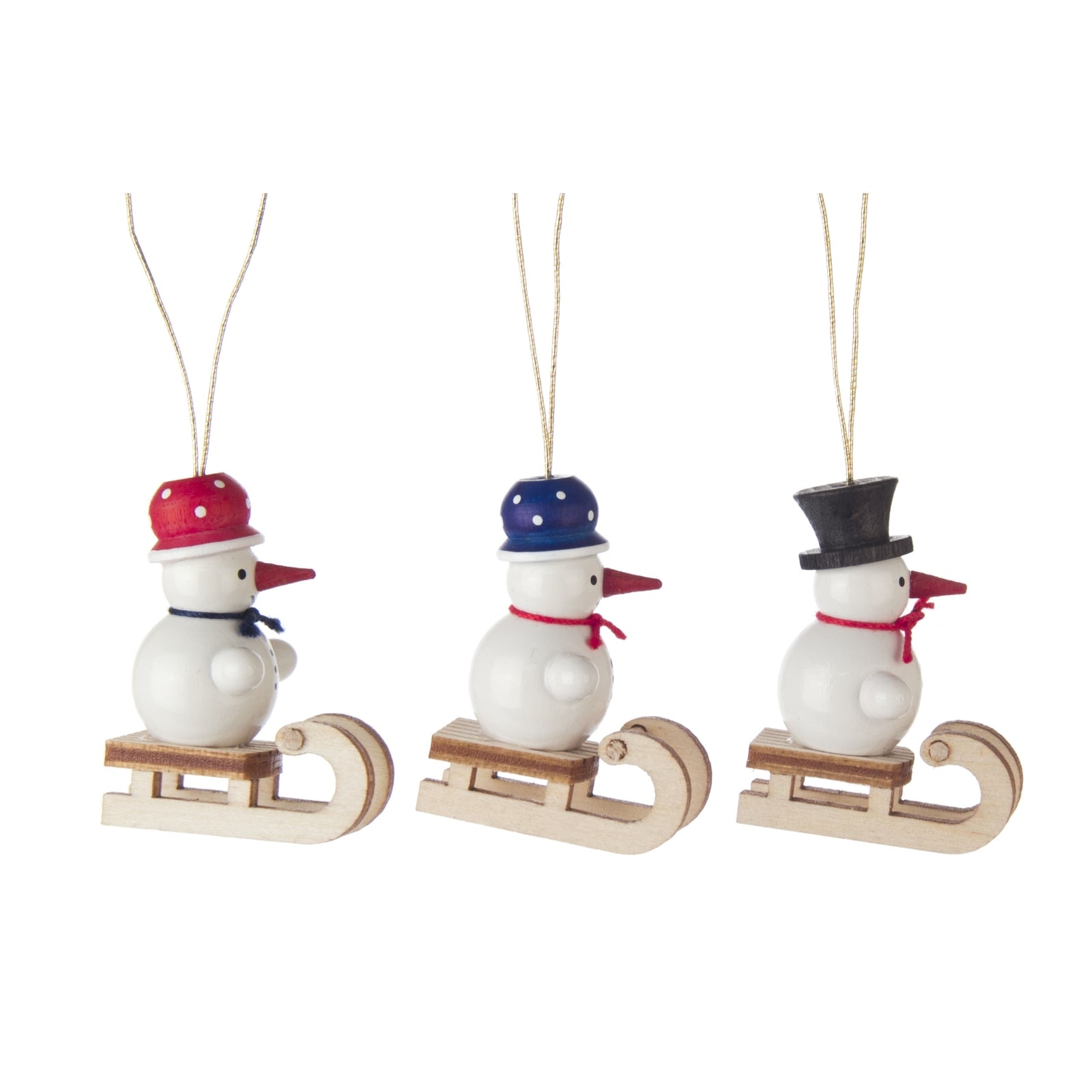 Hanging Snowman Trio on Sleigh Ornament. German Wood. Handcrafted in the Erzgebirge region of Germany. 1.5in (3.8cm). Pinnacle Peak Trading