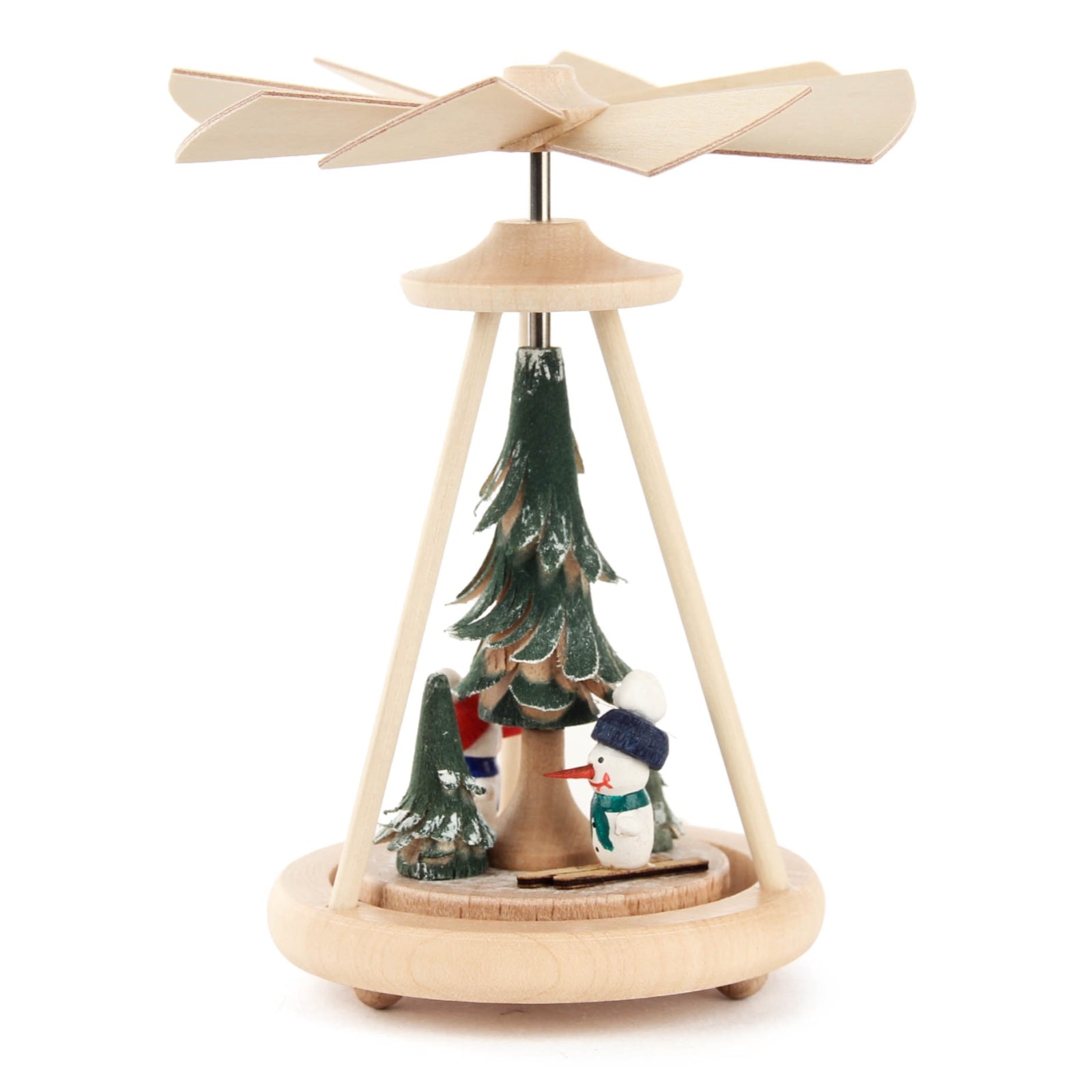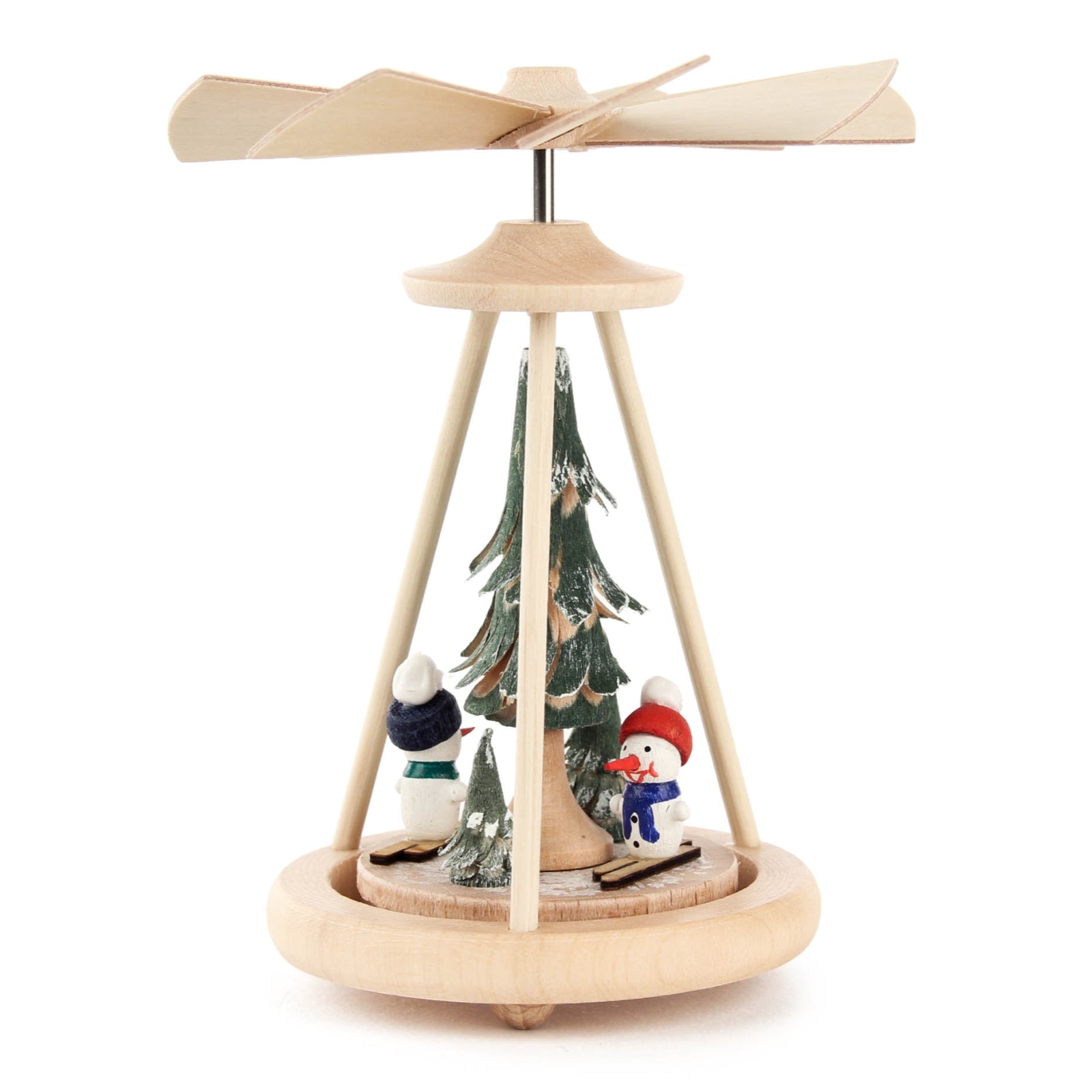 Mini Pyramid with Snowmen. German Wood. Handcrafted in the Erzgebirge region of Germany. 3.9in H (9.9cm). 3in W (7.6cm). 3in L (7.6cm). Two snowmen and small trees were arranged here.. Pinnacle Peak Trading