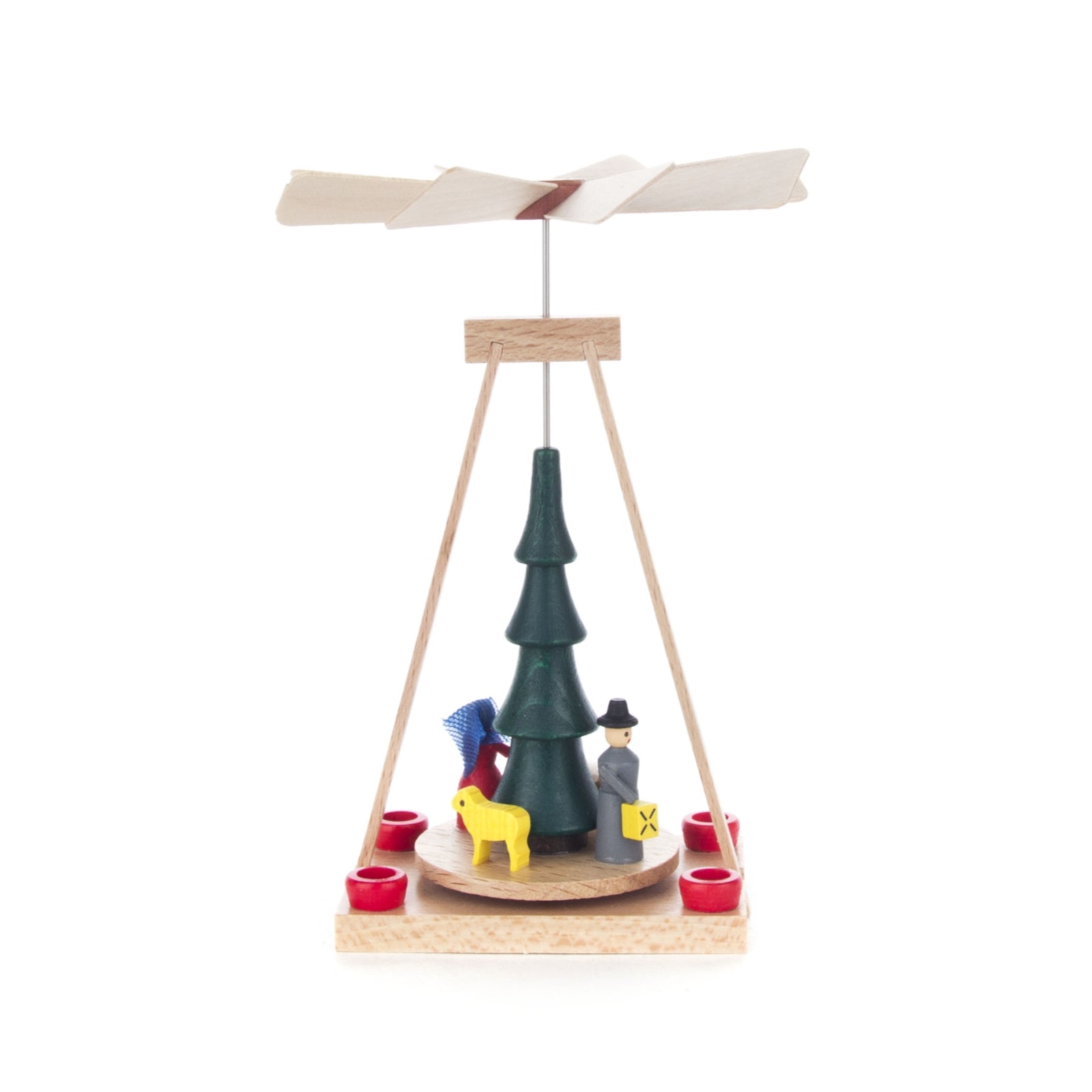 Miniature Pyramid Nativity Scene. German Wood. Handcrafted in the Erzgebirge region of Germany. 5.5in H (13.9cm). 3.9in L (9.9cm). 3.9in W (9.9cm. Pinnacle Peak Trading