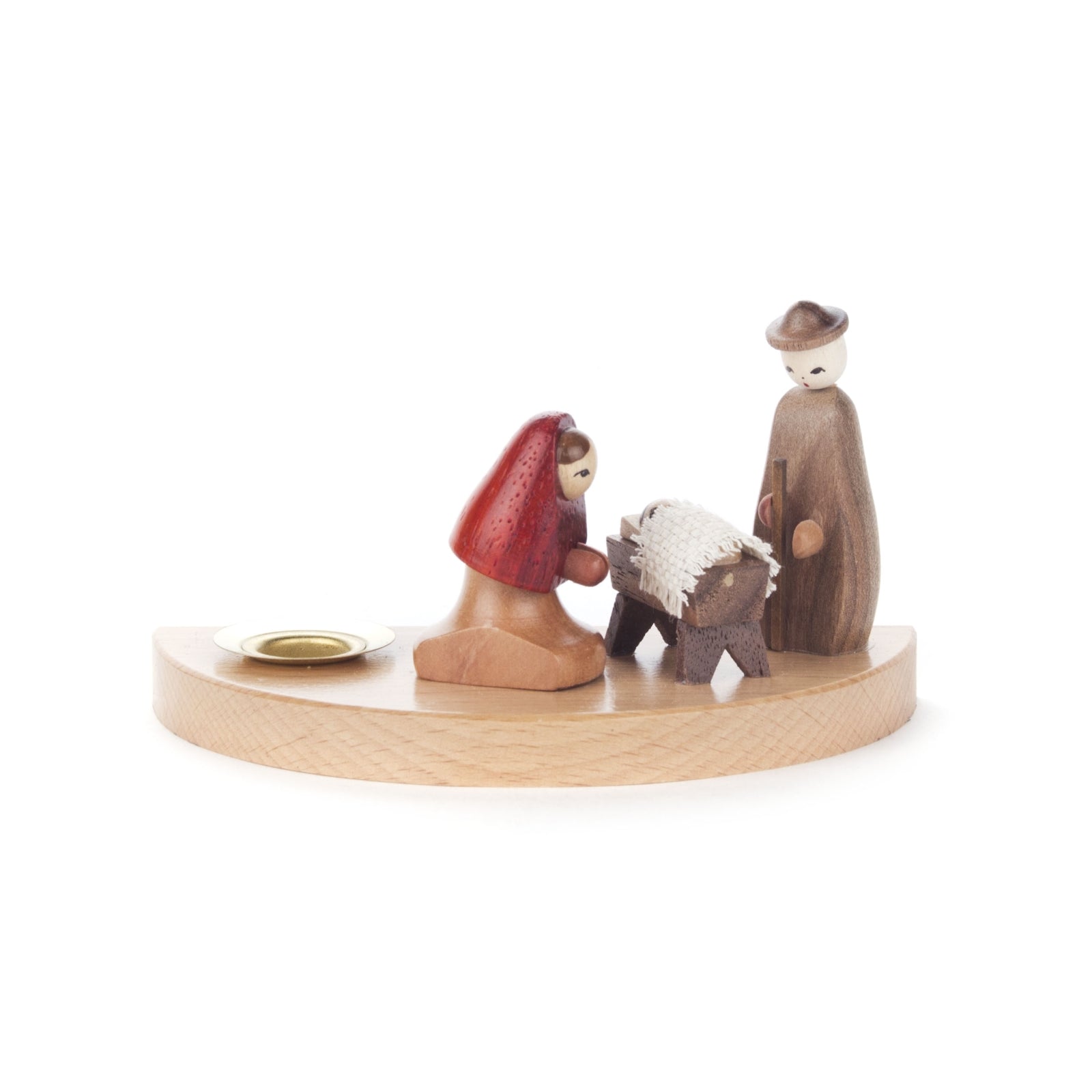 Nativity Scene Candle Holder . German Wood. Handcrafted in the Erzgebirge region of Germany. 2.3in H (5.8cm). 4.7in W (11.9cm). Candle diameter: 14mm. Pinnacle Peak Trading