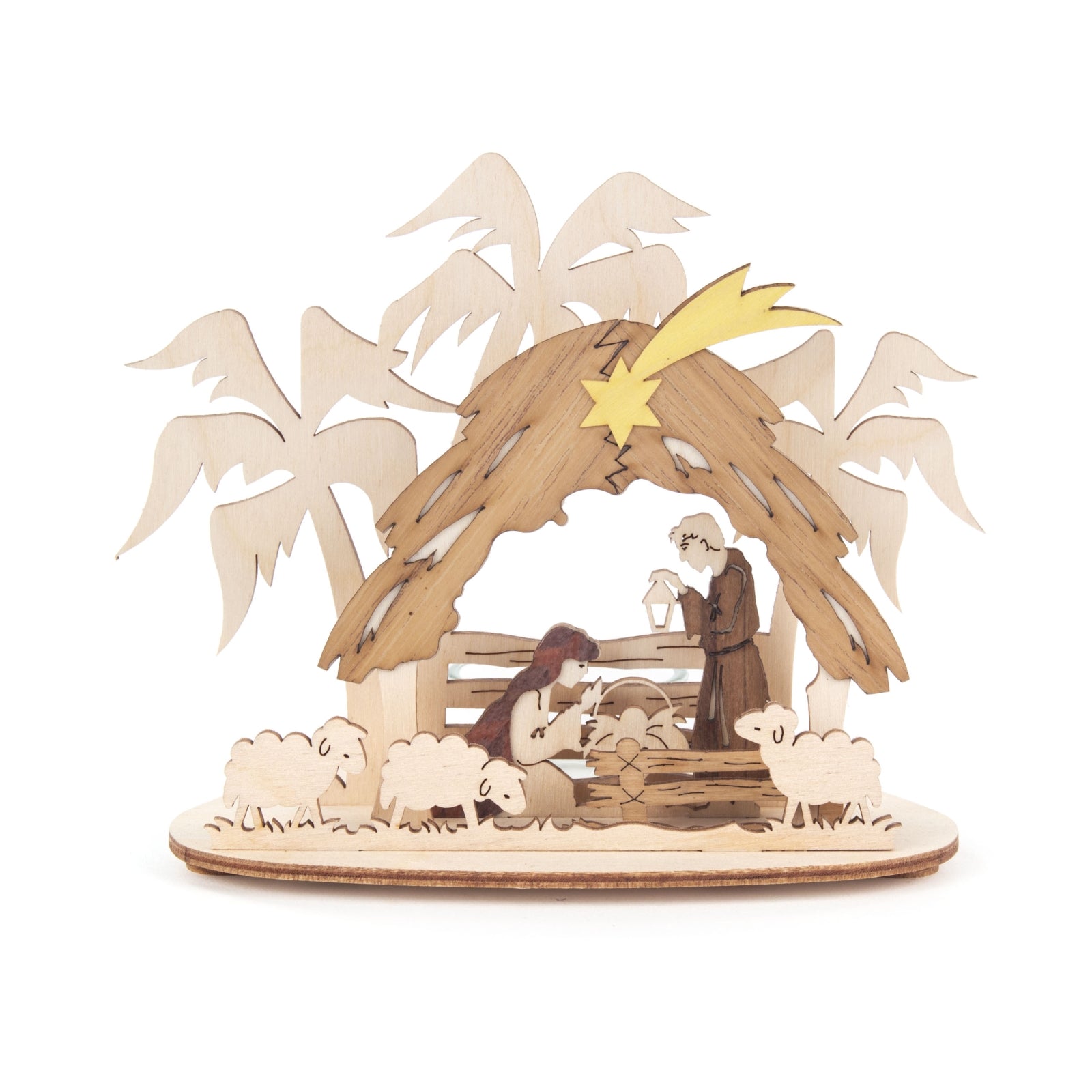 Nativity Scene Candle Holder. German Wood. Handcrafted in the Erzgebirge region of Germany. 4.7in H (11.9cm). Pinnacle Peak Trading