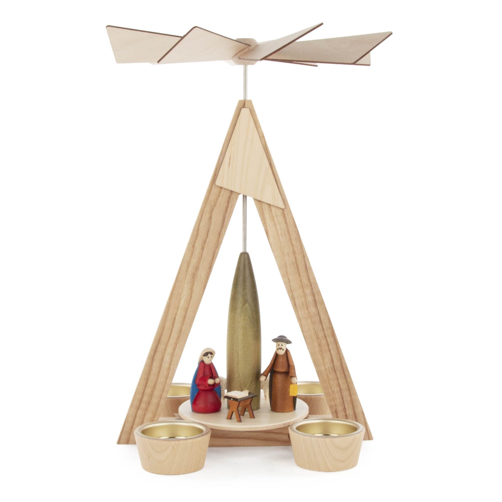 Pyramid Nativity Scene Candle Holder. German Wood. Handcrafted in the Erzgebirge region of Germany. 11.4in H (28.9cm). 7.8in W (19.8cm). Candles Type: Tea lights. Pinnacle Peak Trading