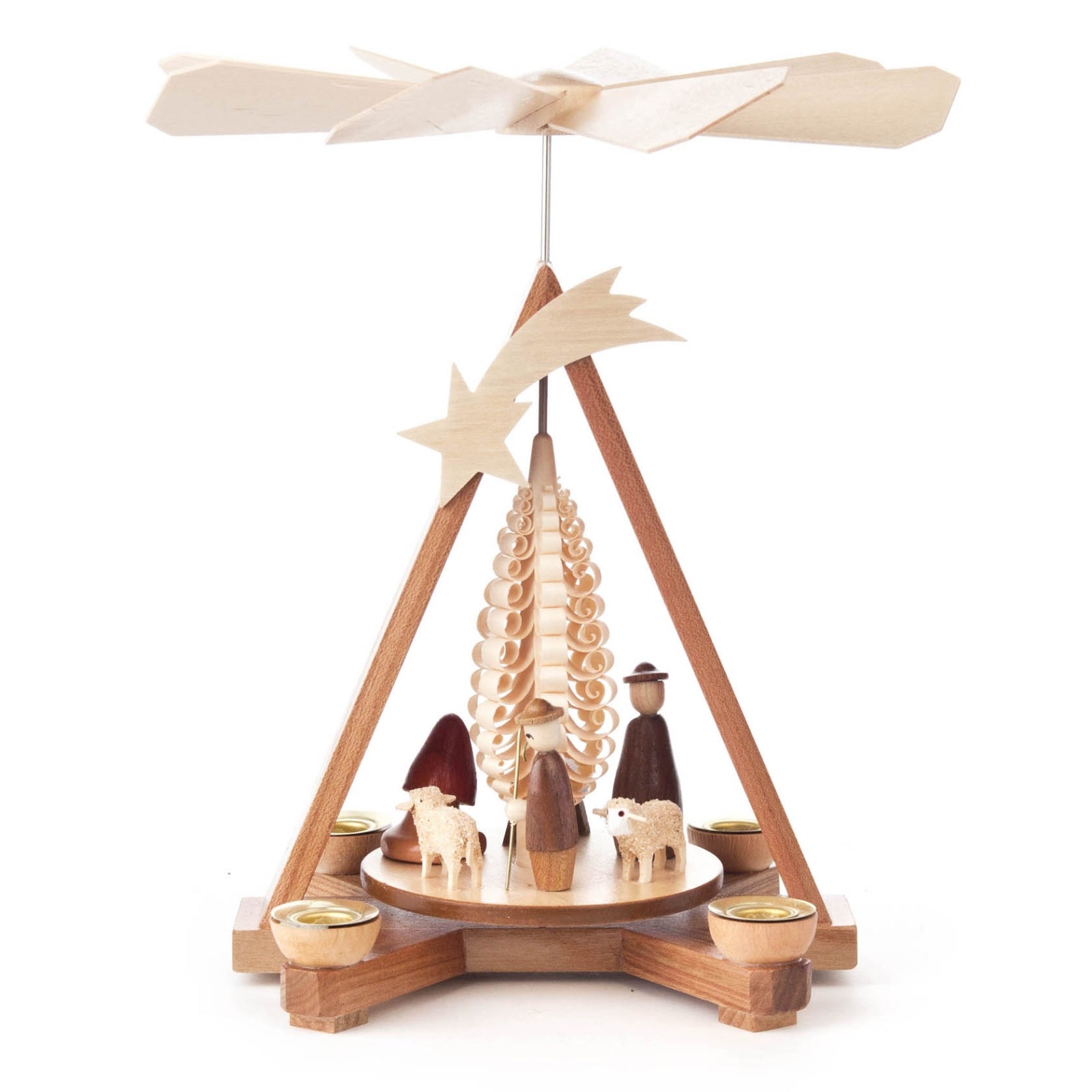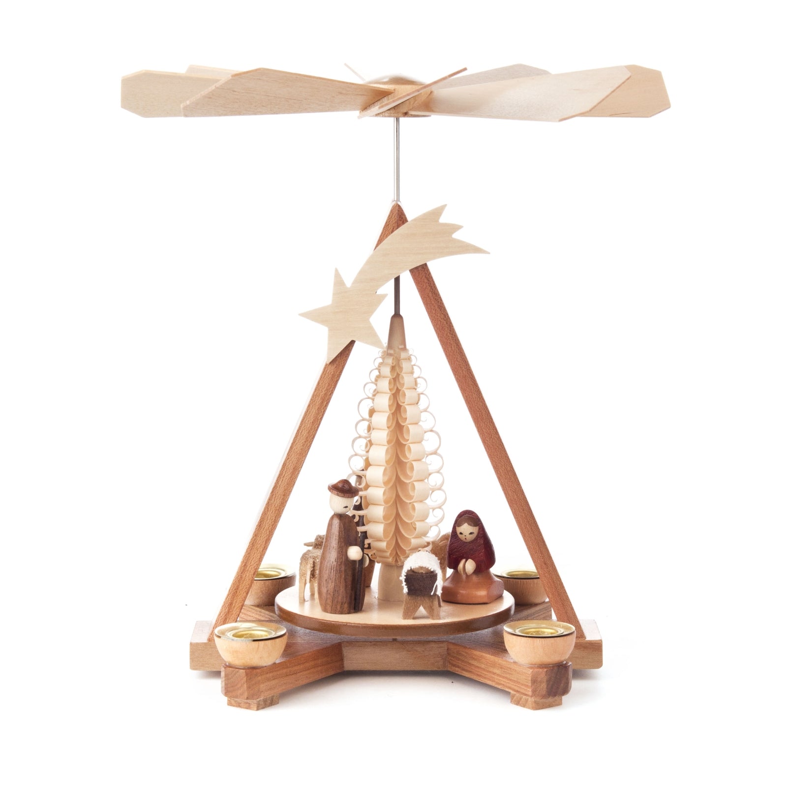 Pyramid Nativity Scene Candle Holder. German Wood. Handcrafted in the Erzgebirge region of Germany. 9.8in H (24.8cm). 8.6in W ( 21.8cm). Candle diameter: 14mm. Pinnacle Peak Trading