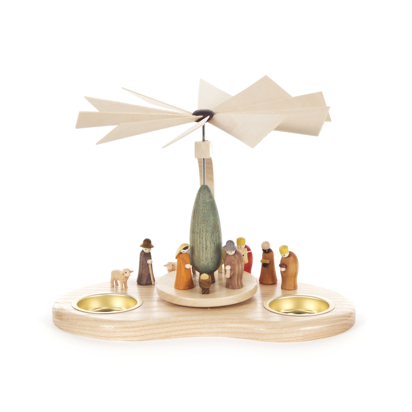 Pyramid Sheperd and Kings Candle Holder. German Wood. Handcrafted in the Erzgebirge region of Germany. 8.2in W (20.8cm). 5.9in H (14.9cm). Pinnacle Peak Trading