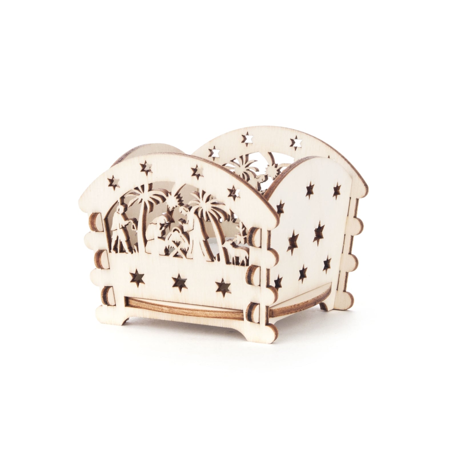 Tealight Holder Nativity Scene. German Wood. Handcrafted in the Erzgebirge region of Germany. 2.3in H (5.8cm). 2.7in W (6.8cm). Pinnacle Peak Trading