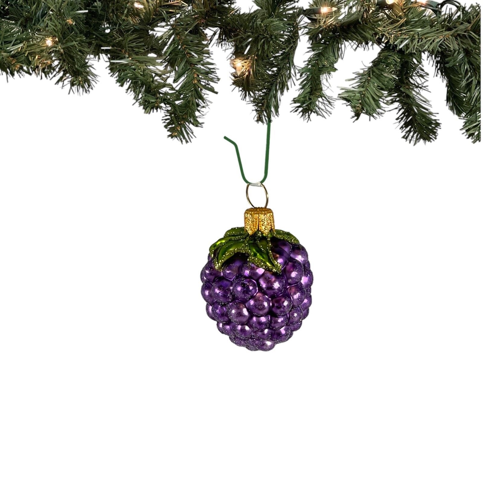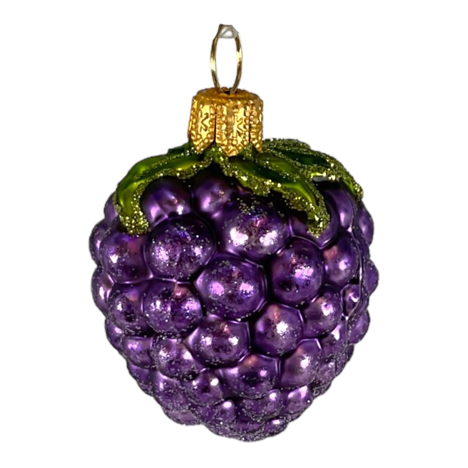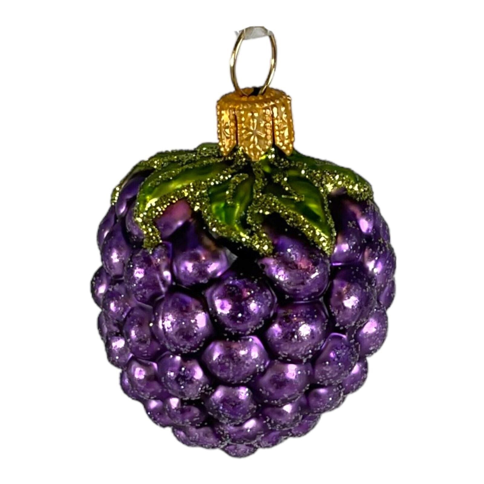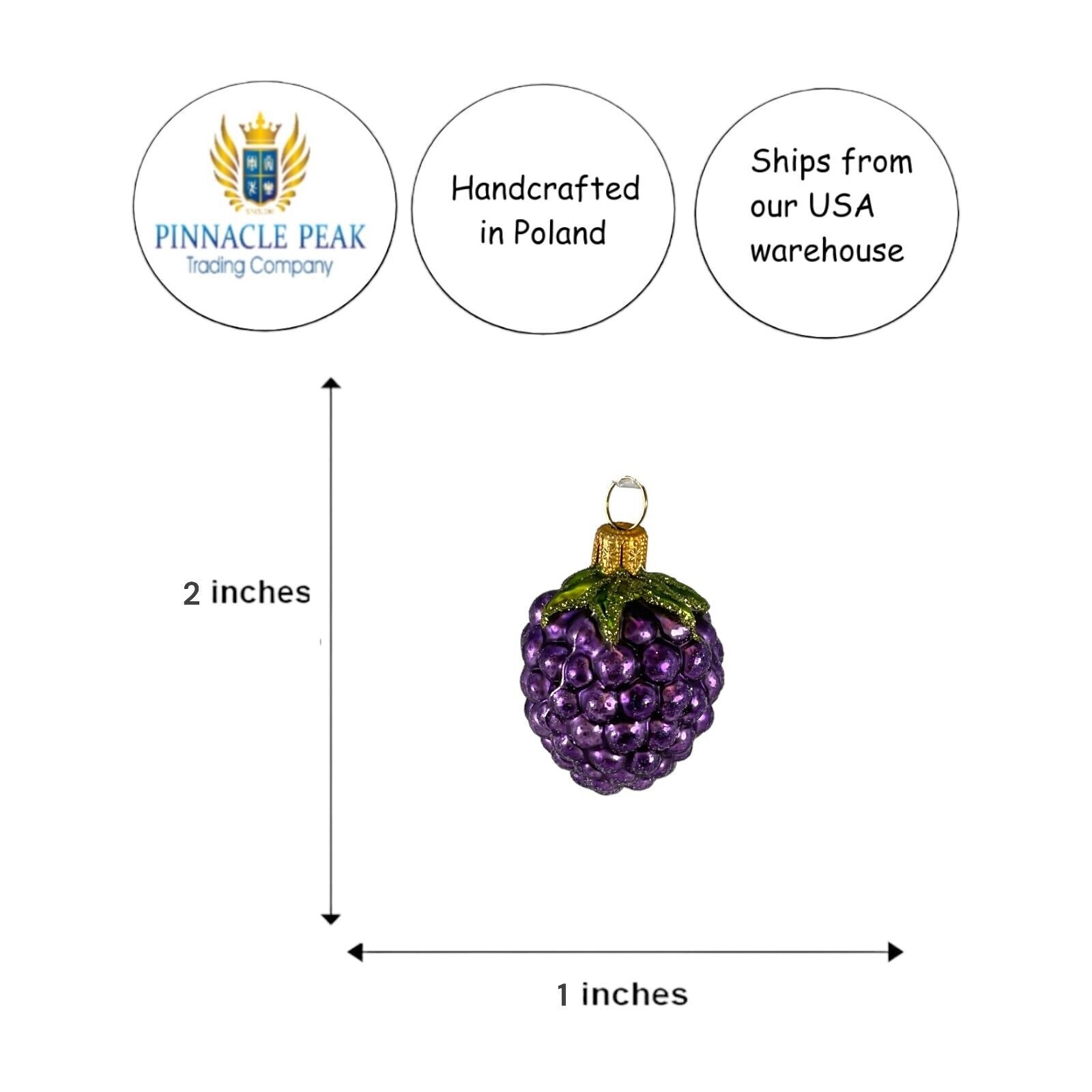 Mini Blackberry Ornament. Made in Poland. Mouth blown and hand painted. Made from glass. Approximately 1.6 inches tall (4 cm). Includes original Pinnacle Peak Trading box and packaging. Imported by Pinnacle Peak Trading Company.