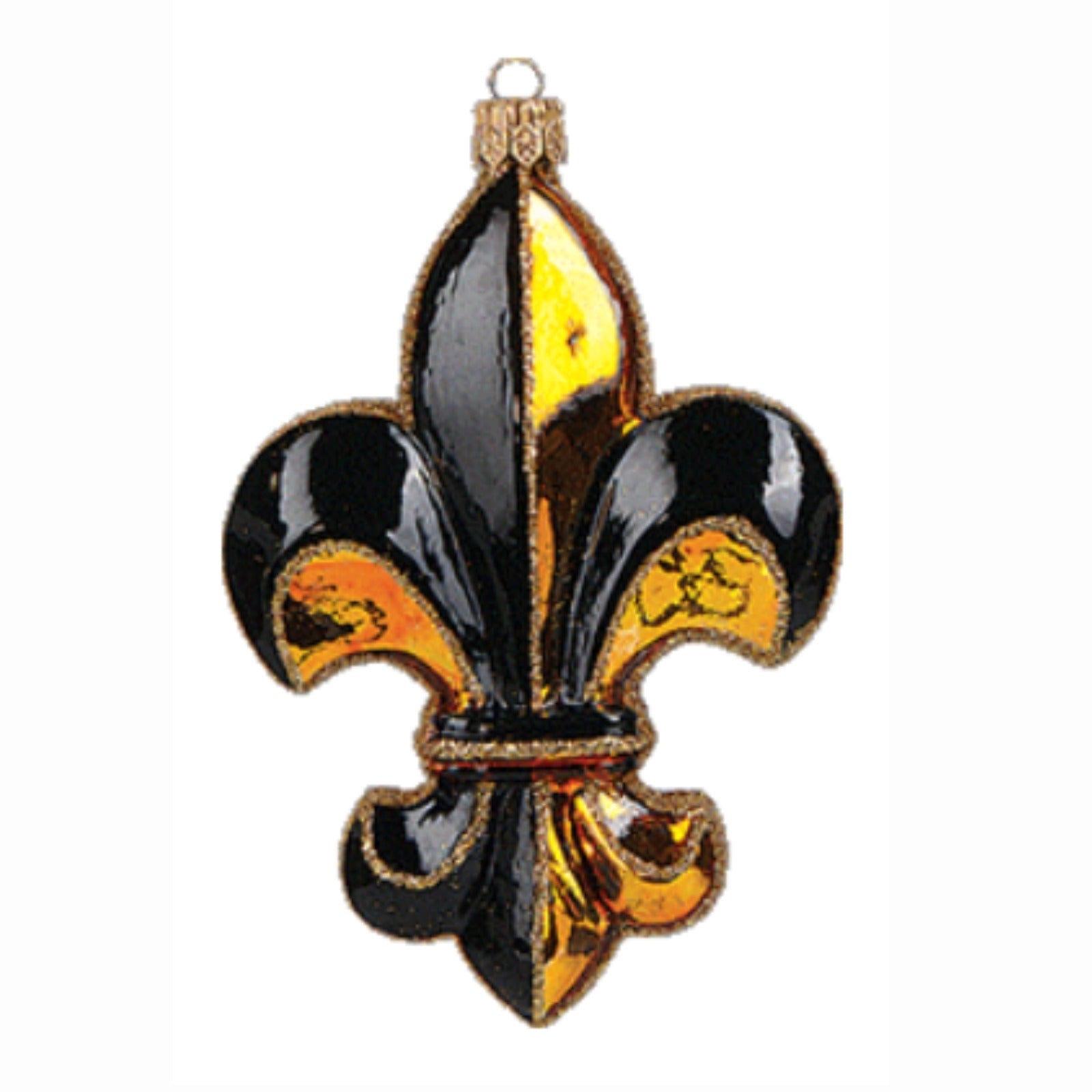 Gold Fleur De Lis Ornament. Handcrafted in Poland. Hand-painted by Polish artisans. Made from mouth blown glass. Approximately 4 inches tall (10 cm). Includes original manufacturers box and packaging. Imported by Pinnacle Peak Trading Company.