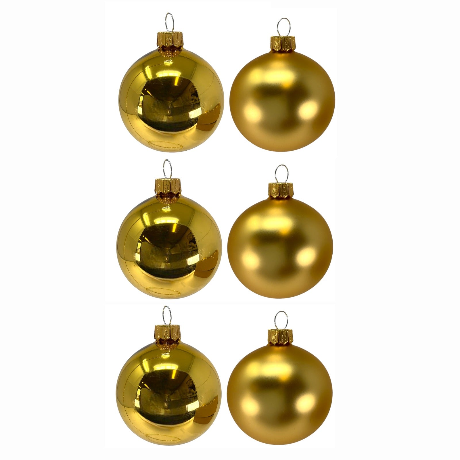 Gold Christmas Ball Set. Set includes 6 ornaments - 3 matte and 3 shiny. Made in Poland. Made from glass. Balls are 60 mm in size (2.4 inch). High quality European ornament from Pinnacle Peak Trading.