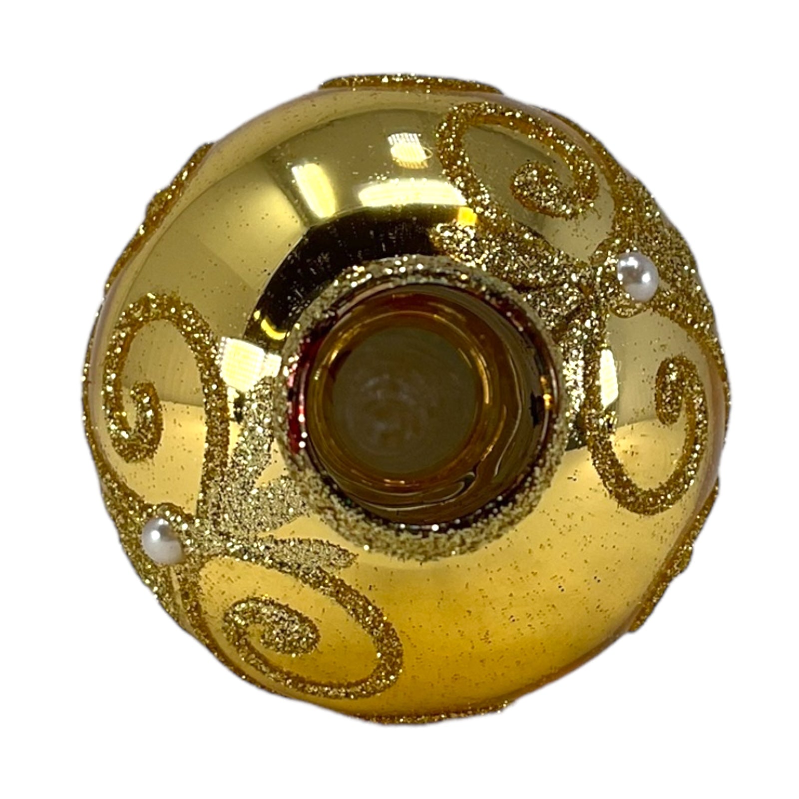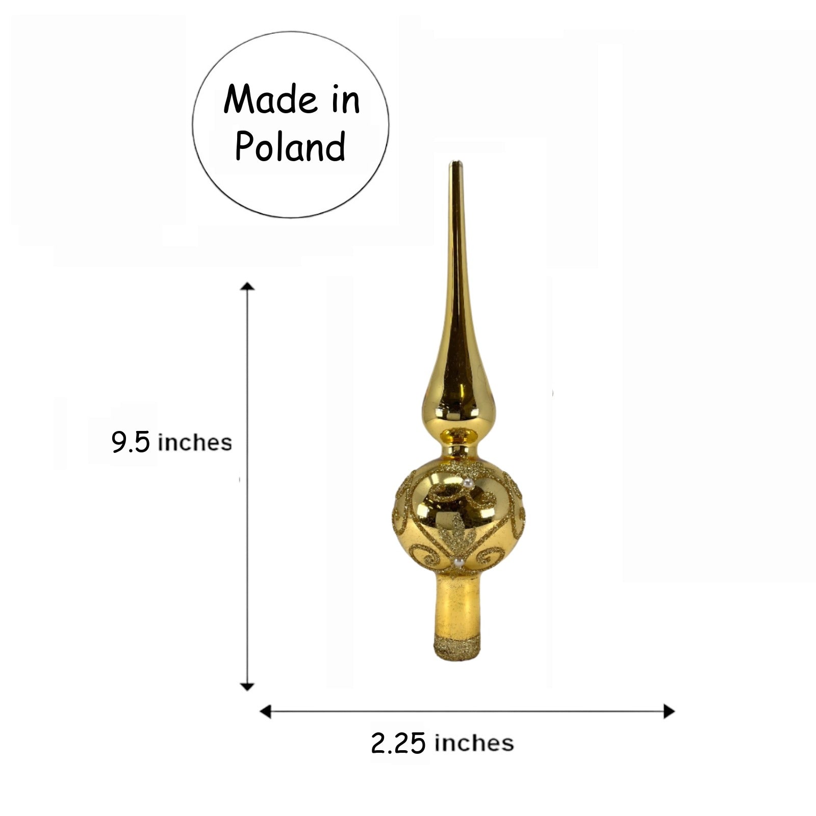 Gold with Gold Glitter Swirls Finial Tree Topper. Made in Poland. Made from glass. Approximately 2.25 x 2.25 x 9.5 inches (6 x 6 x 24cm). High quality European tree topper from Pinnacle Peak Trading.