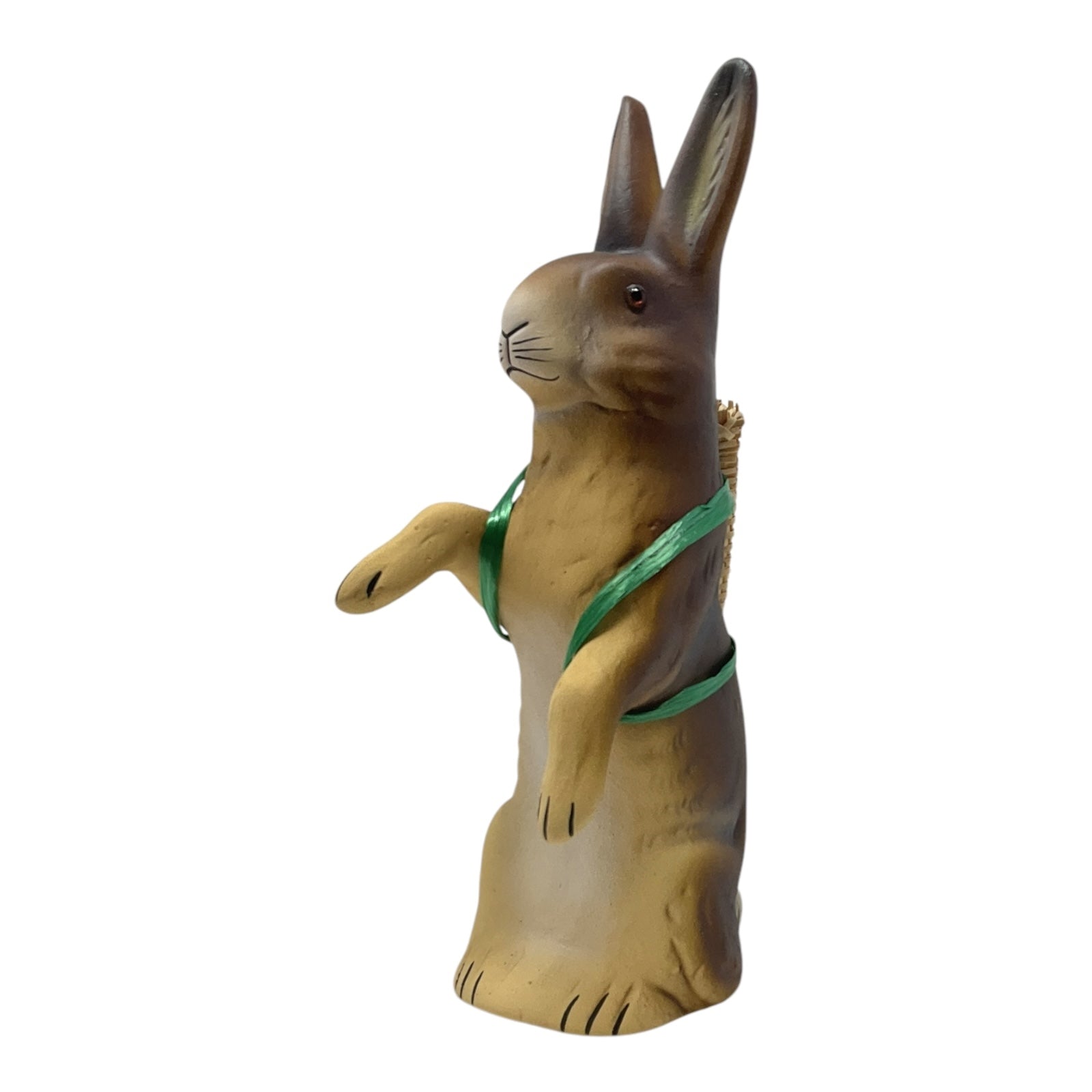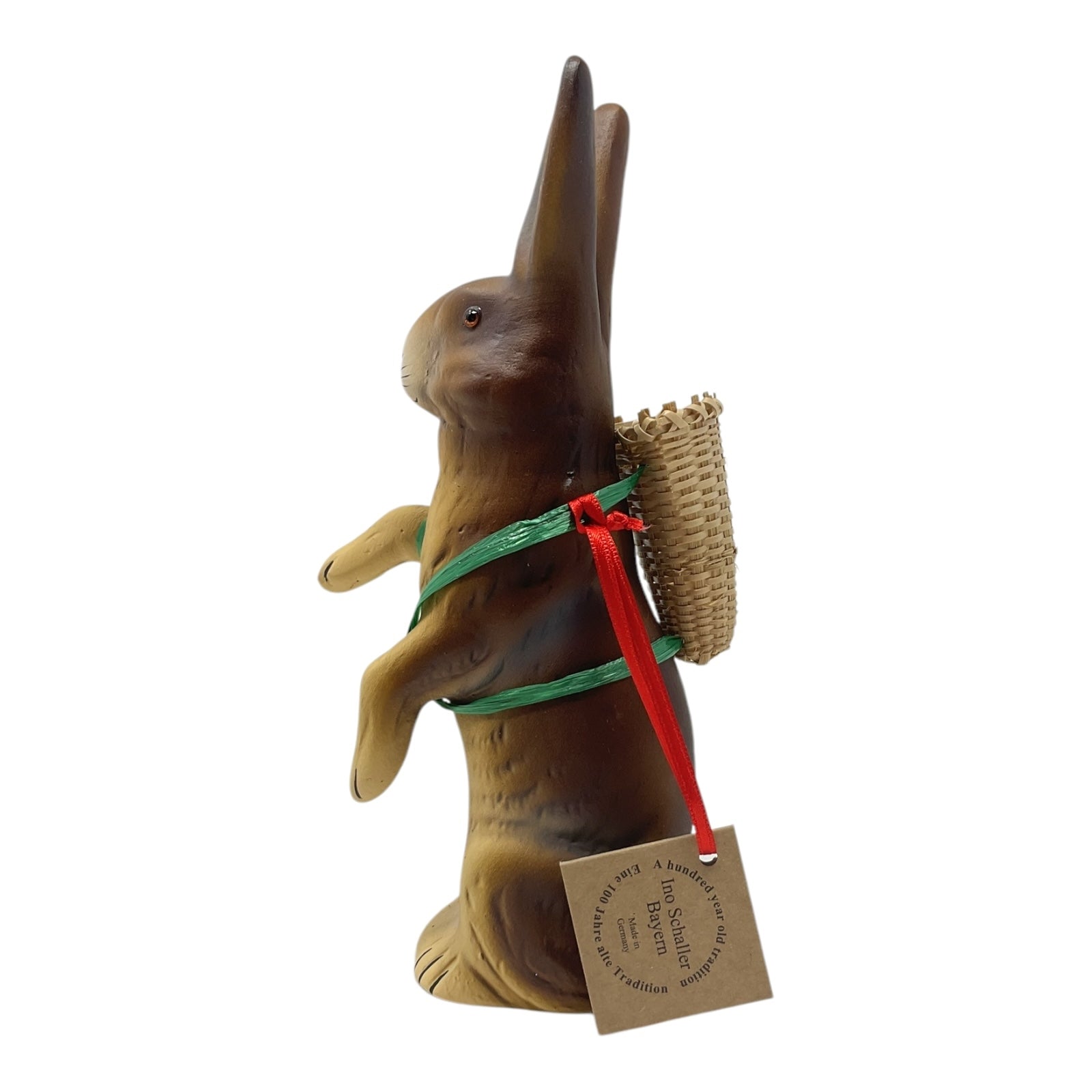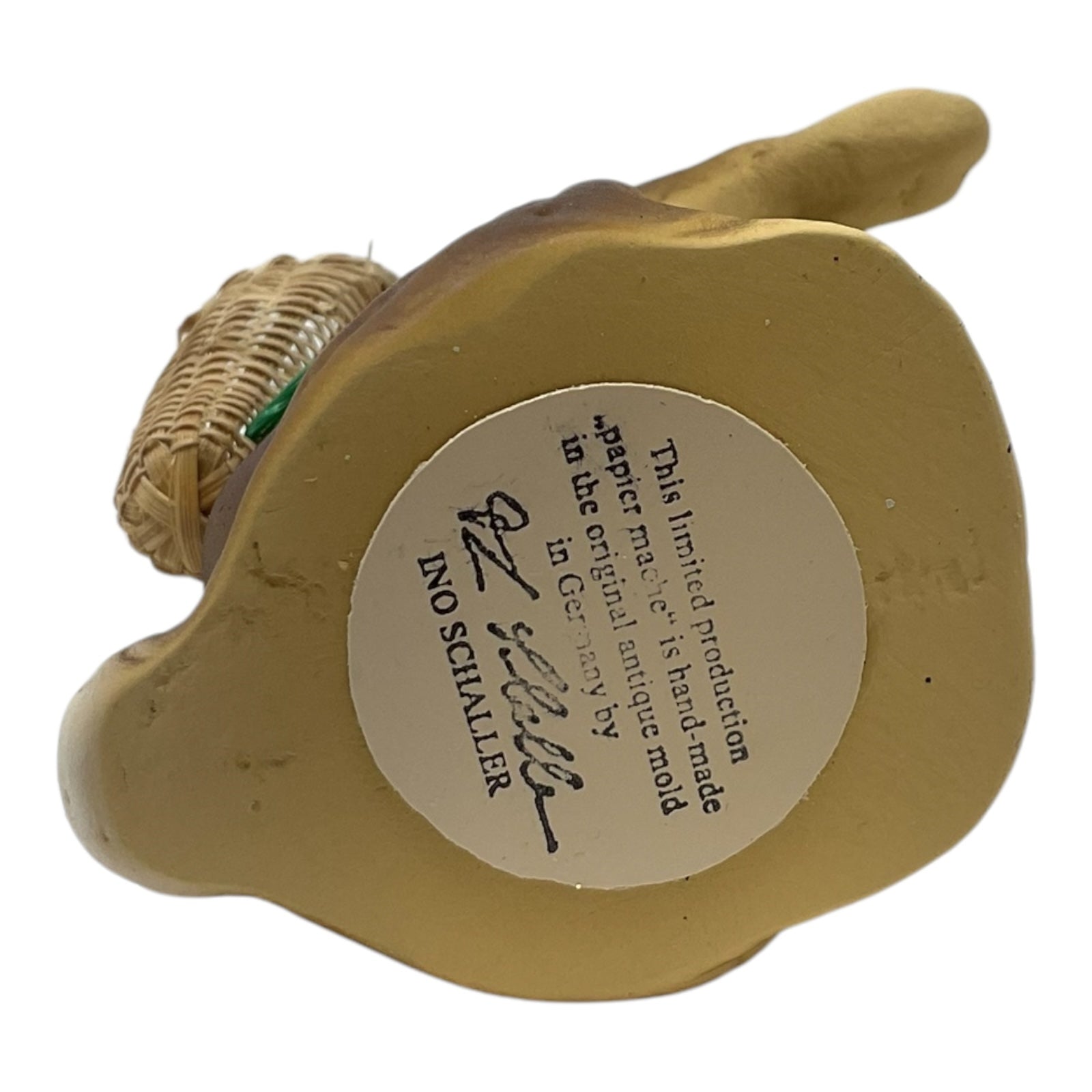 Easter Bunny Rabbit with Wicker Basket Paper Mache. Hand-painted. Made from paper mache. Handcrafted in Bavaria, Germany. Approximately 4.25 x 2.5 x 8.5 inches (11 x 6 x 22 cm). Manufactured for Pinnacle Peak Trading by Ino Schaller. Each piece is signed and stamped on the bottom with the following "This limited production "papier mache" is hand-made in the original antique mold in Germany by INO SCHALLER."