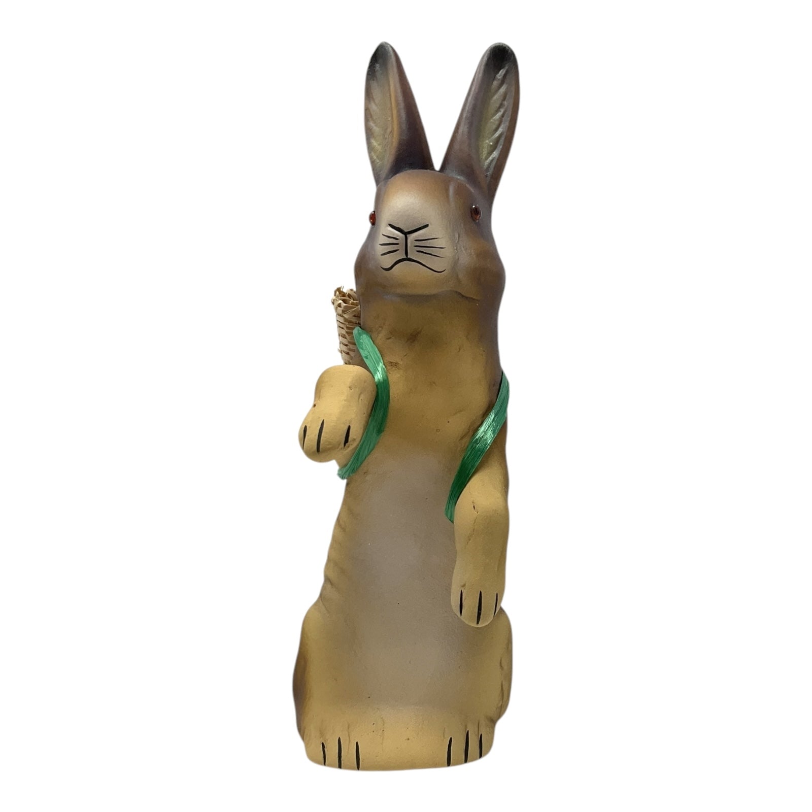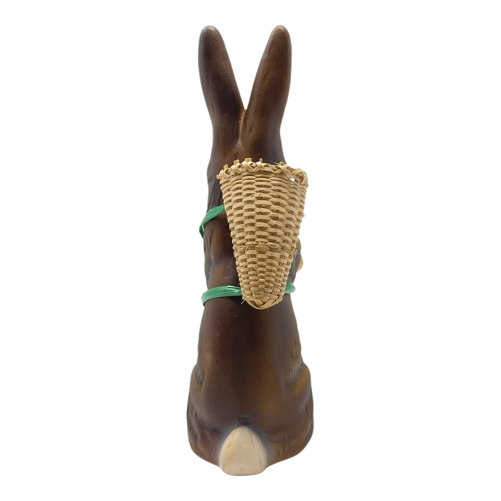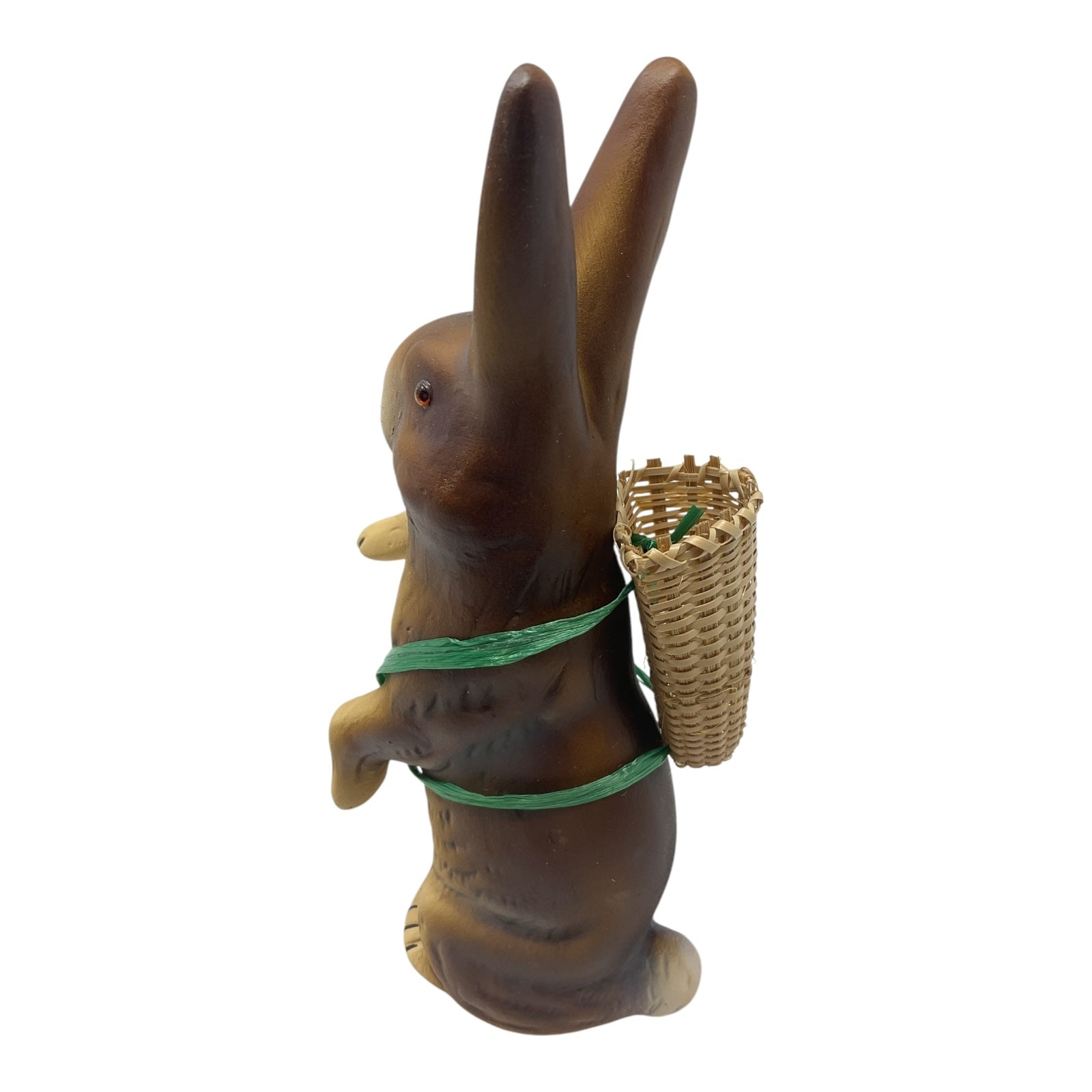 Easter Bunny Rabbit with Wicker Basket Paper Mache. Hand-painted. Made from paper mache. Handcrafted in Bavaria, Germany. Approximately 4.25 x 2.5 x 8.5 inches (11 x 6 x 22 cm). Manufactured for Pinnacle Peak Trading by Ino Schaller. Each piece is signed and stamped on the bottom with the following "This limited production "papier mache" is hand-made in the original antique mold in Germany by INO SCHALLER."
