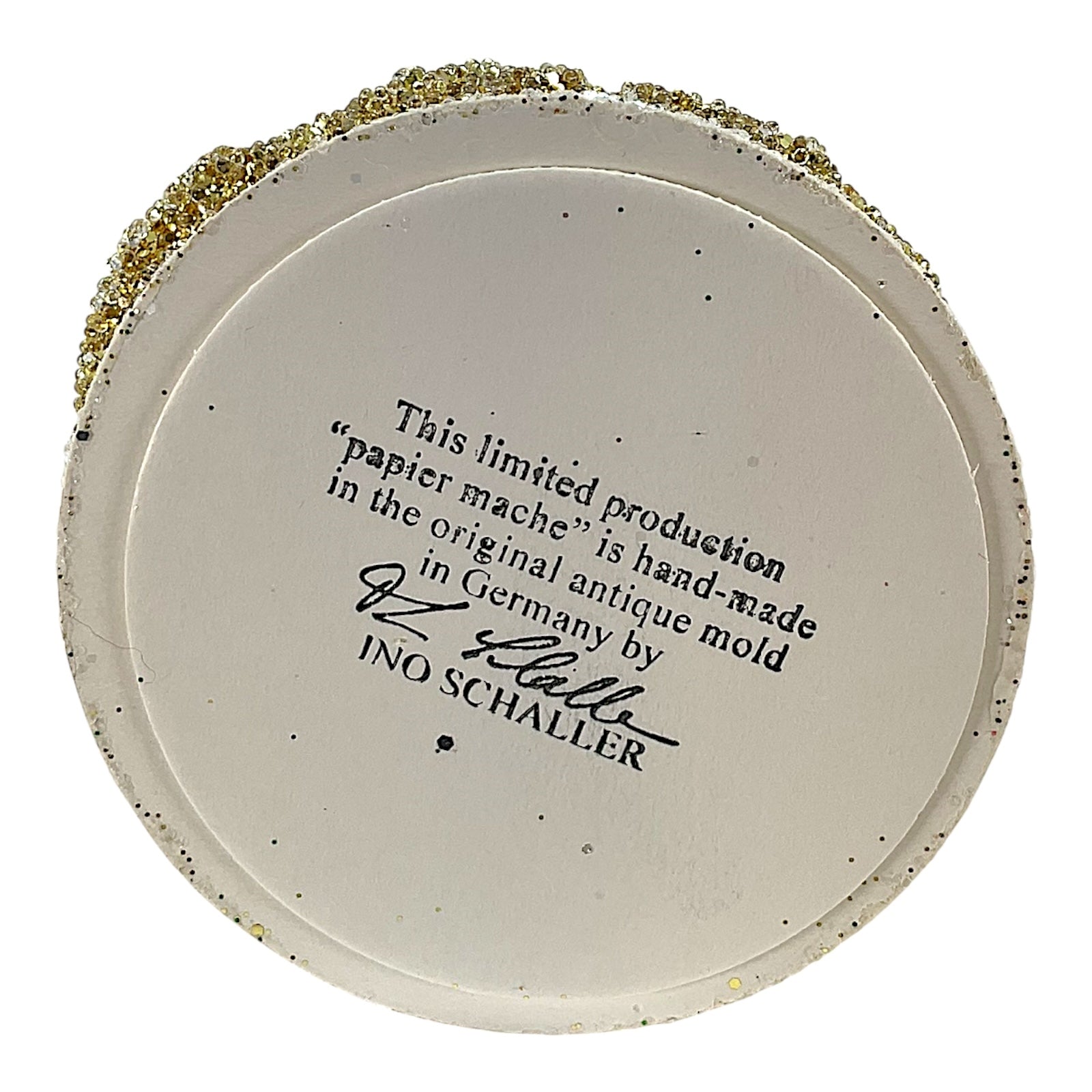 Champagne coat Santa with Russian hat paper mache. Each piece is signed and stamped on the bottom with the following "This limited production "papier mache" is hand-made in the original antique mold in Germany by INO SCHALLER.". Made from Paper Mache and is hand-painted with use of glitter and beads. Handcrafted in Bavaria Germany. Approximately 4.5 x 3.5 x 10.5 inches. Manufactured for Pinnacle Peak Trading by Ino Schaller.
