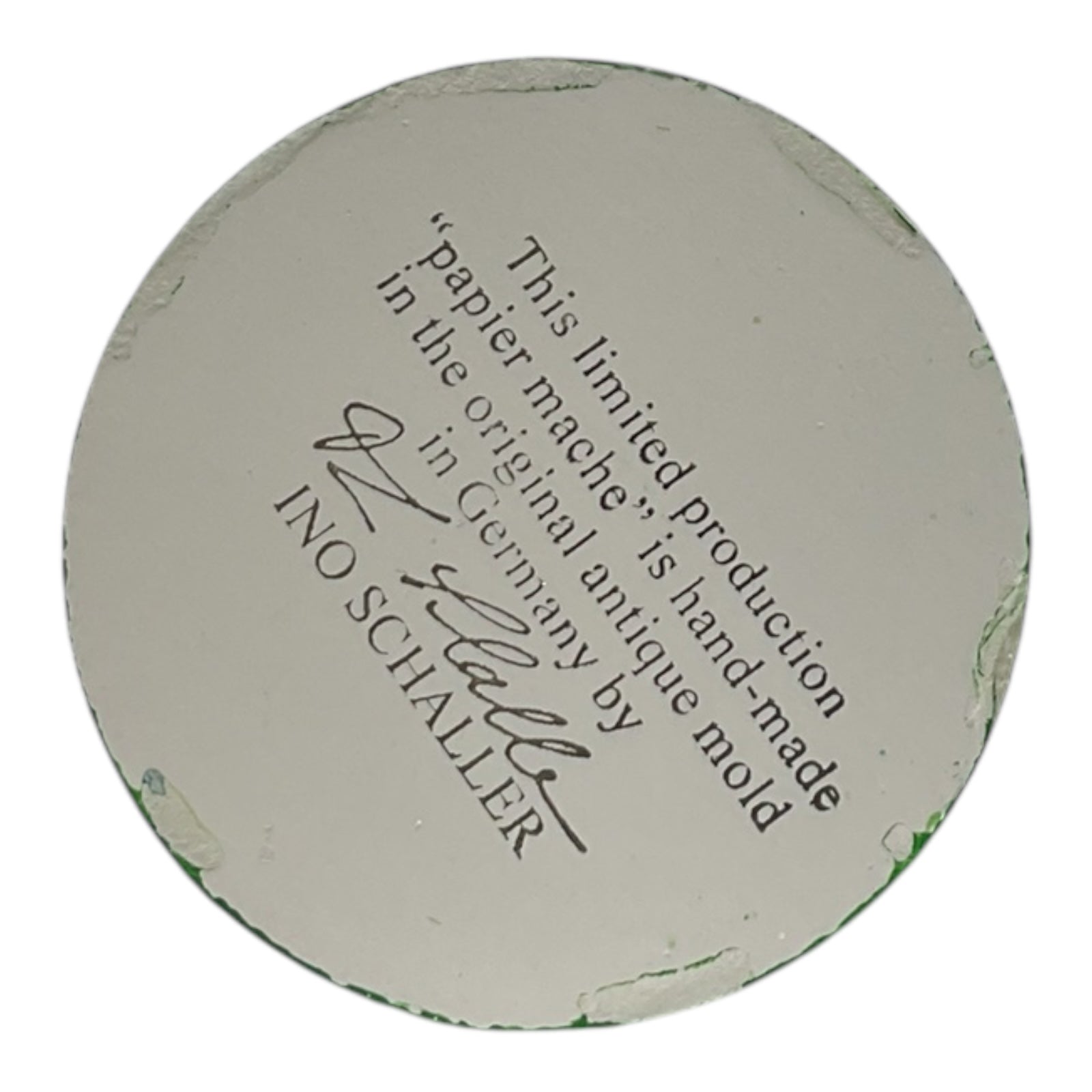 Easter Bunny Rabbit on Orange Egg Paper Mache. Hand-painted. Made from paper mache. Handcrafted in Bavaria, Germany. Approximately 2.75 x 2.75 x 4.25 inches (7 x 7 x 11cm). Manufactured for Pinnacle Peak Trading by Ino Schaller. Each piece is signed and stamped on the bottom with the following "This limited production "papier mache" is hand-made in the original antique mold in Germany by INO SCHALLER."