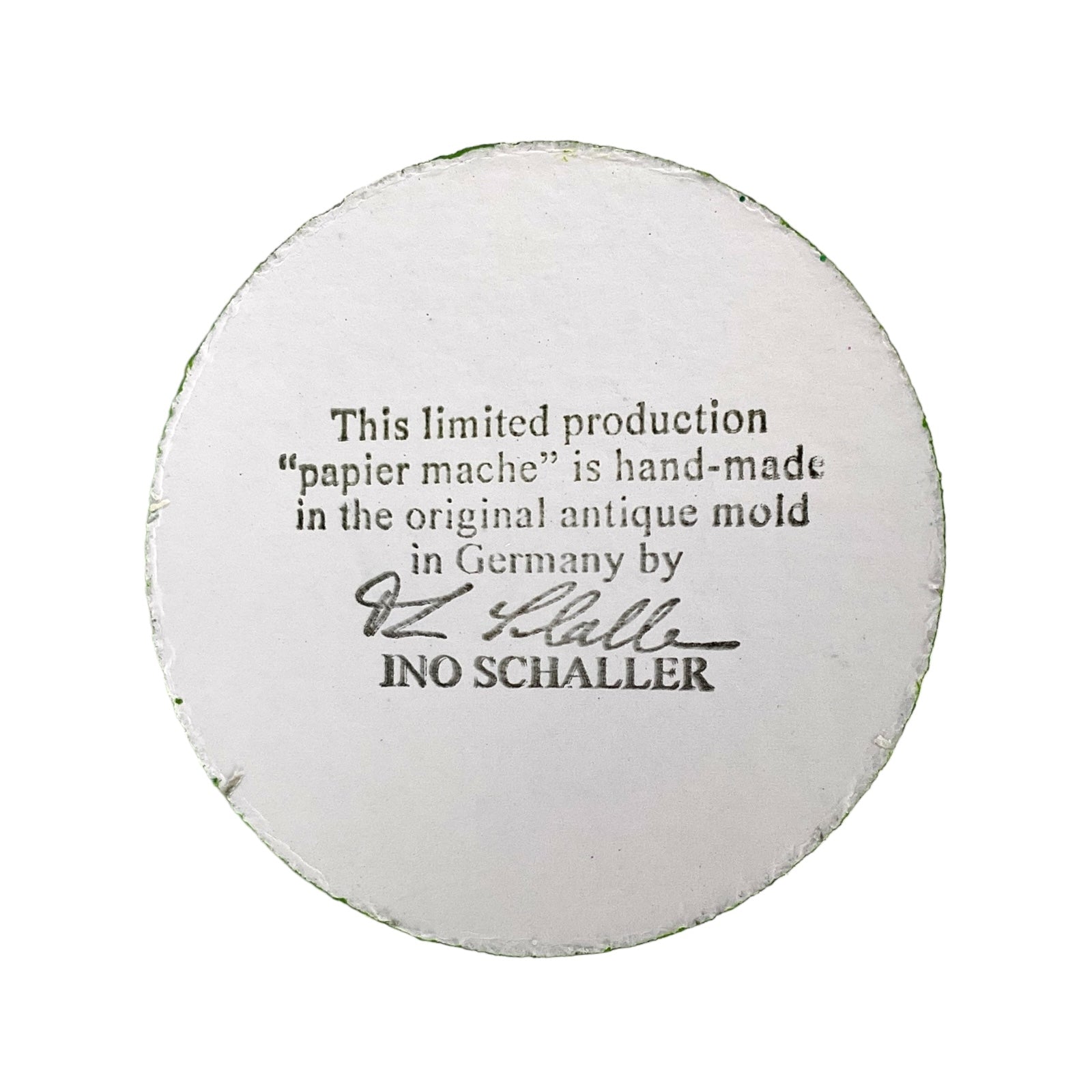 Easter Bunny Rabbit on Purple Egg Paper Mache. Hand-painted. Made from paper mache. Handcrafted in Bavaria, Germany. Approximately 2.75 x 2.75 x 4.25 inches (7 x 7 x 11cm). Manufactured for Pinnacle Peak Trading by Ino Schaller. Each piece is signed and stamped on the bottom with the following "This limited production "papier mache" is hand-made in the original antique mold in Germany by INO SCHALLER."