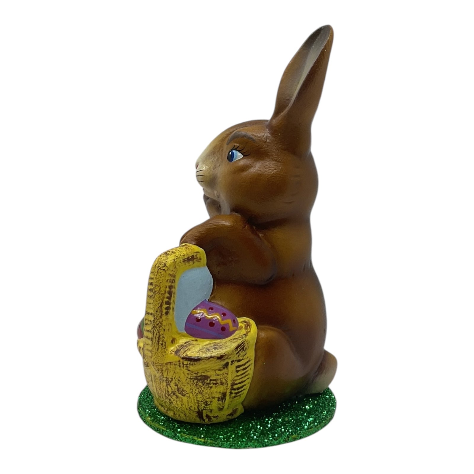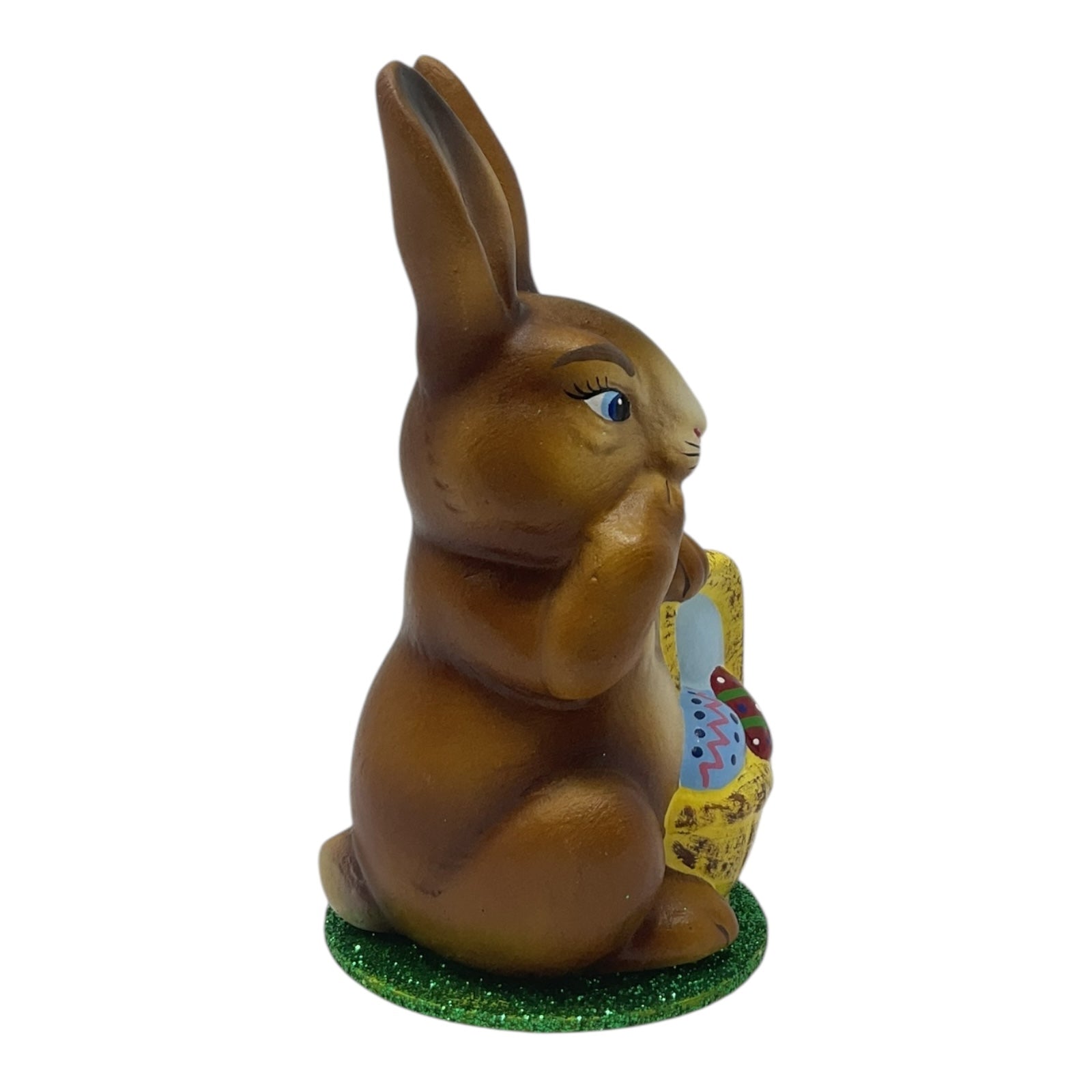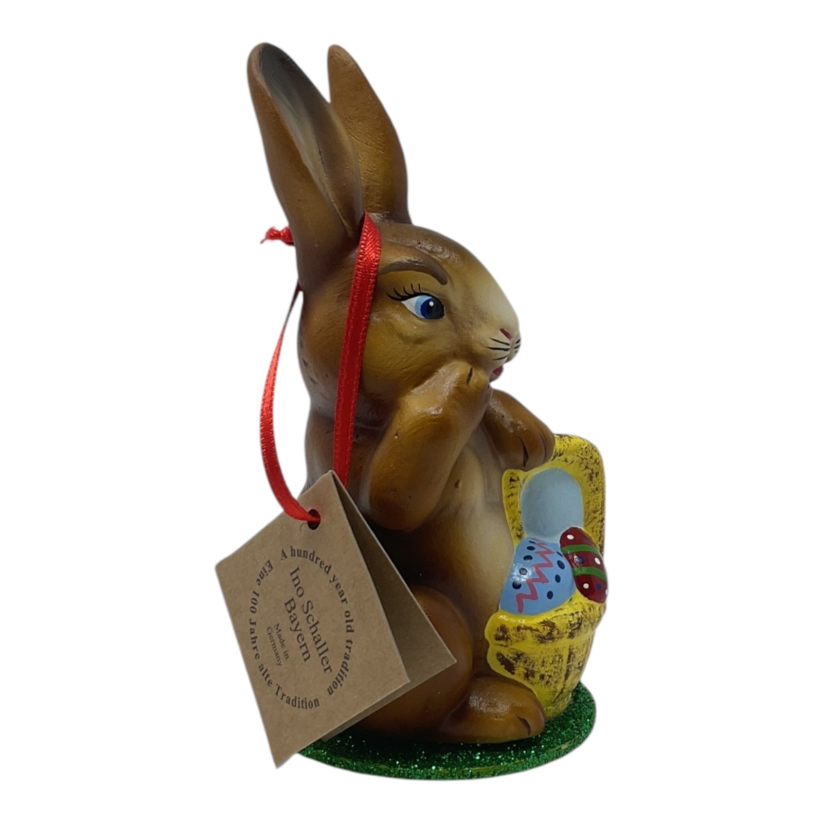 Easter Bunny with Yellow Basket of Eggs Paper Mache. Hand-painted. Made from paper mache. Handcrafted in Bavaria, Germany. Approximately 2.75 x 2.75 x 5.25 inches (7 x 7 x 13 cm). Manufactured for Pinnacle Peak Trading by Ino Schaller. Each piece is signed and stamped on the bottom with the following "This limited production "papier mache" is hand-made in the original antique mold in Germany by INO SCHALLER."