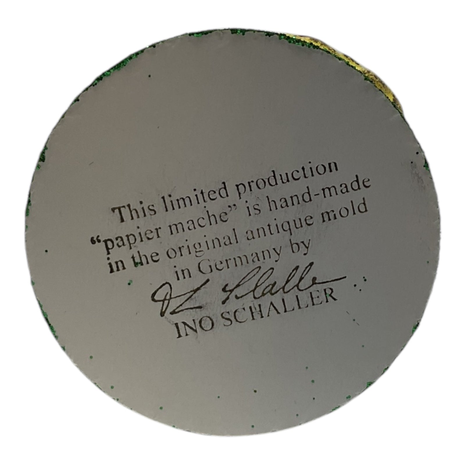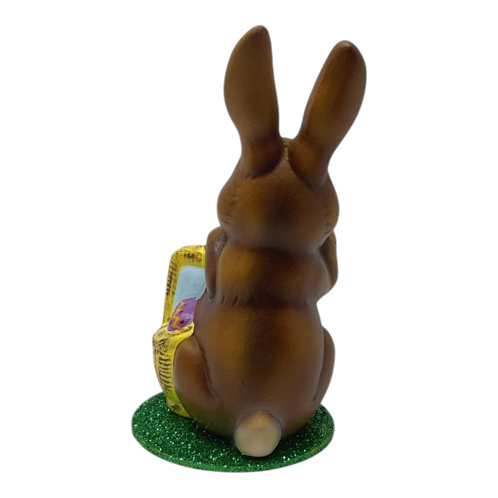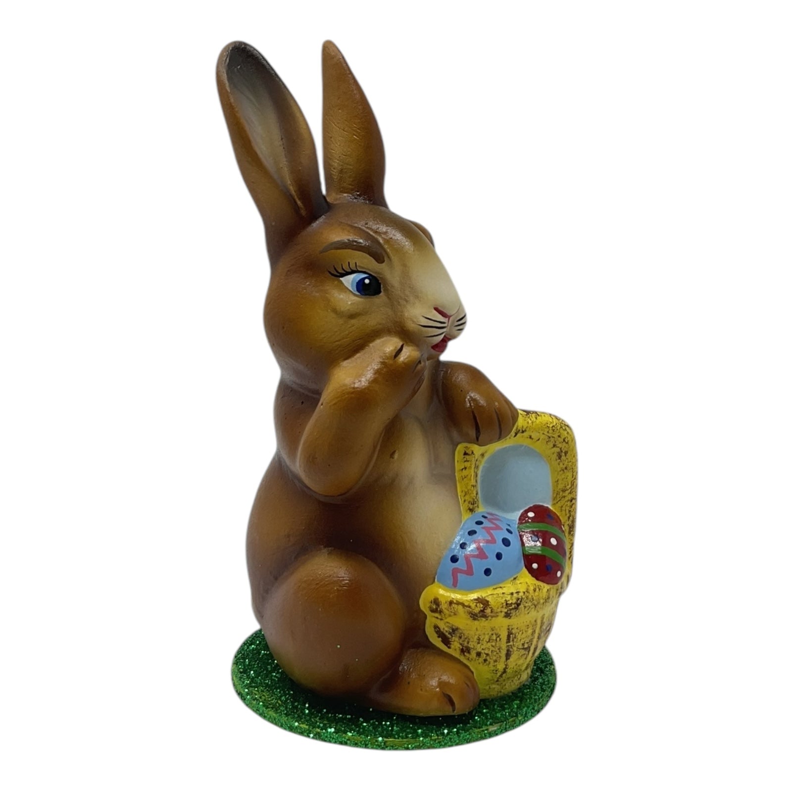 Easter Bunny with Yellow Basket of Eggs Paper Mache. Hand-painted. Made from paper mache. Handcrafted in Bavaria, Germany. Approximately 2.75 x 2.75 x 5.25 inches (7 x 7 x 13 cm). Manufactured for Pinnacle Peak Trading by Ino Schaller. Each piece is signed and stamped on the bottom with the following "This limited production "papier mache" is hand-made in the original antique mold in Germany by INO SCHALLER."