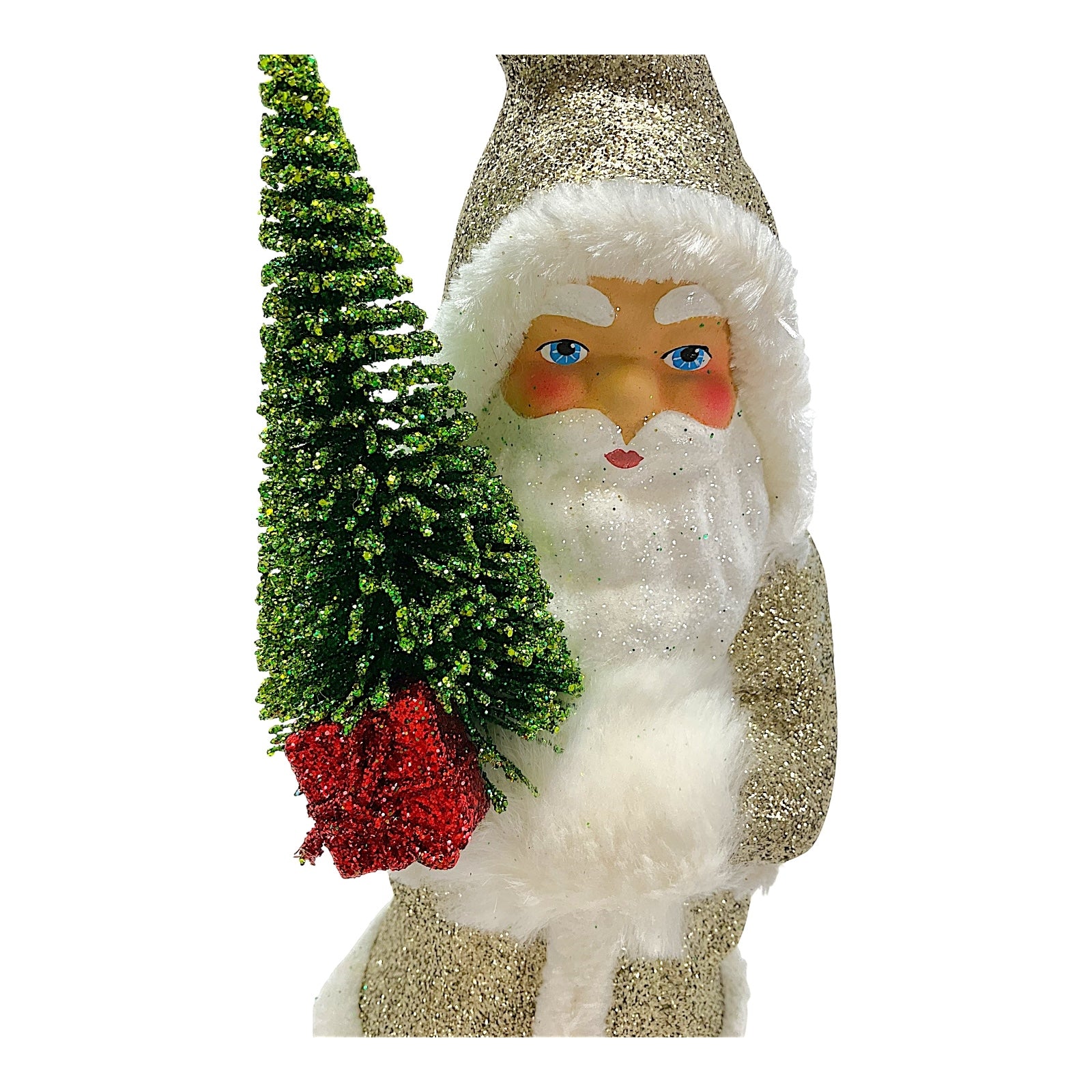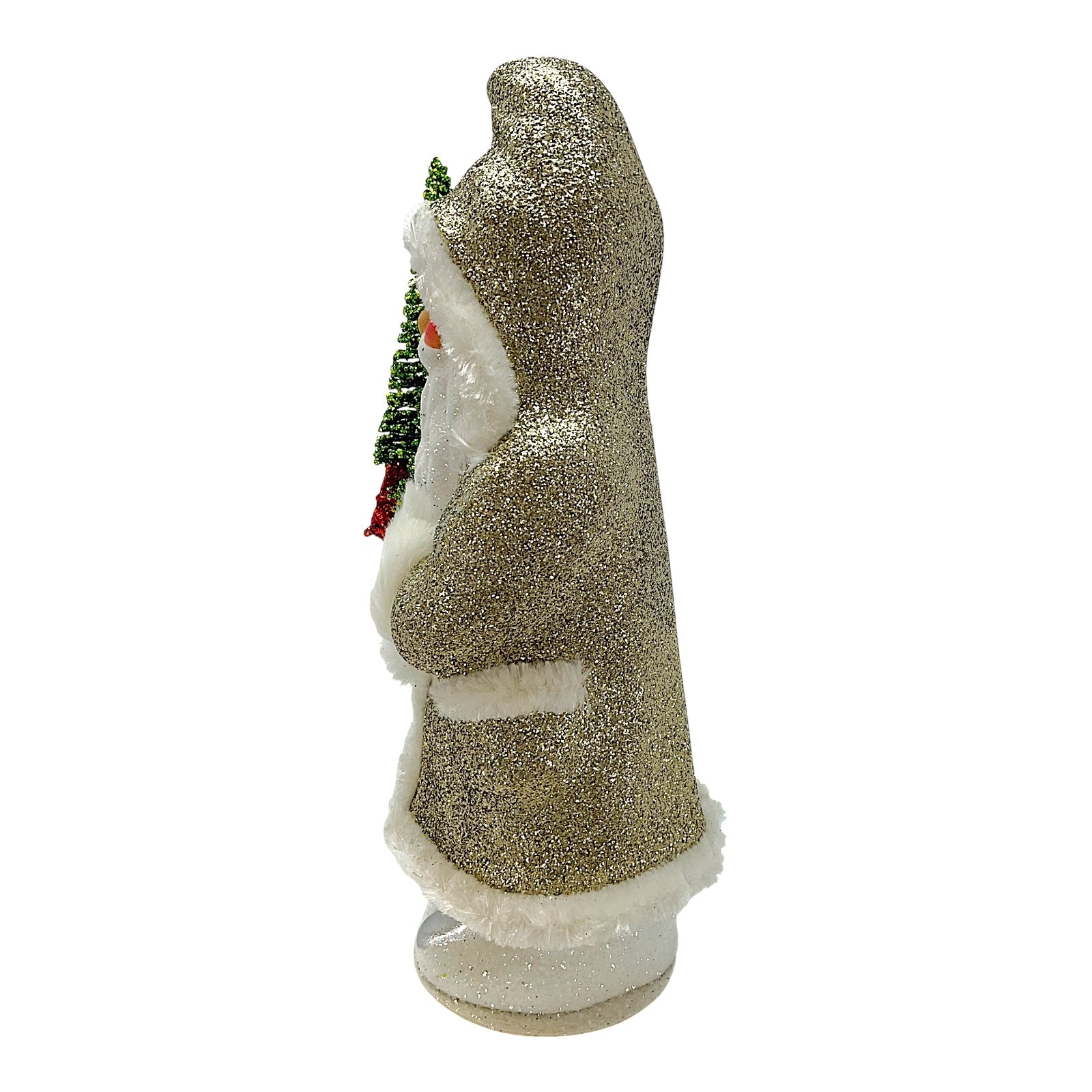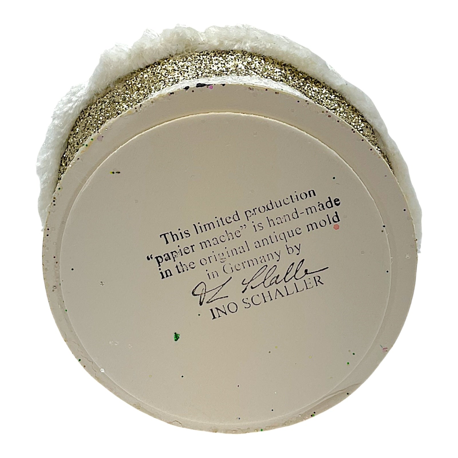 Gold glitter coat Santa paper mache. Each piece is signed and stamped on the bottom with the following "This limited production "papier mache" is hand-made in the original antique mold in Germany by INO SCHALLER.". Made from Paper Mache and is hand-painted with use of glitter. Handcrafted in Bavaria Germany. Approximately 4 x 4 x 11.25 inches. Manufactured for Pinnacle Peak Trading by Ino Schaller.