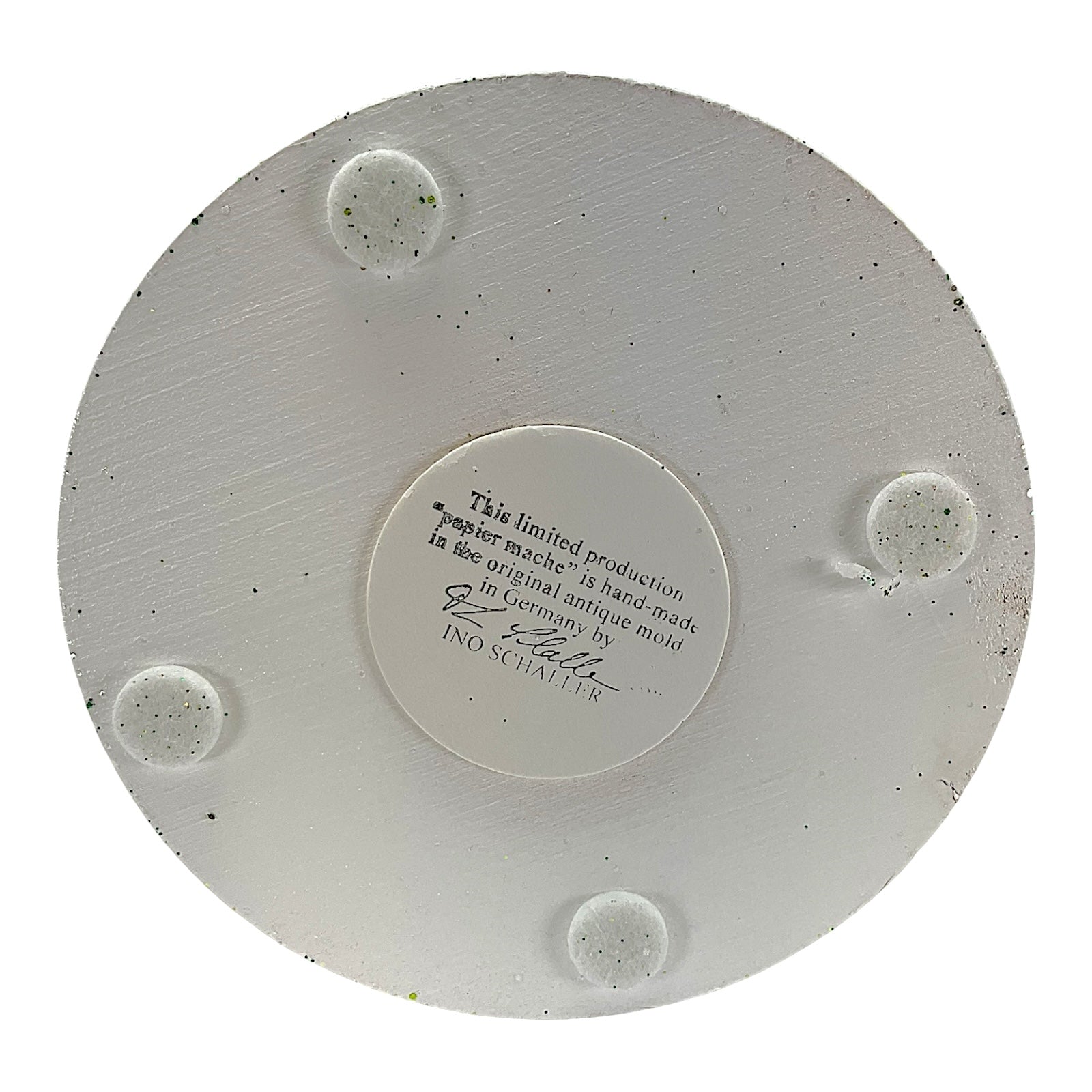 Cream beaded Santa paper mache. Each piece is signed and stamped on the bottom with the following "This limited production "papier mache" is hand-made in the original antique mold in Germany by INO SCHALLER.". Made from Paper Mache and is hand-painted with use of glitter and beads. Handcrafted in Bavaria Germany. Approximately 6.25 x 6.25 x 17 inches. Manufactured for Pinnacle Peak Trading by Ino Schaller.