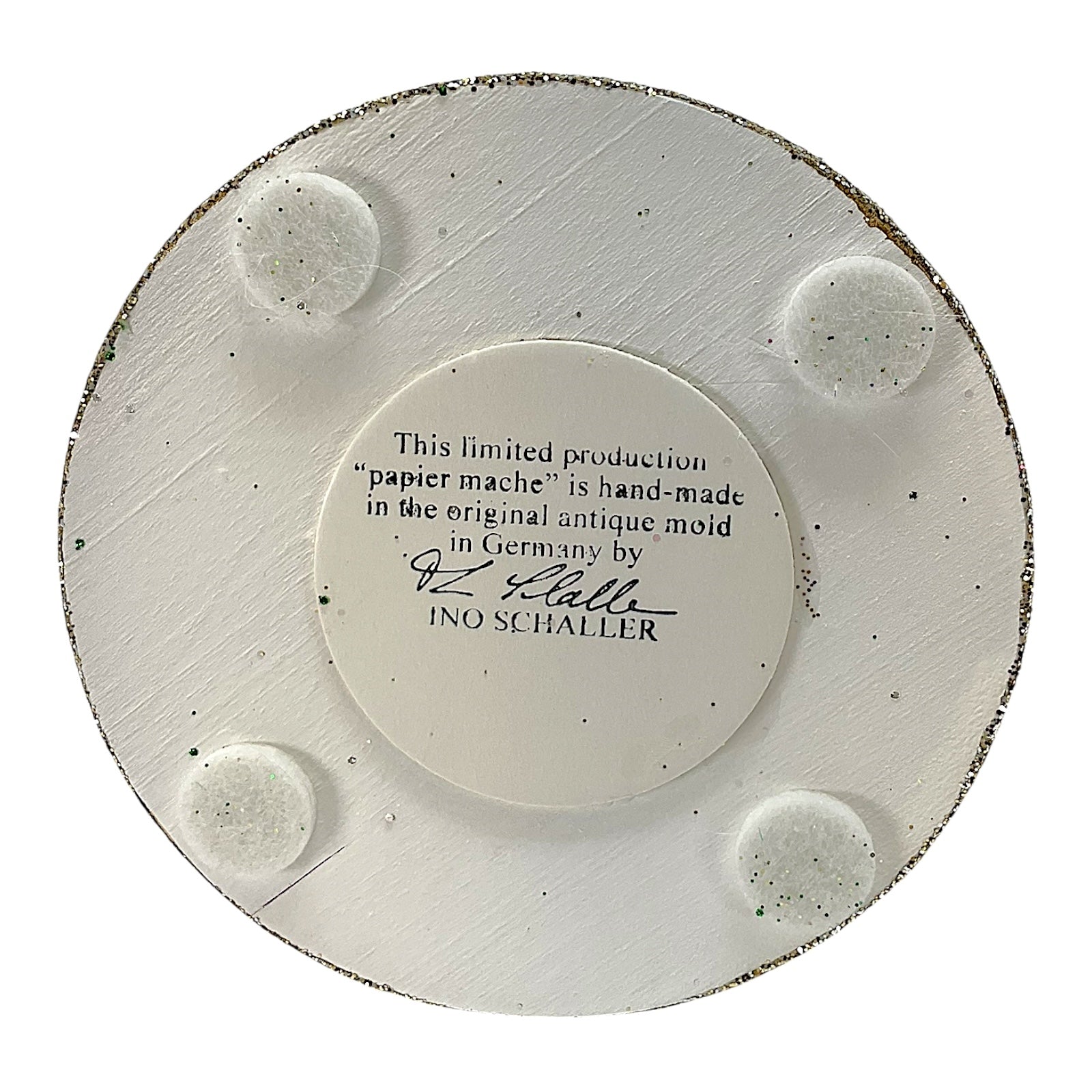 Red coat Santa with snowman scene paper mache. Each piece is signed and stamped on the bottom with the following "This limited production "papier mache" is hand-made in the original antique mold in Germany by INO SCHALLER.". Made from Paper Mache and is hand-painted with use of glitter. Handcrafted in Bavaria Germany. Approximately 4.75 x 4.75 x 11.5 inches. Manufactured for Pinnacle Peak Trading by Ino Schaller.