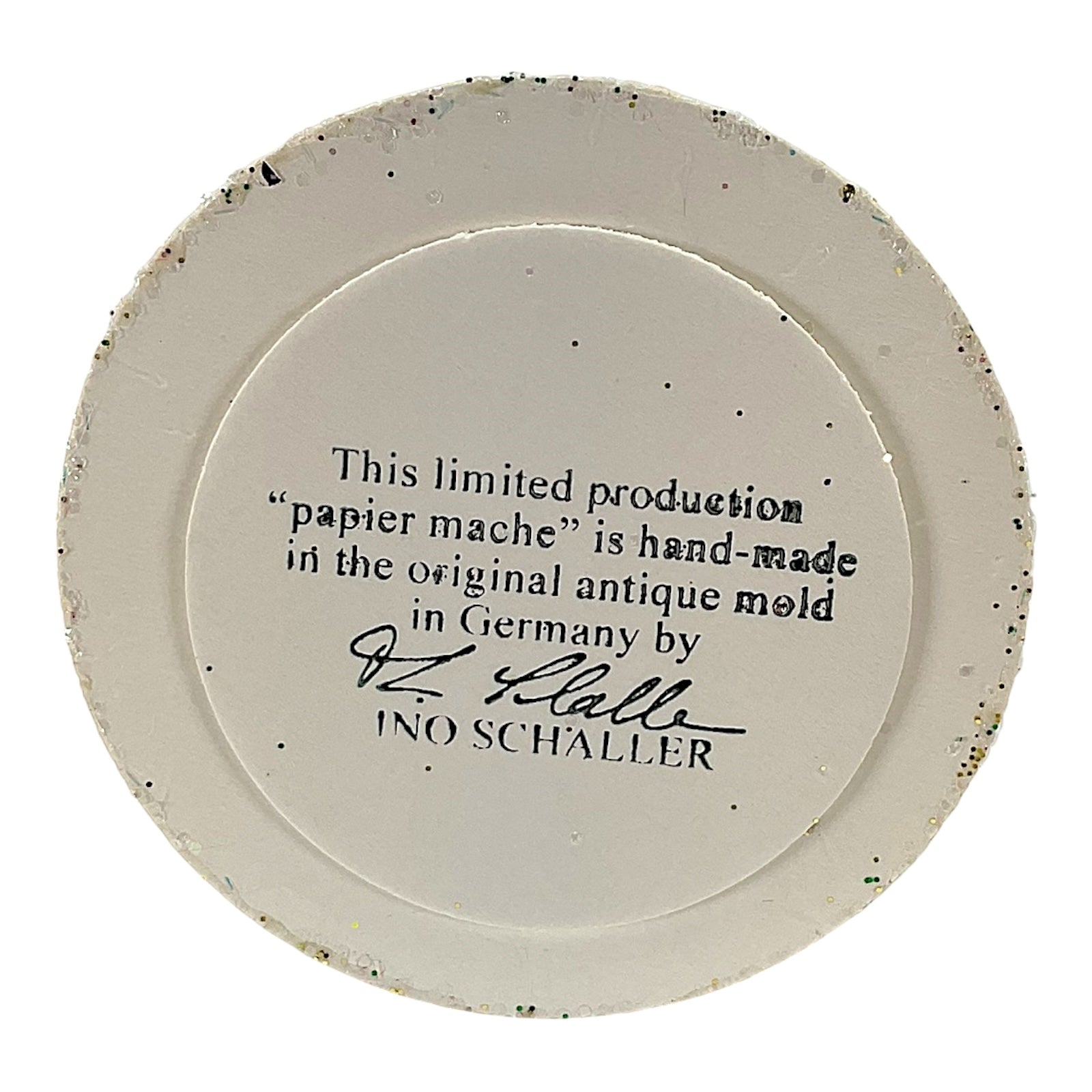 White beaded Santa Claus paper mache. Each piece is signed and stamped on the bottom with the following "This limited production "papier mache" is hand-made in the original antique mold in Germany by INO SCHALLER.". Made from Paper Mache and is hand-painted with use of glitter and beads. Handcrafted in Bavaria Germany. Approximately 3.25 x 3.1 x 10.5 inches. Manufactured for Pinnacle Peak Trading by Ino Schaller.