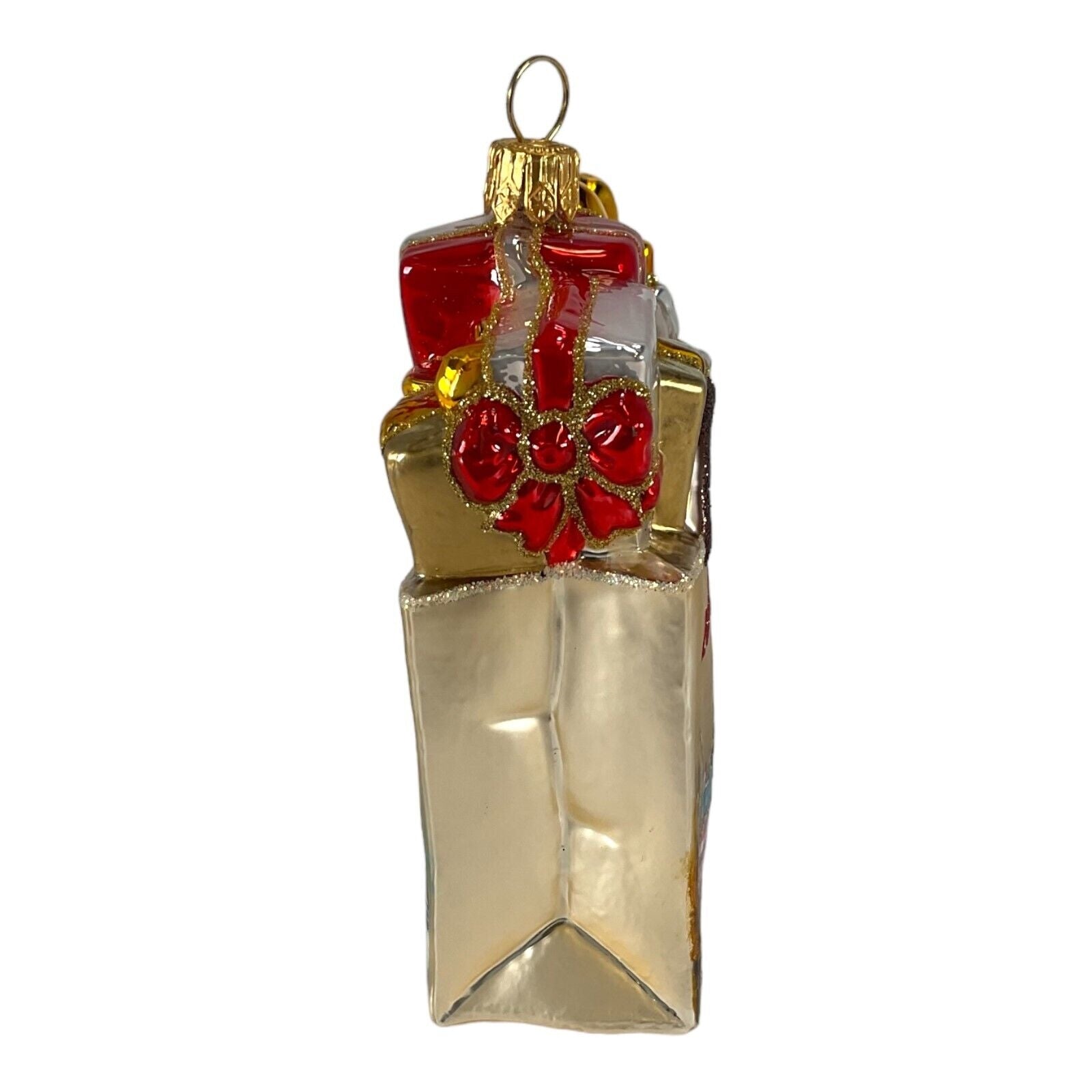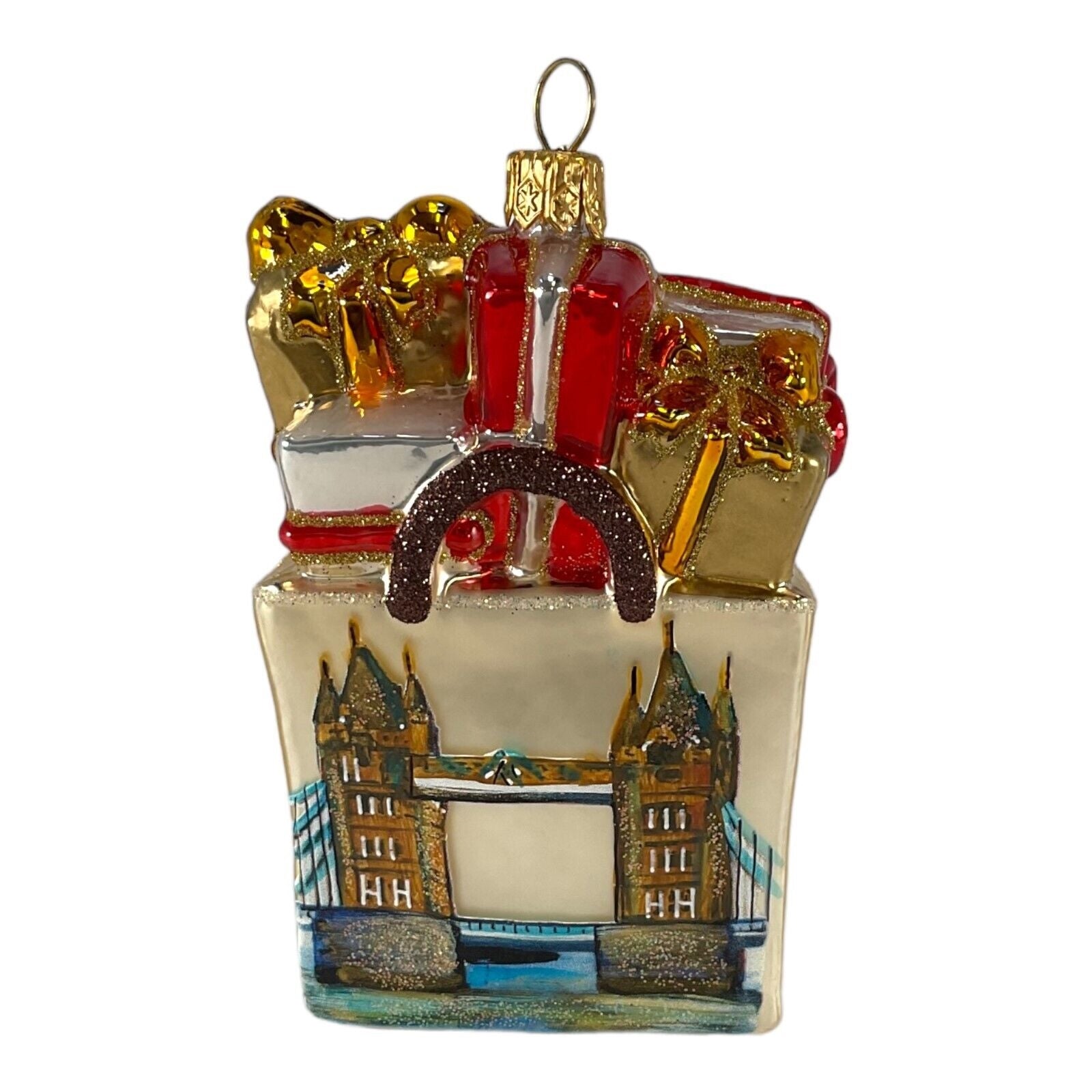 London Shopping Bag Ornament. Handcrafted in Poland. Hand-painted by Polish artisans. Made from mouth blown glass. Approximately 4 inches tall (10 cm). Includes ONE ornament - picture shows the front and back of one ornament. Includes original Pinnacle Peak Trading box and packaging. Imported by Pinnacle Peak Trading Company.