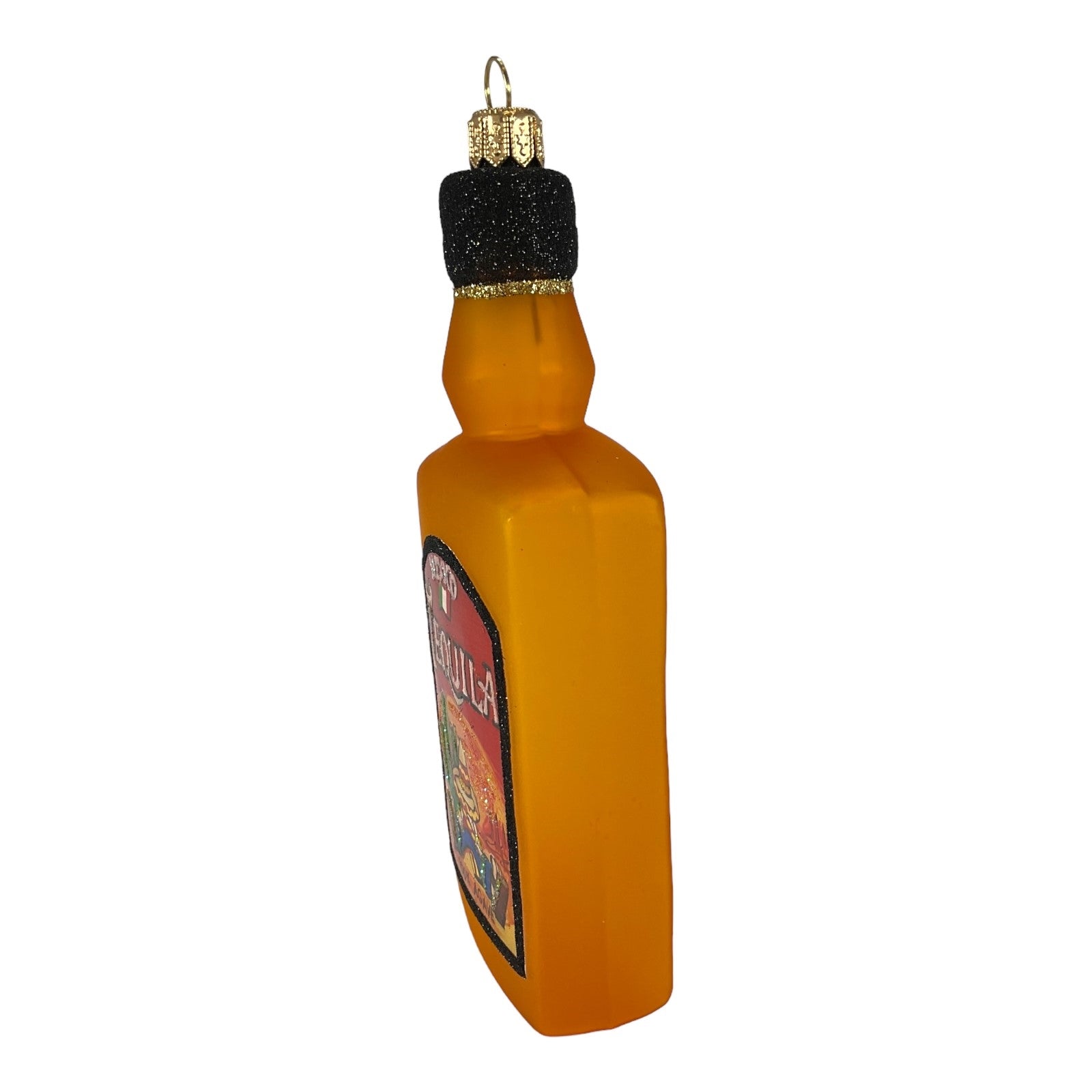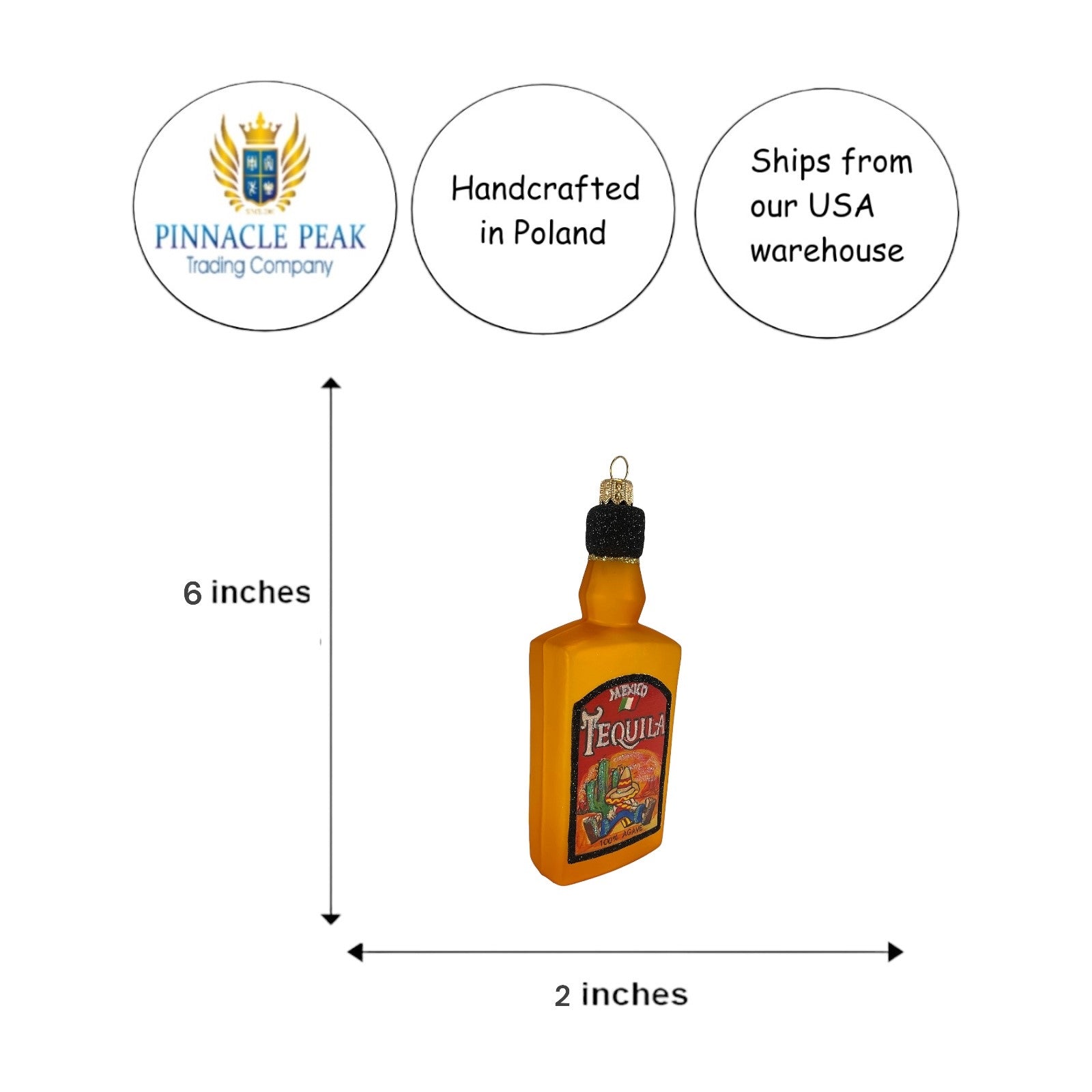 Tequila Bottle Ornament. Made in Poland. Mouth blown and hand painted. Made from glass. Approximately 6 inches tall. Includes original Pinnacle Peak Trading box and packaging. Imported by Pinnacle Peak Trading Company.