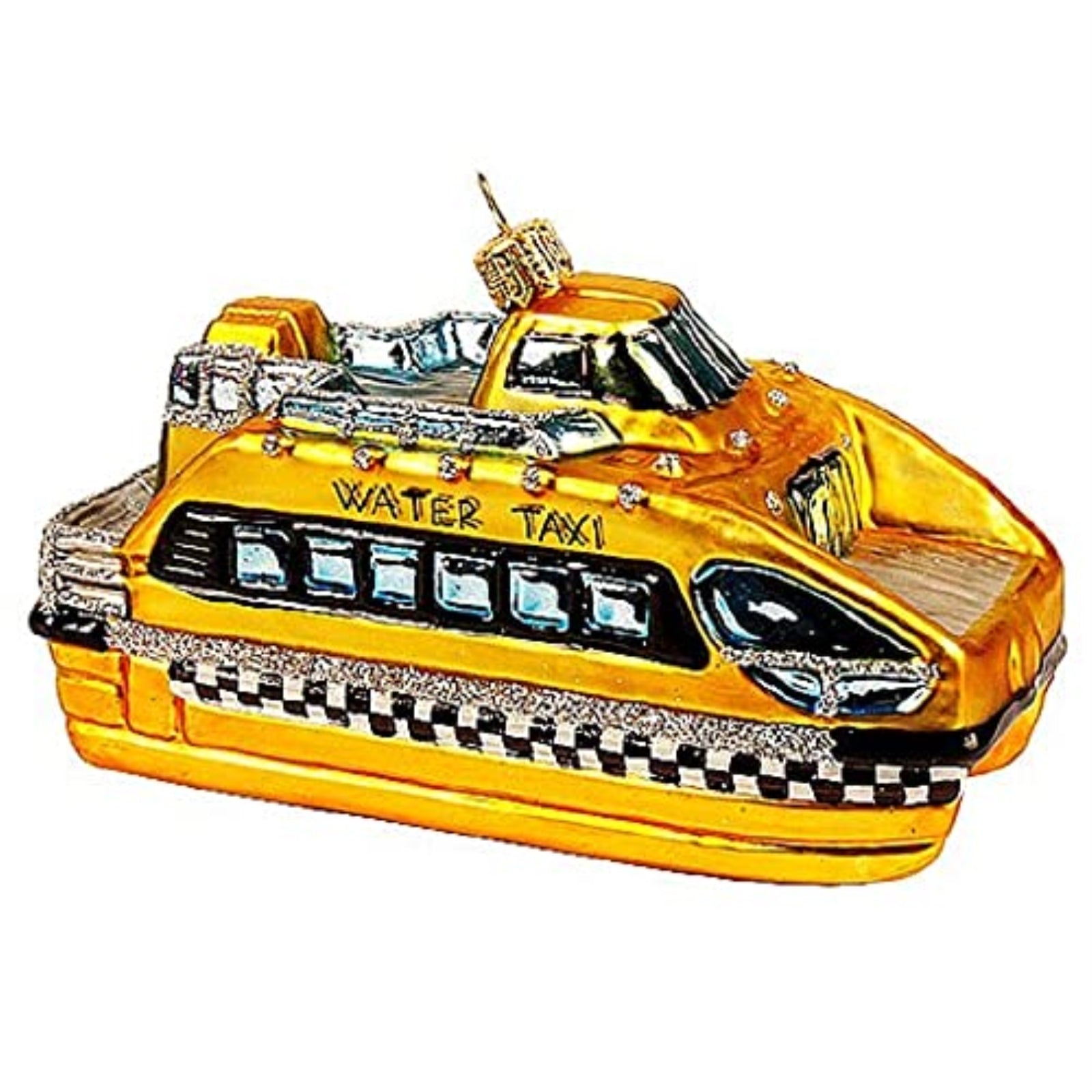 NYC Water Taxi Ornament. Handcrafted in Poland. Hand-painted by Polish artisans. Made from mouth blown glass. Approximately 4.6 inches long, 2.6 inches tall, and 1.8 inches wide. Includes original Pinnacle Peak Trading box and packaging. Imported by Pinnacle Peak Trading Company.