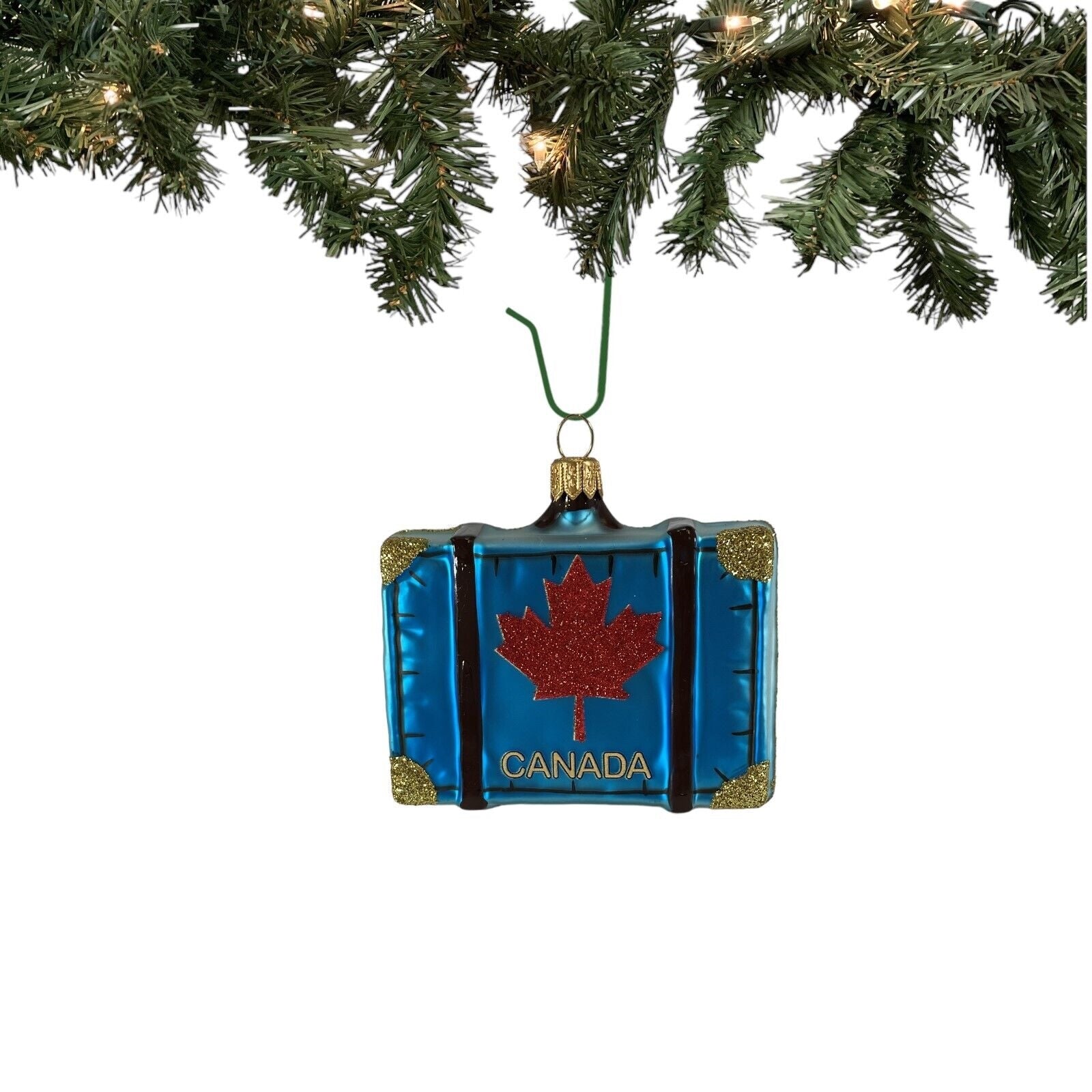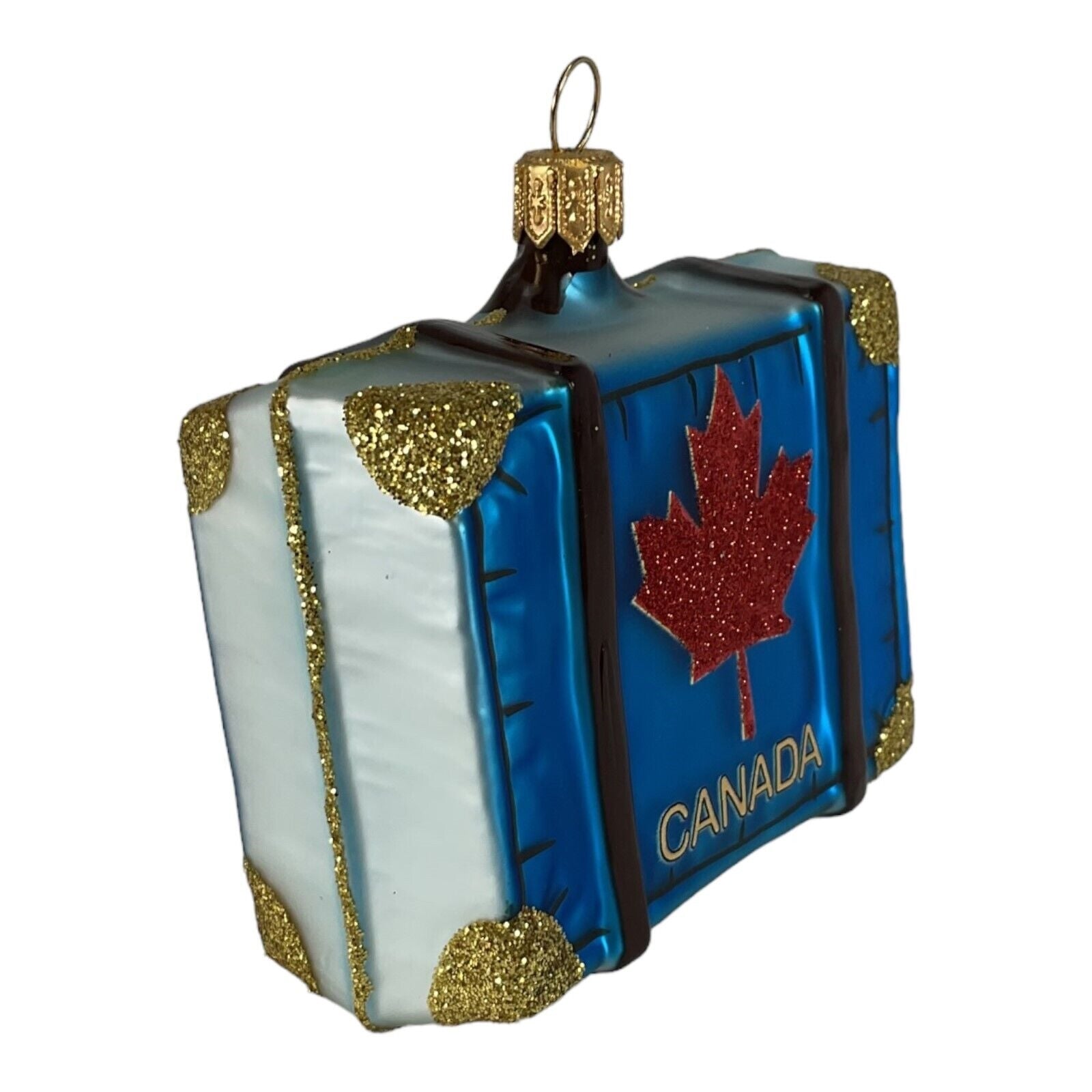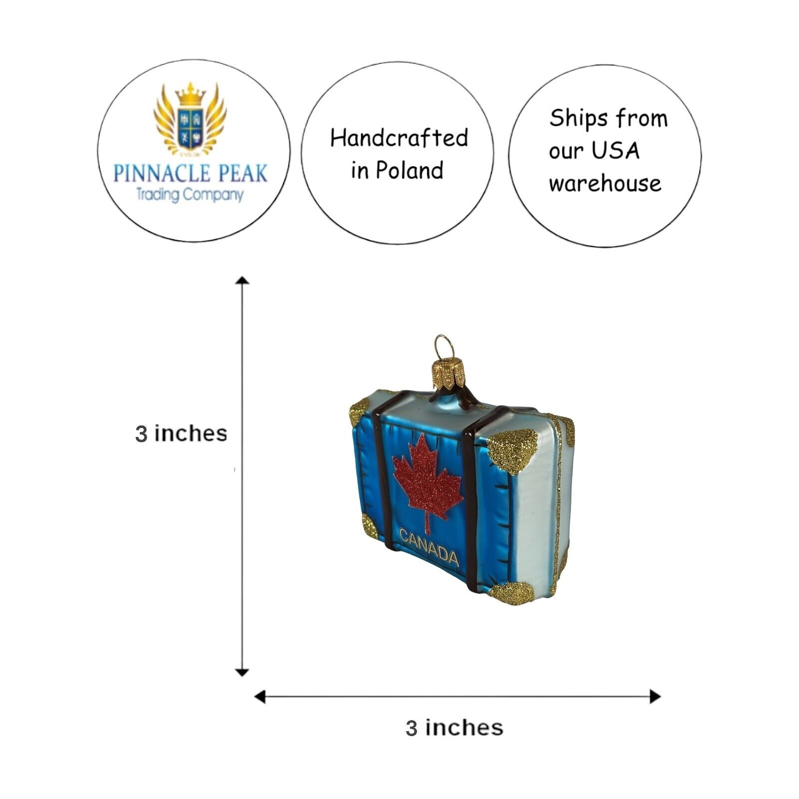 Canada Travel Suitcase Ornament. Handcrafted in Poland. Hand-painted by Polish artisans. Made from mouth blown glass. Approximately 3 inches long (8 cm). Comes packaged in a gift box. Includes ONE ornament - picture shows front and back of one ornament. Imported by Pinnacle Peak Trading Company.