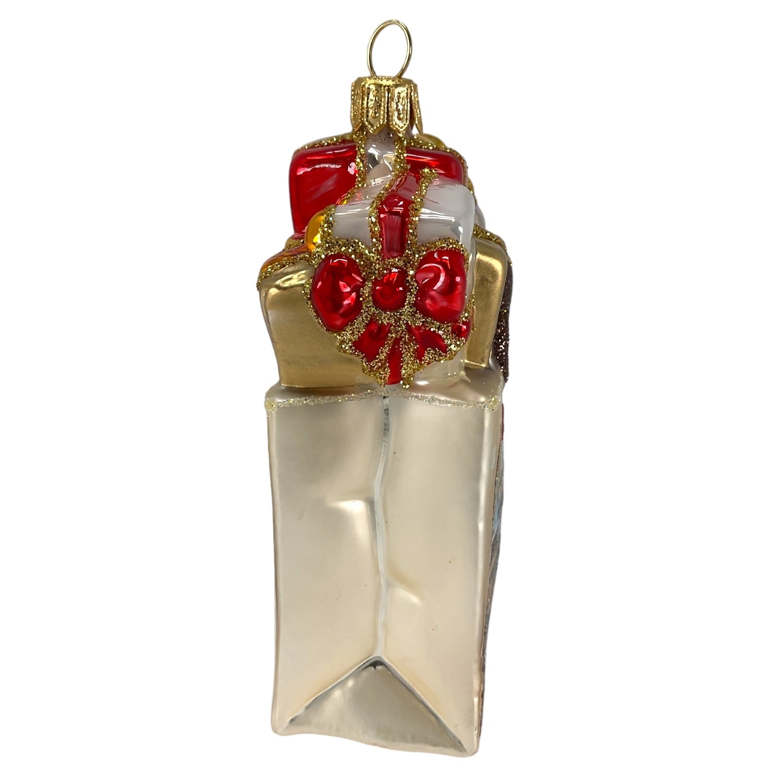 Paris Shopping Bag Ornament. Handcrafted in Poland. Hand-painted by Polish artisans. Made from mouth blown glass. Approximately 2.2 inches wide, 3.5 inches tall, and 1.2 inches deep. Includes original Pinnacle Peak Trading box and packaging. Imported by Pinnacle Peak Trading Company.
