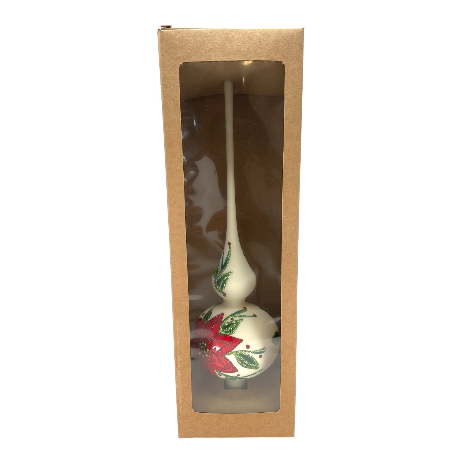 White Poinsettia Finial Tree Topper. Made in Poland. Made from glass. Approximately 3.5 x 3.5 x 14.5 inches (9 x 9 x 37cm). High quality European tree topper from Pinnacle Peak Trading.
