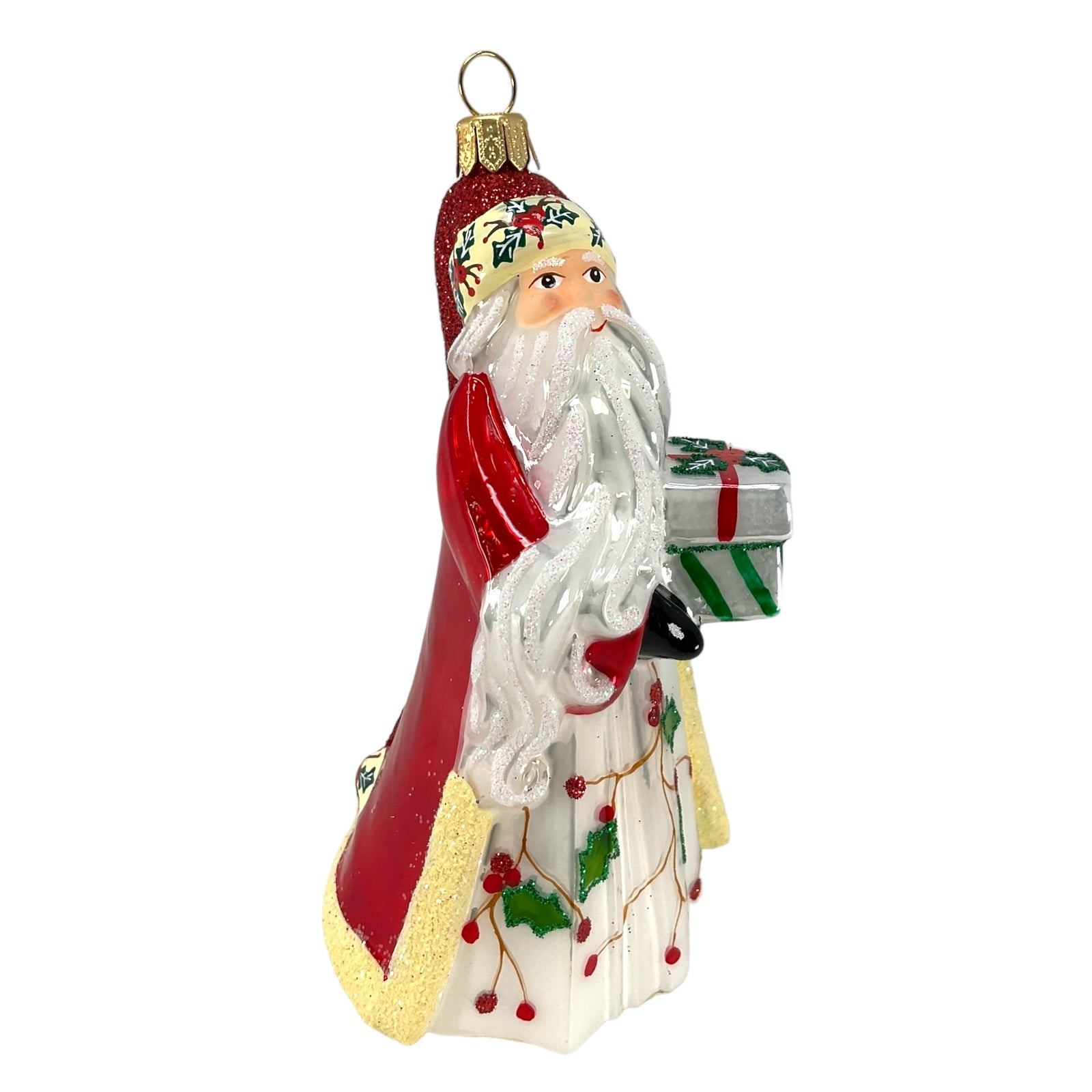 Poinsettia Santa Claus Holding Presents Ornament. Handcrafted in Poland. Made from mouth blown glass. Hand-painted. Approximately 2.75 x 2.25 x 5 inches (7 x 6 x 13cm). High quality European ornament from Pinnacle Peak Trading.