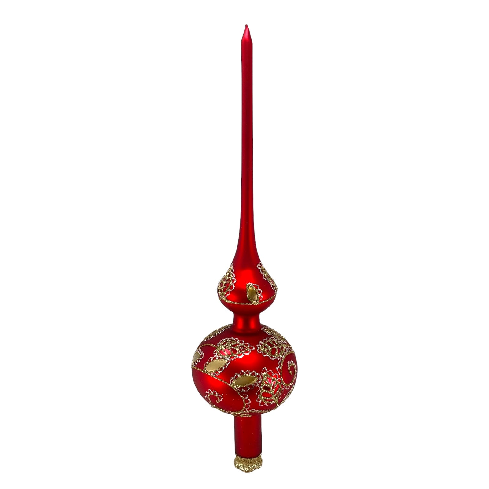 Red with Gold Glitter Leaf Design Finial Tree Topper. Made in Poland. Made from glass. Approximately 3.5 x 3.5 x 14.5 inches (9 x 9 x 37cm). High quality European tree topper from Pinnacle Peak Trading.