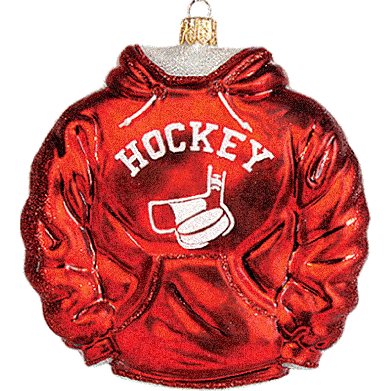 Hockey Hoodie Ornament. Handcrafted in Poland. Hand-painted by Polish artisans. Made from mouth blown glass. Approximately 4 inches tall (10 cm). Includes original manufacturers box and packaging. Imported by Pinnacle Peak Trading Company.